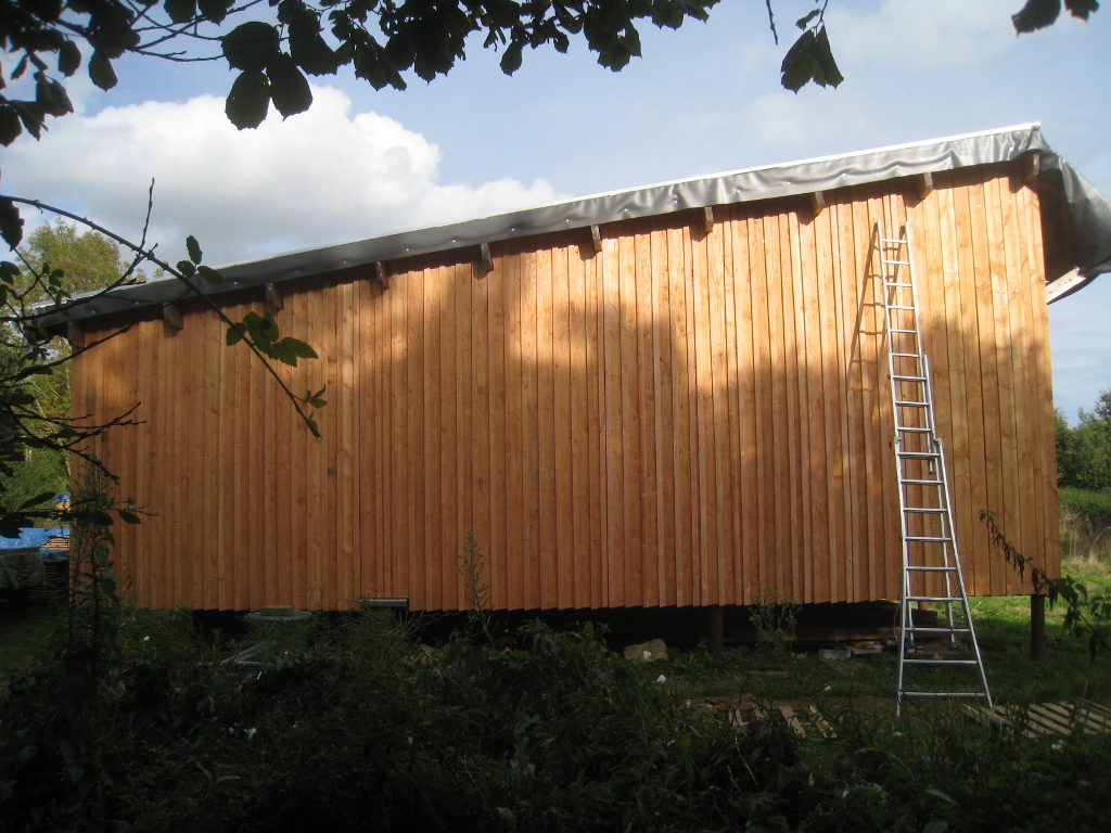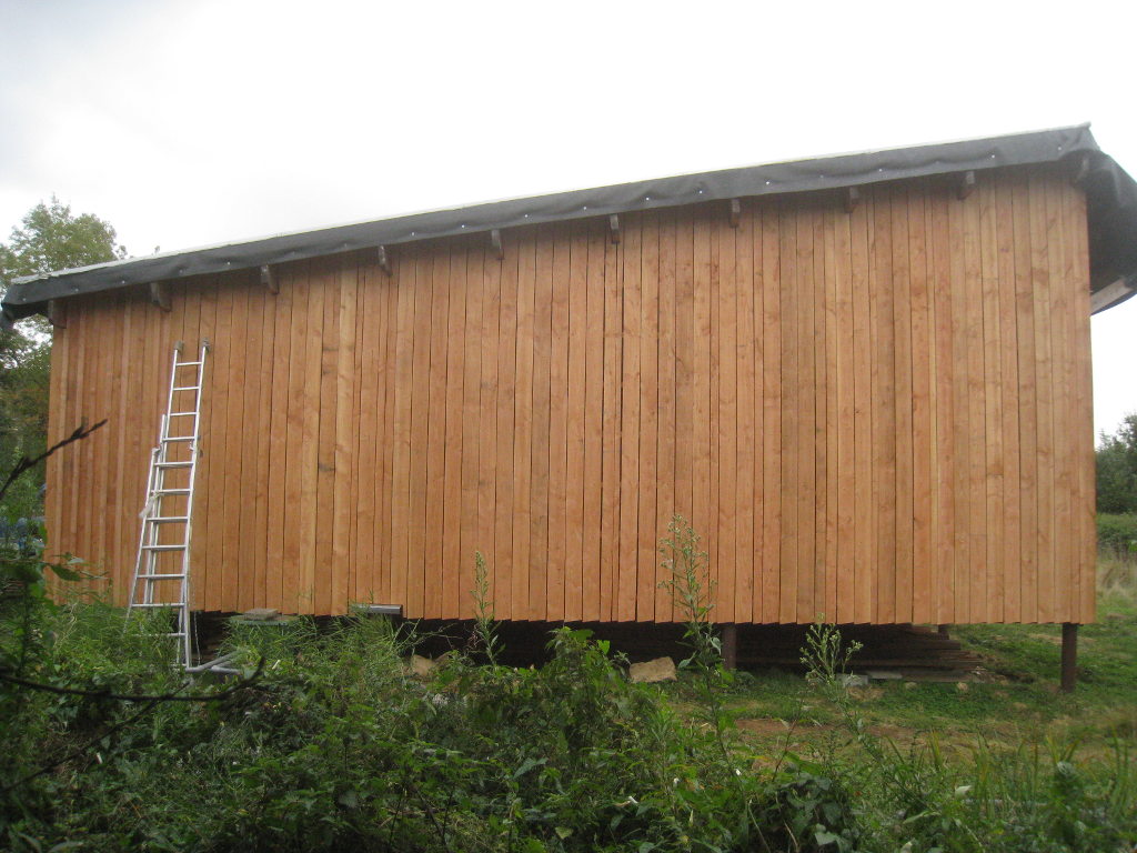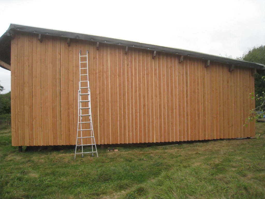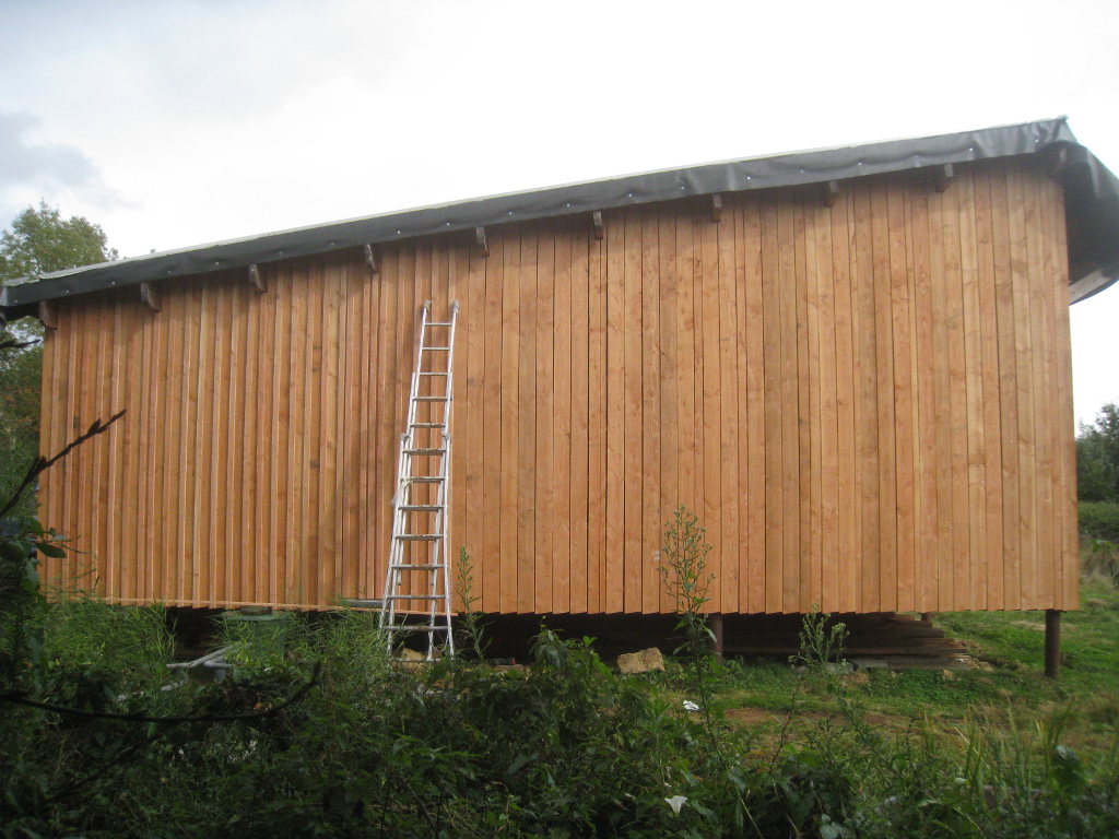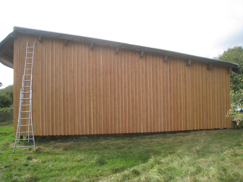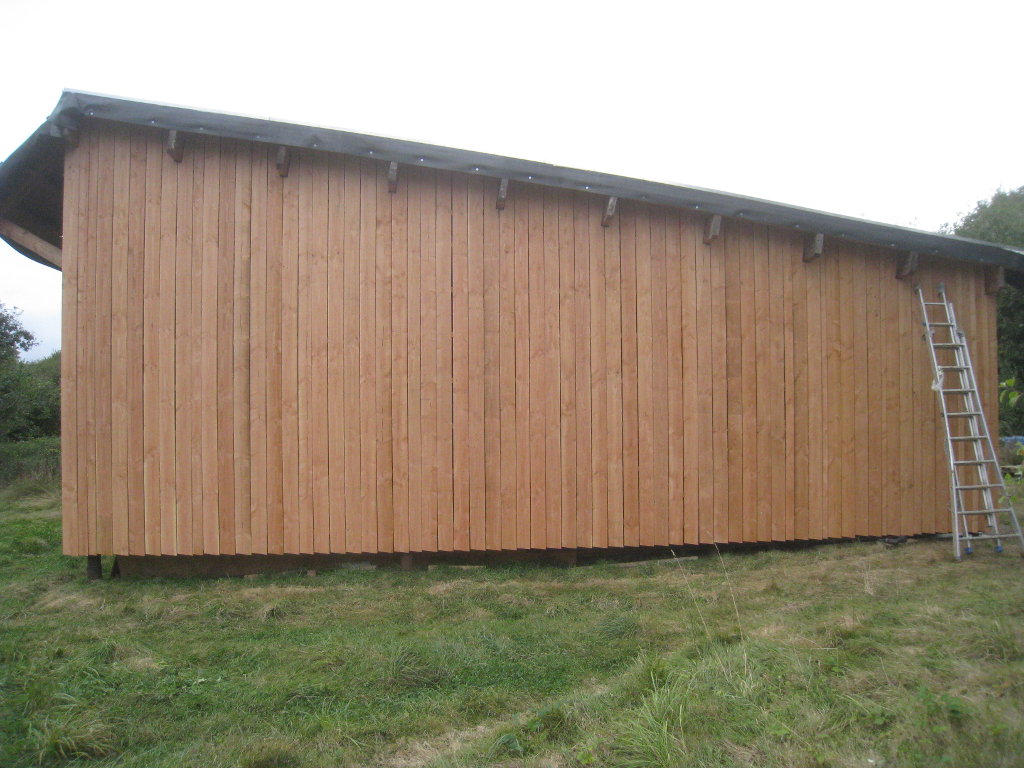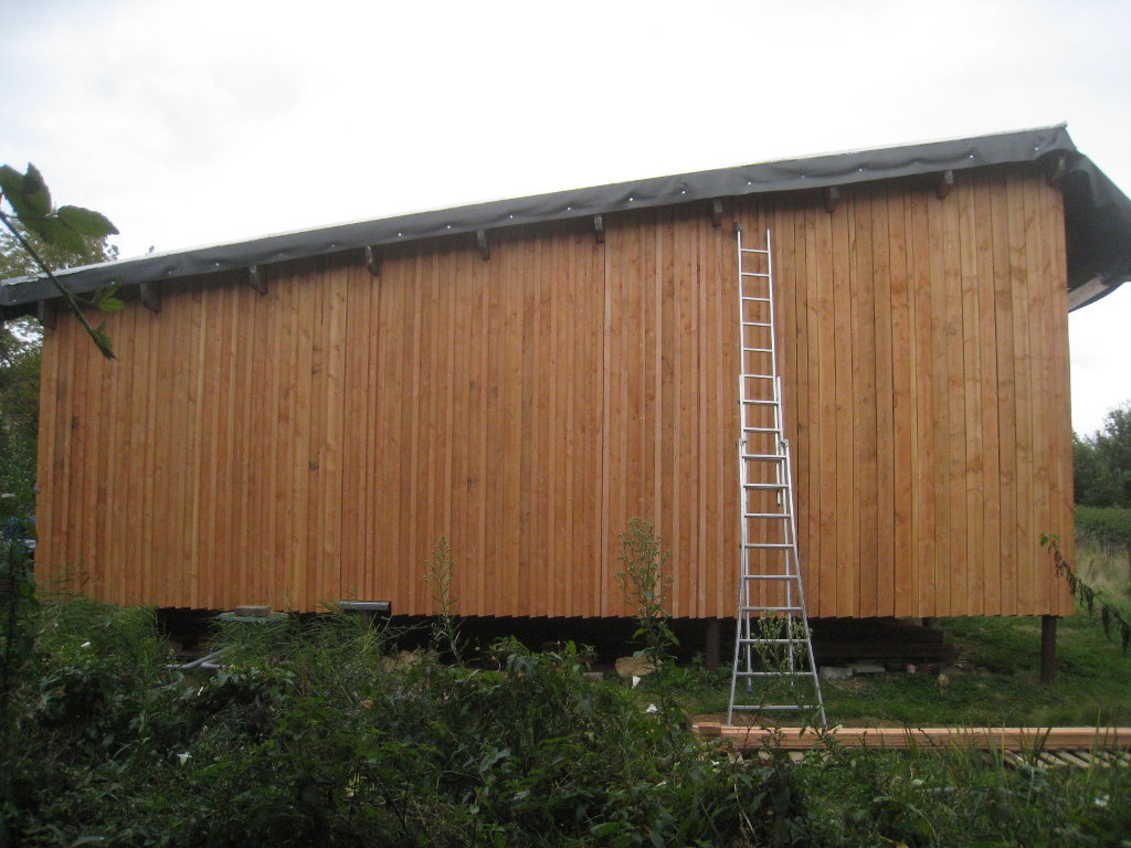 2012/10/04 : Bardage (6) - Est/OuestMis à jour : 23 février 2016 | Imprimer | Affichages : 3798Après les planches du bardage, les couvre-joints : D'abord le côté Ouest : Puis le côté Est : Cela n'a l'air de rien, mais la pose des couvre-joints représente presque autant de boulot que la pose des planches ...