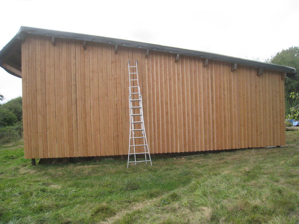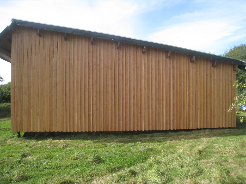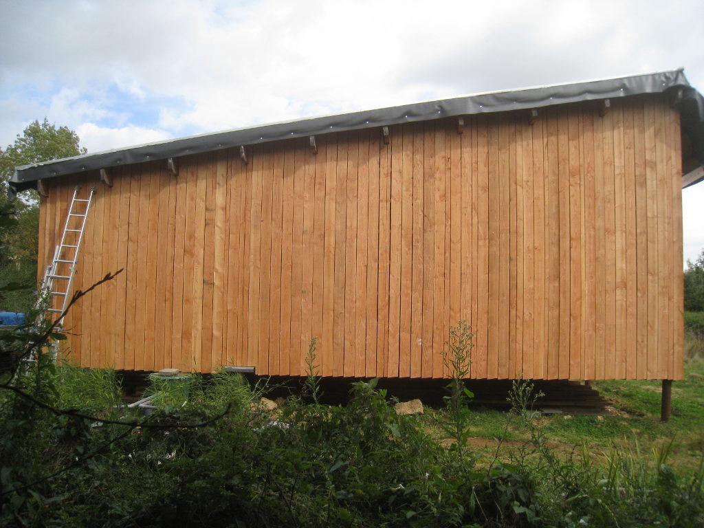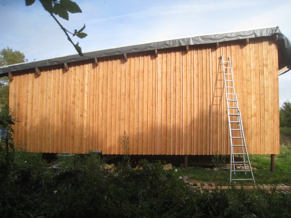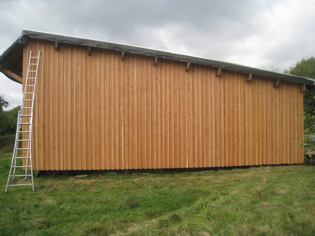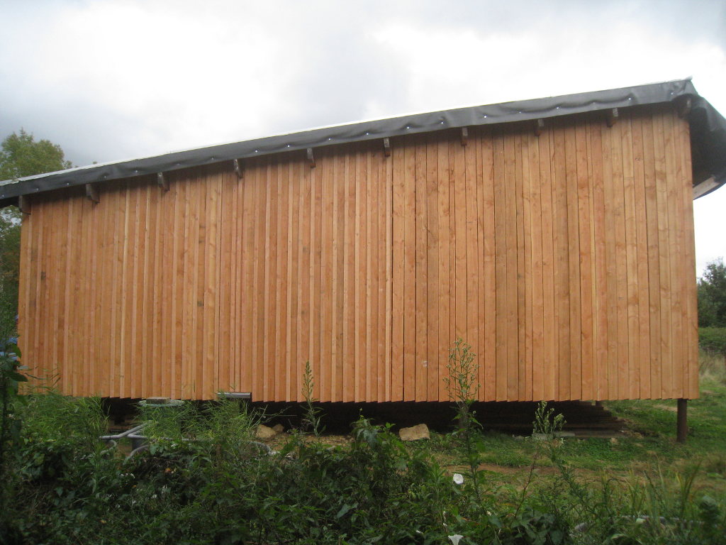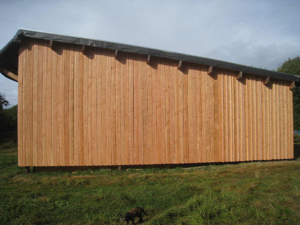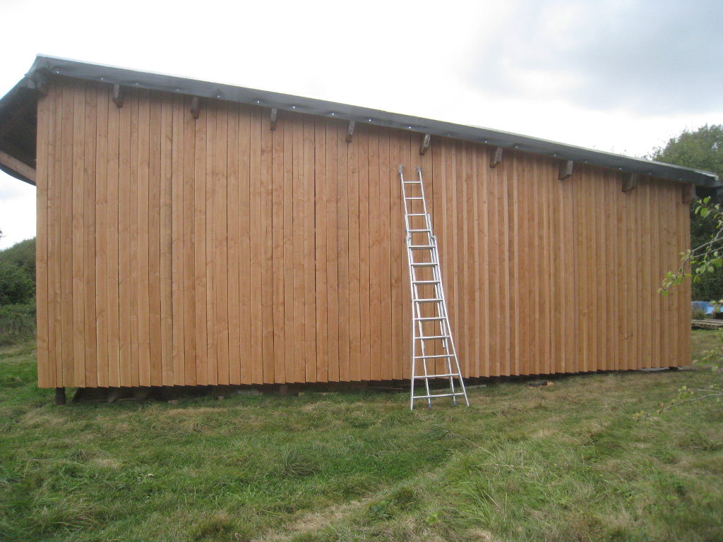 2012/10/04 : Bardage (6) - Est/OuestMis à jour : 23 février 2016 | Imprimer | Affichages : 3798Après les planches du bardage, les couvre-joints : D'abord le côté Ouest : Puis le côté Est : Cela n'a l'air de rien, mais la pose des couvre-joints représente presque autant de boulot que la pose des planches ...