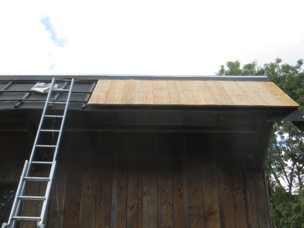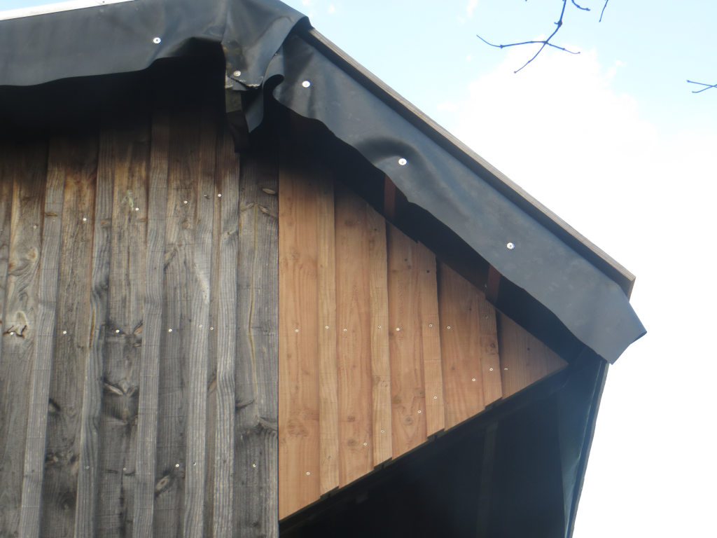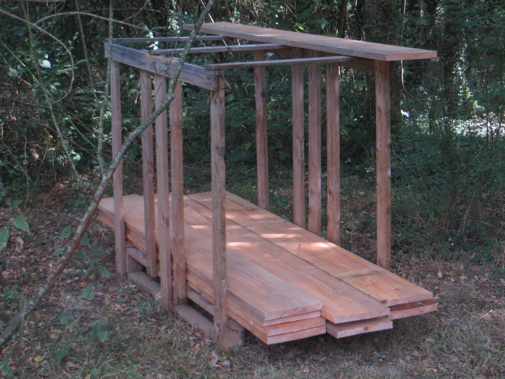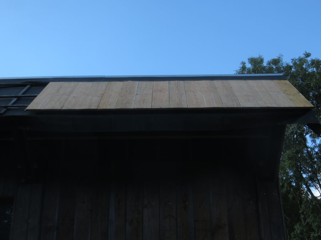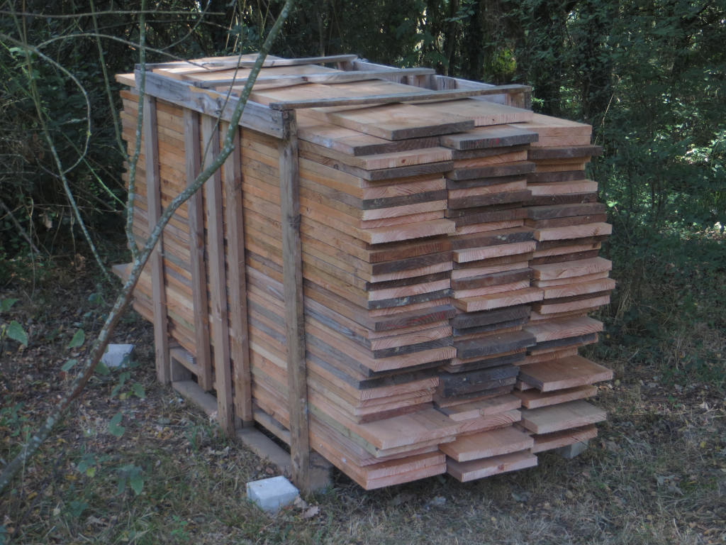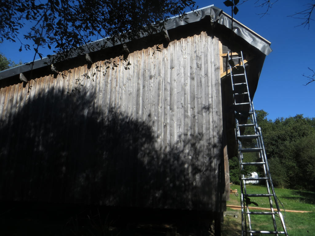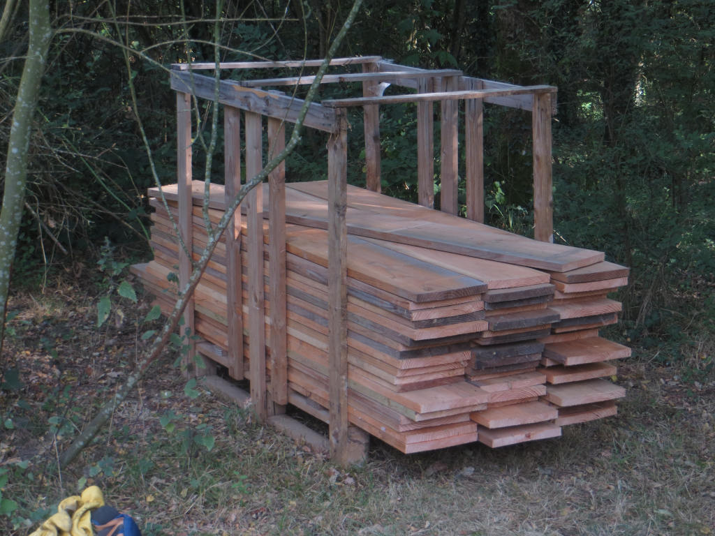 2020/09/05 : Bardage (18) - Brise-soleil Mis à jour : 30 novembre 2021 | Imprimer | Affichages : 1306 Pose du bardage sur le brise soleil (au dessus et sur les pignons)... L'avancée du travail : Le détail d'une travée (la n°7) : Le détail d'un pignon (Ouest) : Le stock de planches : Le poste de travail, à l'ombre sous les arbres : Précédent Suivant
