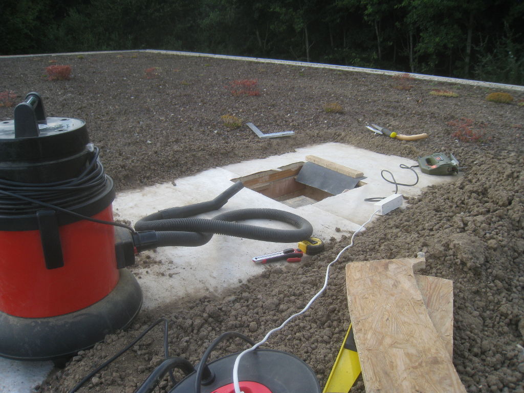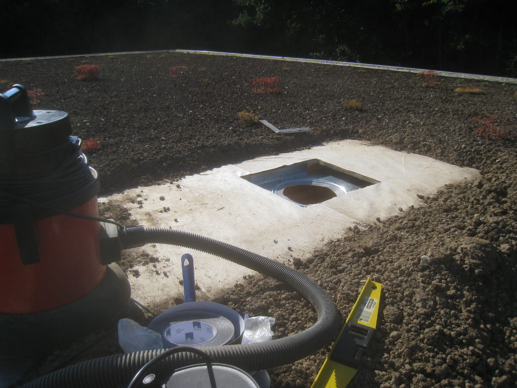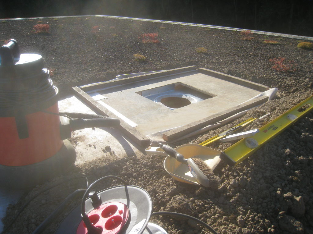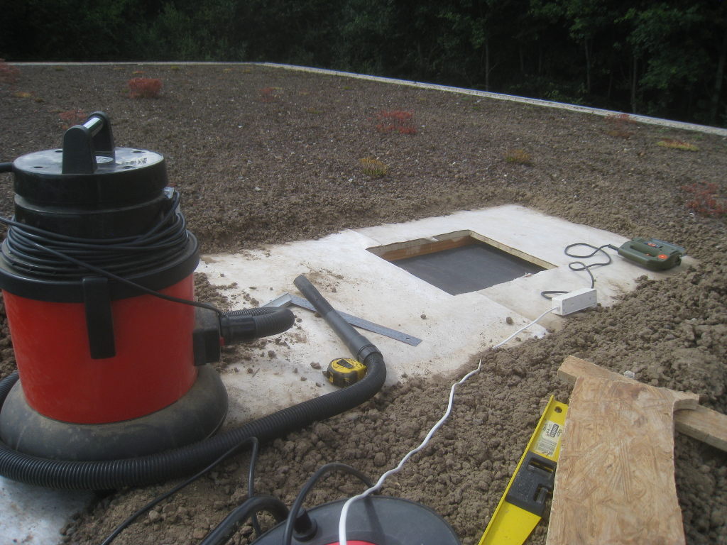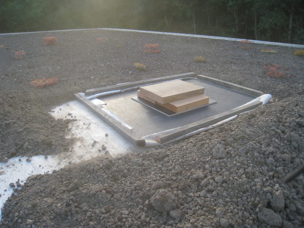 Je monte sur le toit à la recherche de la dîte baguette, et je dégage le substrat végétal tout autour,emplacement de la future embase et de son solin :