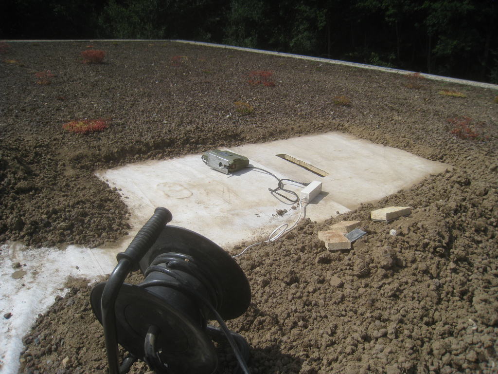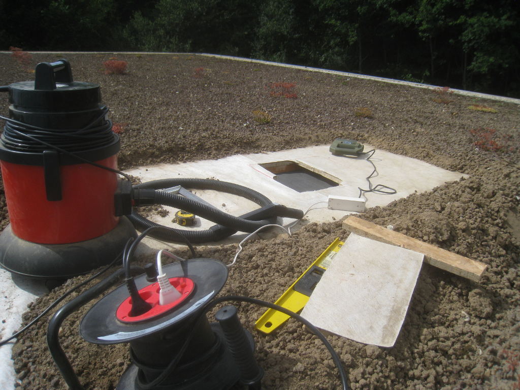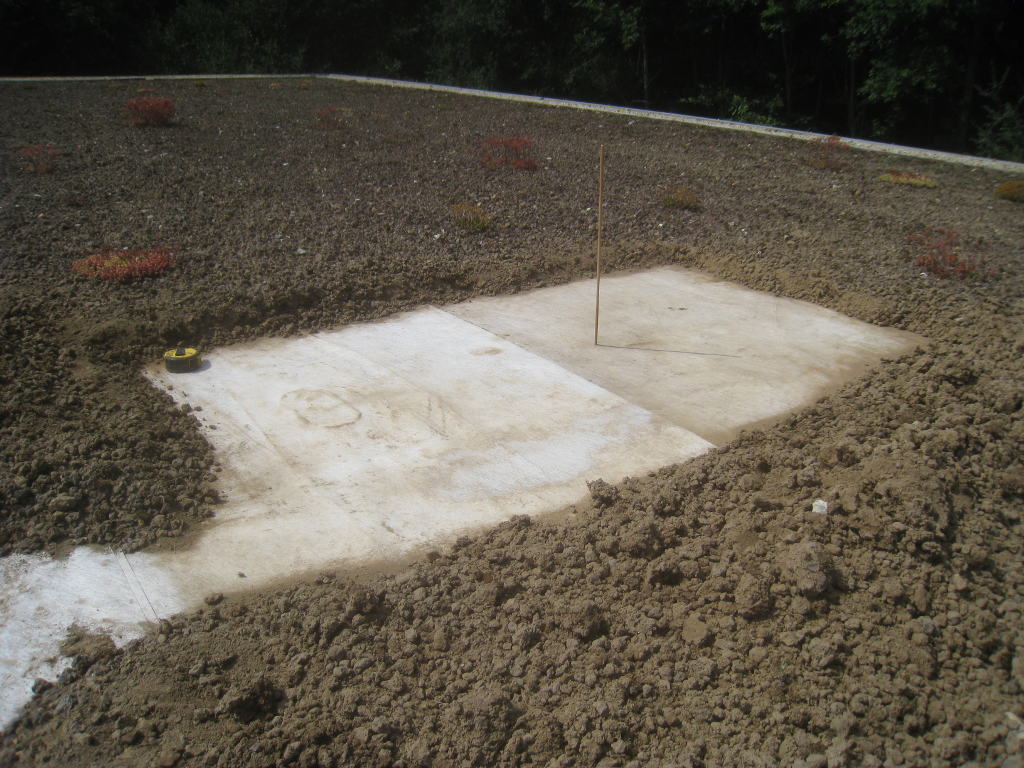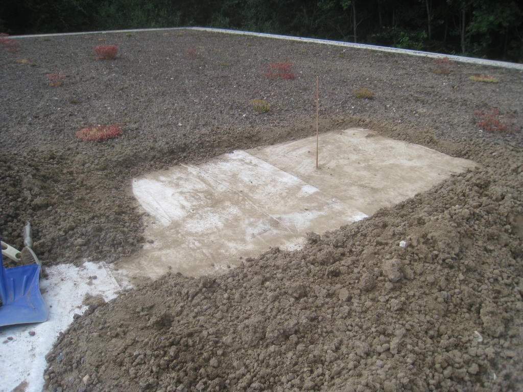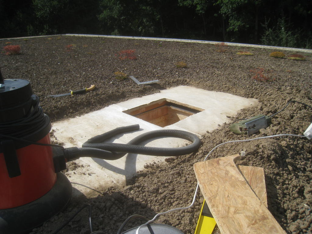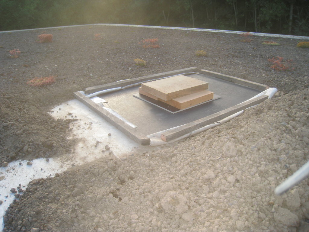 Je monte sur le toit à la recherche de la dîte baguette, et je dégage le substrat végétal tout autour,emplacement de la future embase et de son solin :