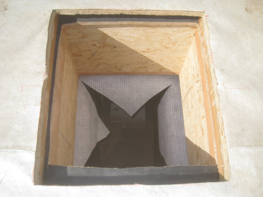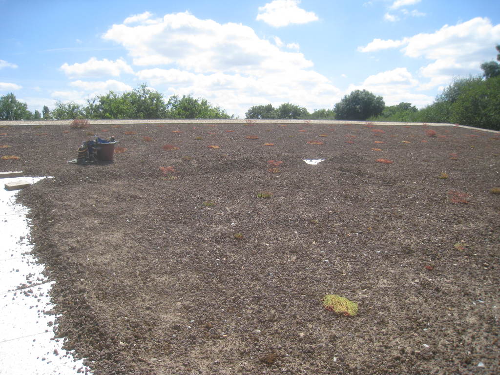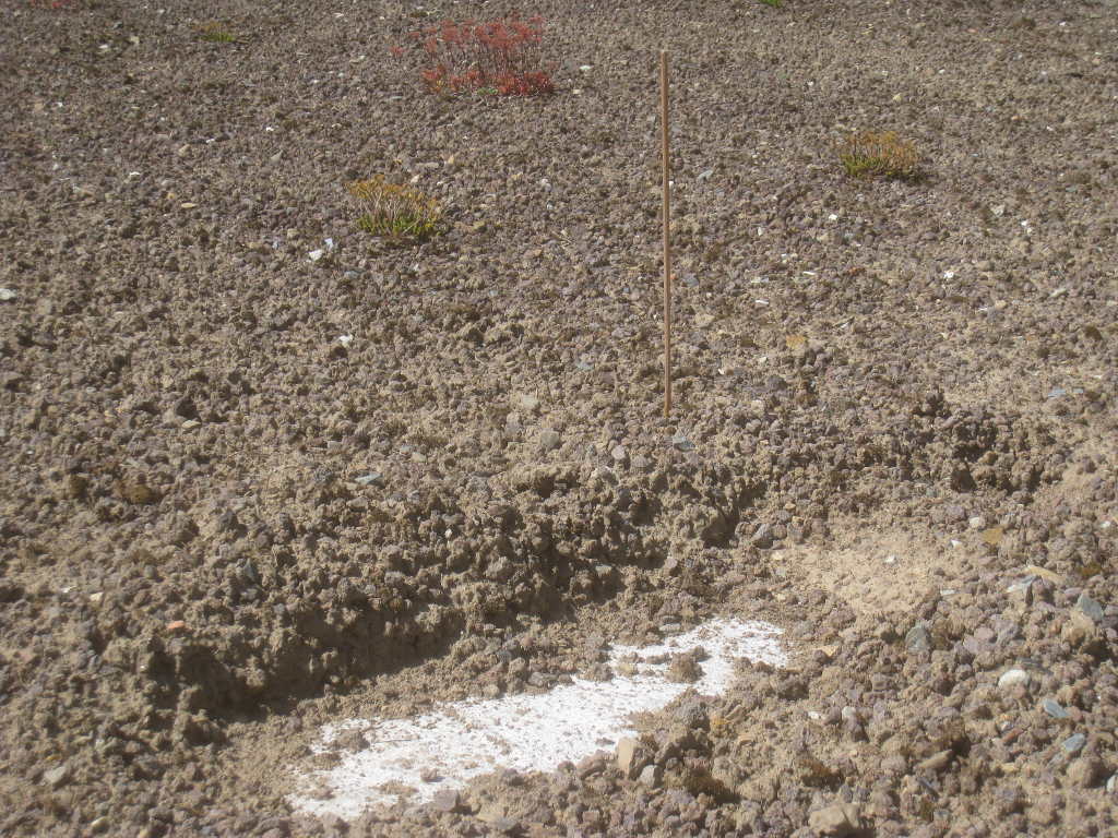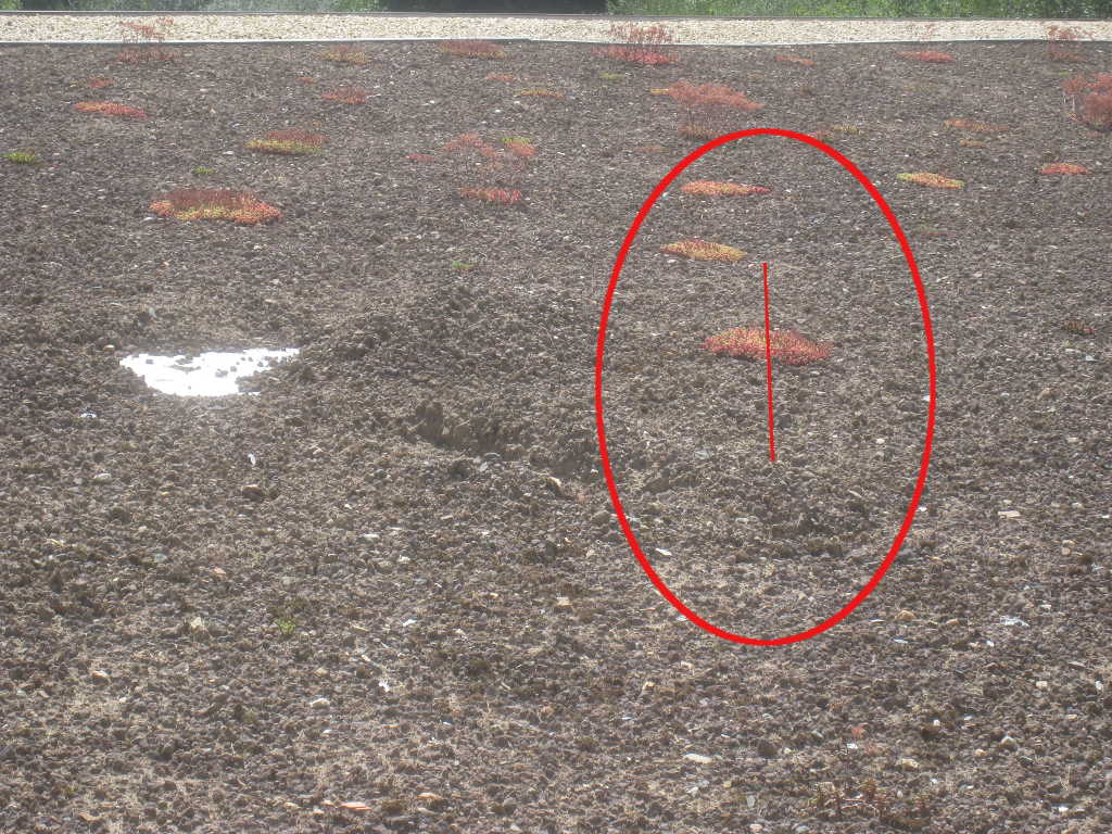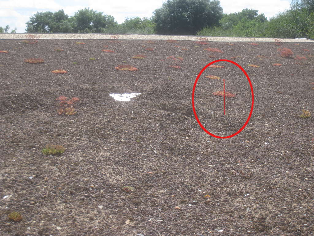 Je monte sur le toit à la recherche de la dîte baguette, et je dégage le substrat végétal tout autour,emplacement de la future embase et de son solin :