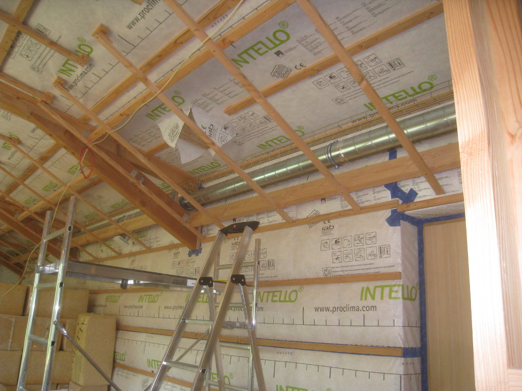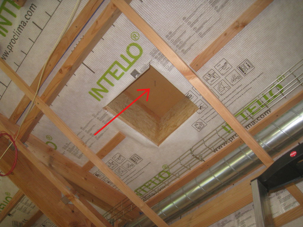Dans l'épaisseur de mon plafond, j'avais prévu un caisson sans isolant, de quoi faire passer le conduit d'évacuation des fumées en respectant les distances de sécurité.