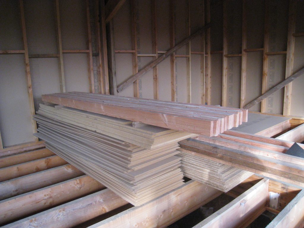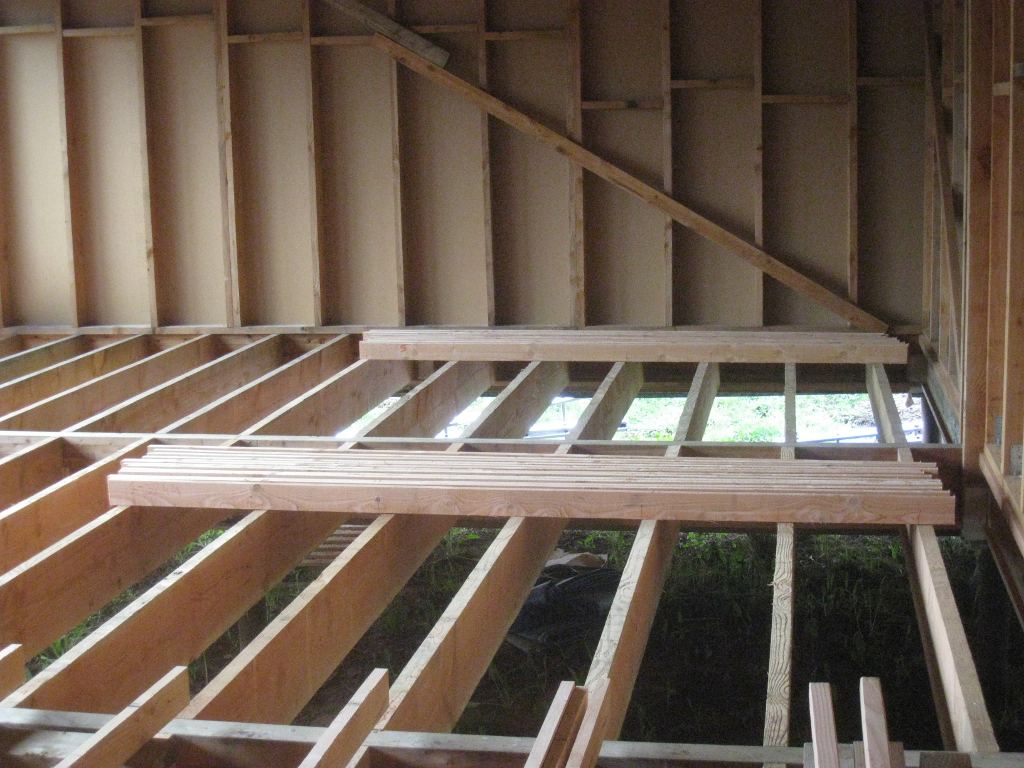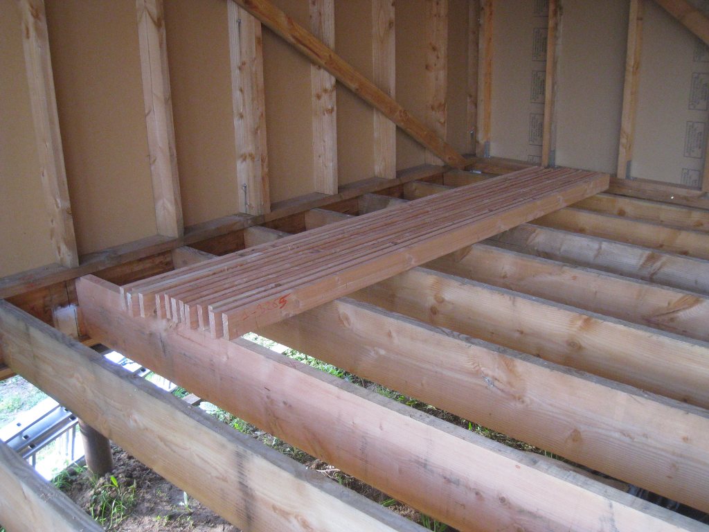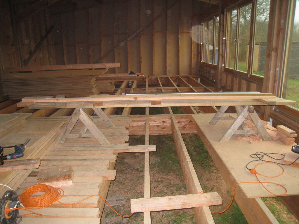 Il s'agit pour commencer de fixer des planches sous les solives, planches dont les déports serviront ensuite à supporter les panneaux de fond de dalle.