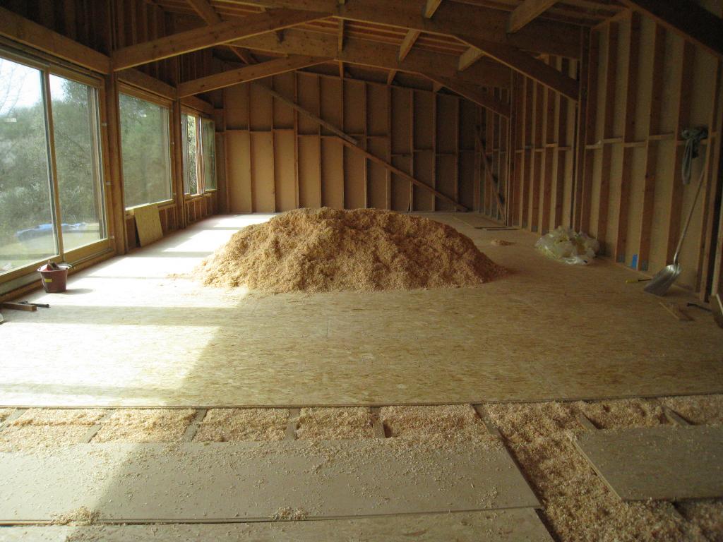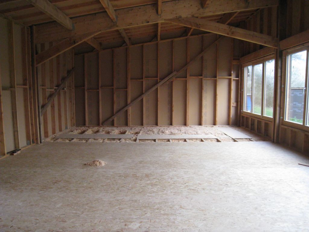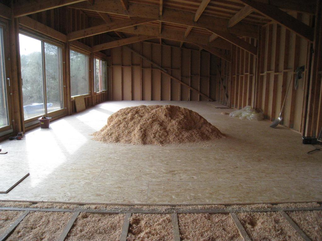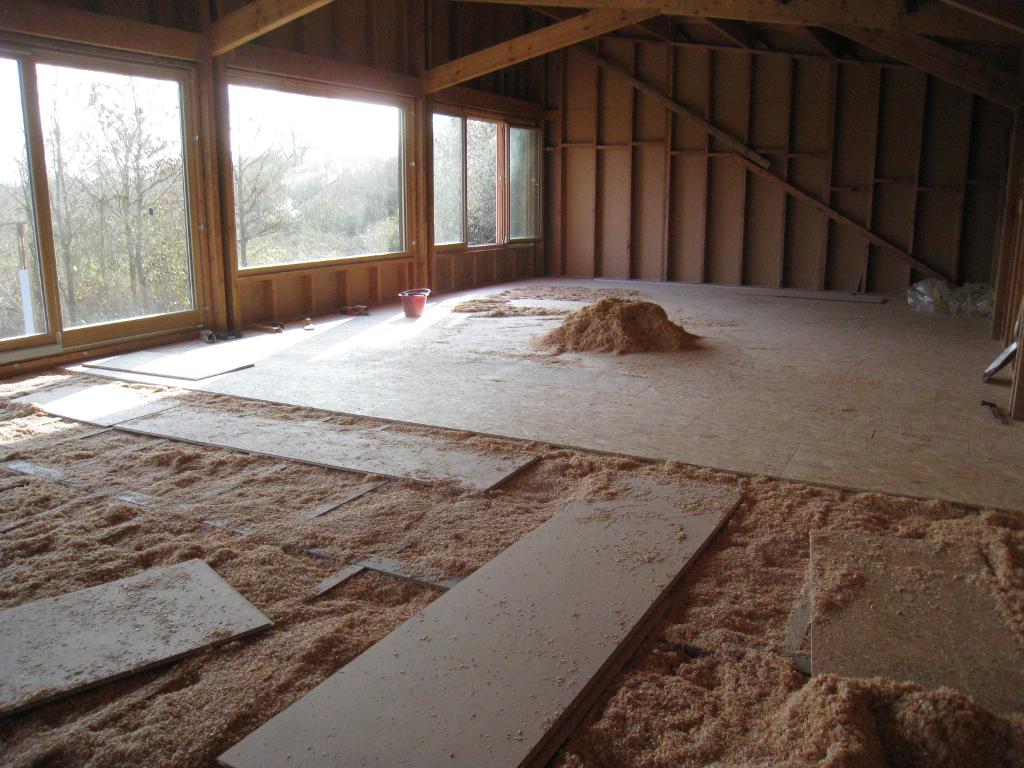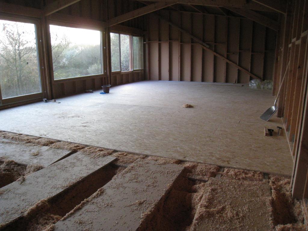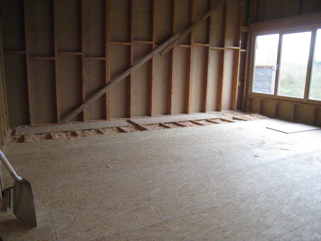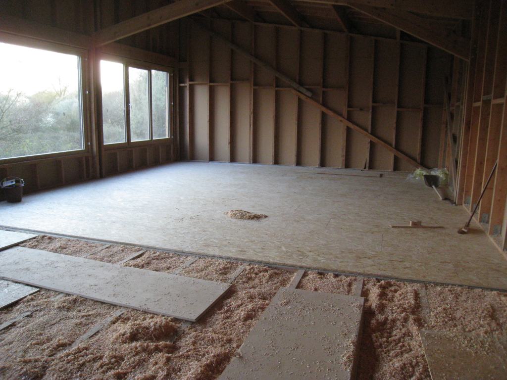 Les copeaux ayant été déversés partout, il s'agit maintenant de fermer la dalle avec des panneaux d'OSB4.