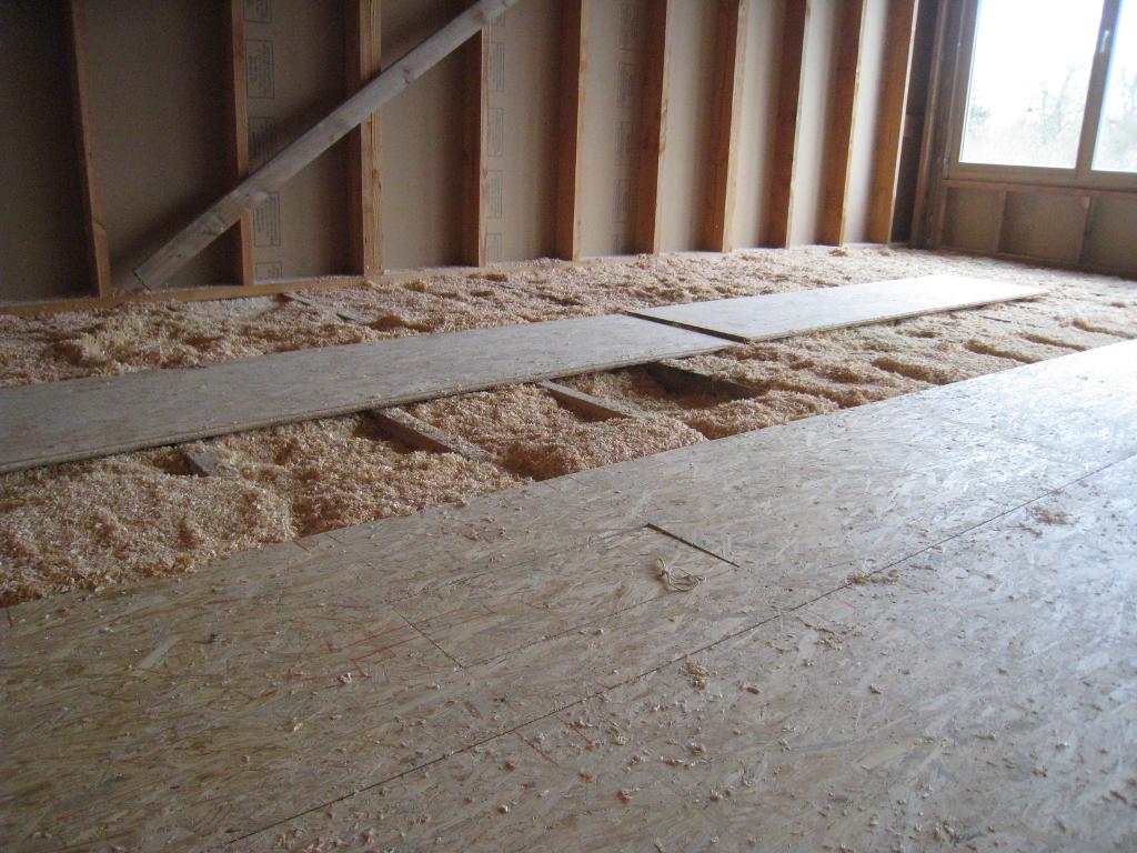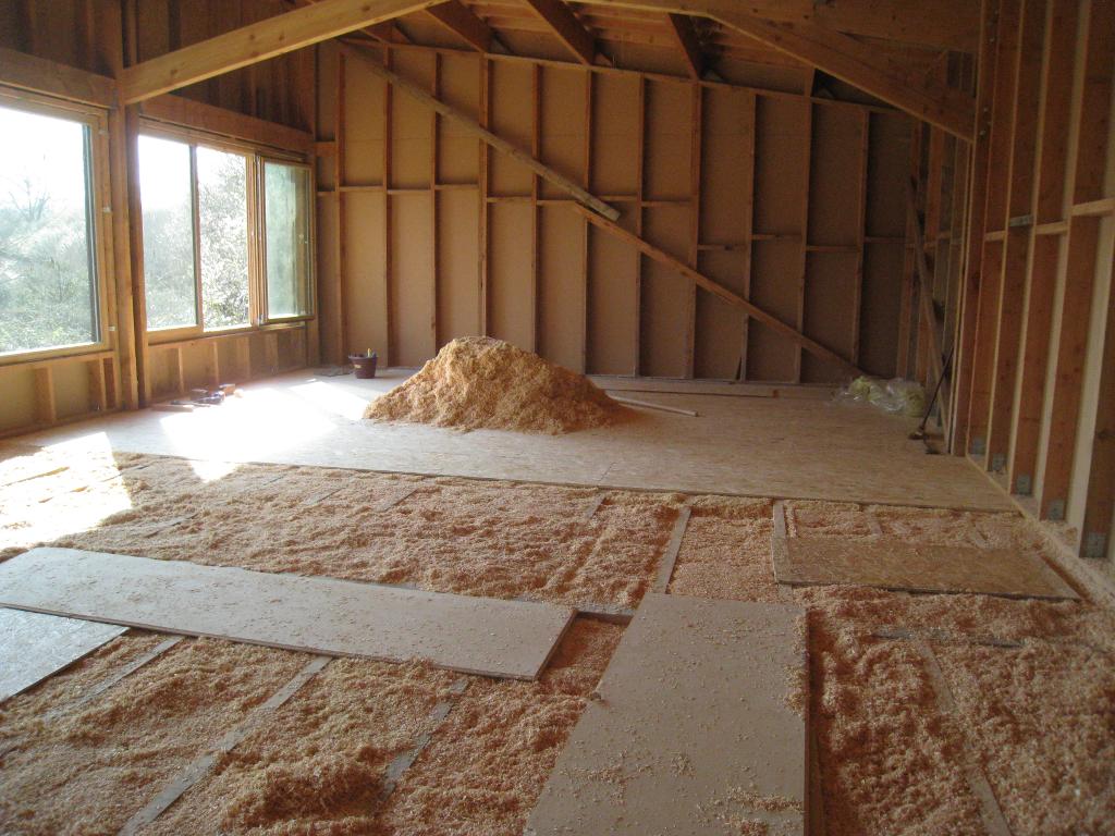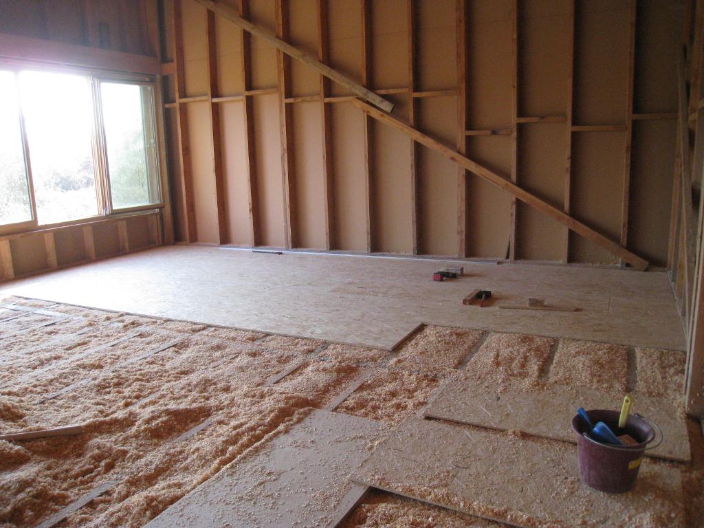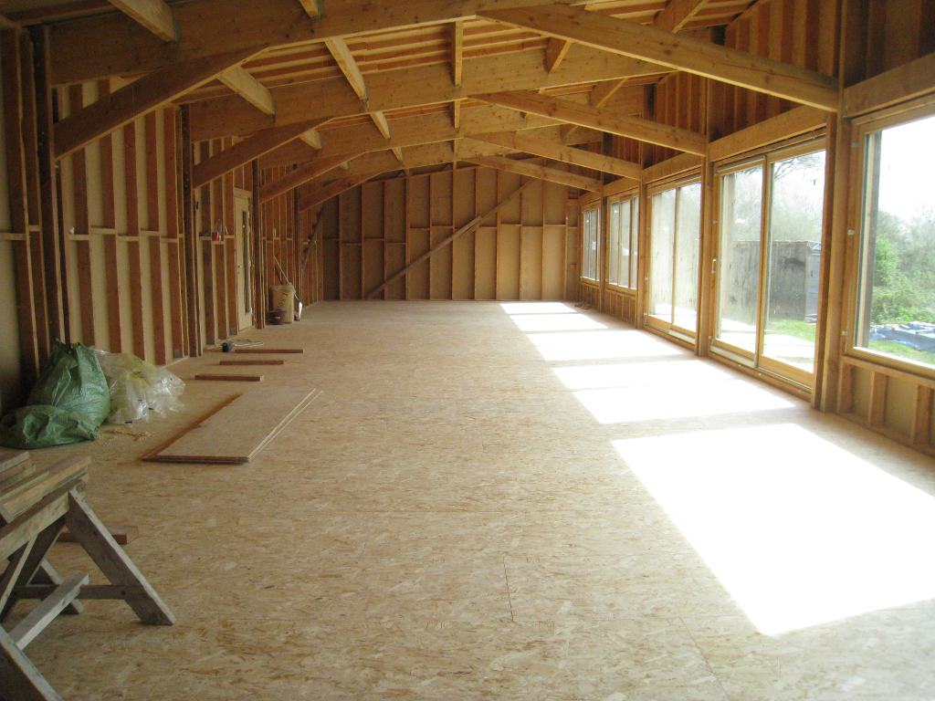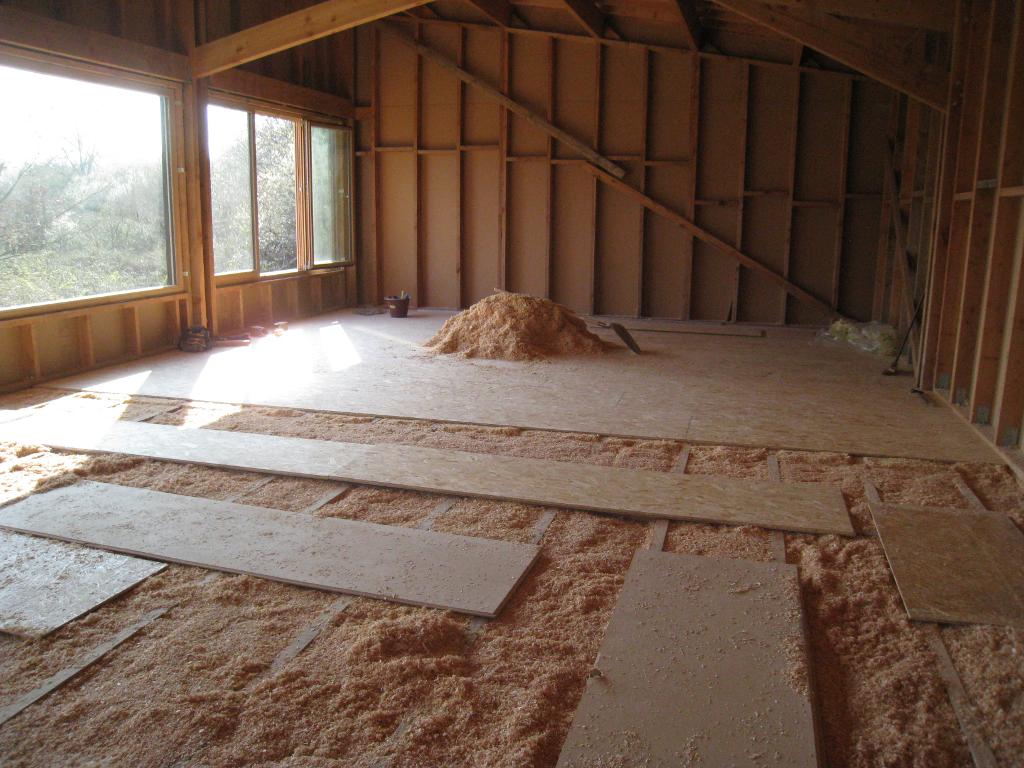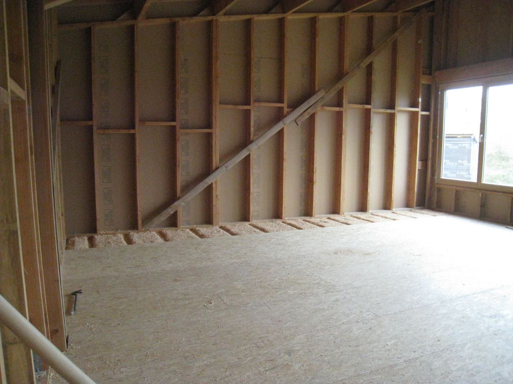 Les copeaux ayant été déversés partout, il s'agit maintenant de fermer la dalle avec des panneaux d'OSB4.