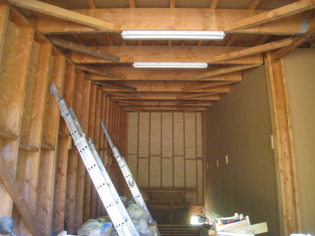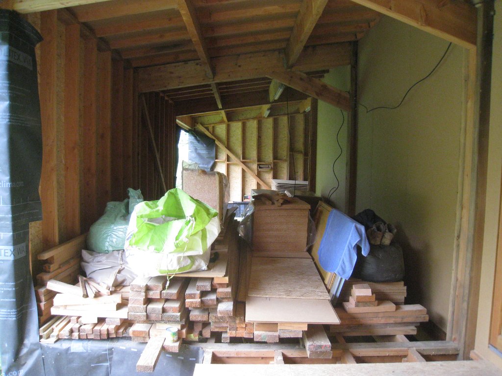 Au vu des prévisions météo désastreuses, nous décidons d'interrompre la pose des couvre-joints du bardage des murs Est et Ouest, pour nous attaquer au grenier, ce qui nous permet de travailler à l'abris :