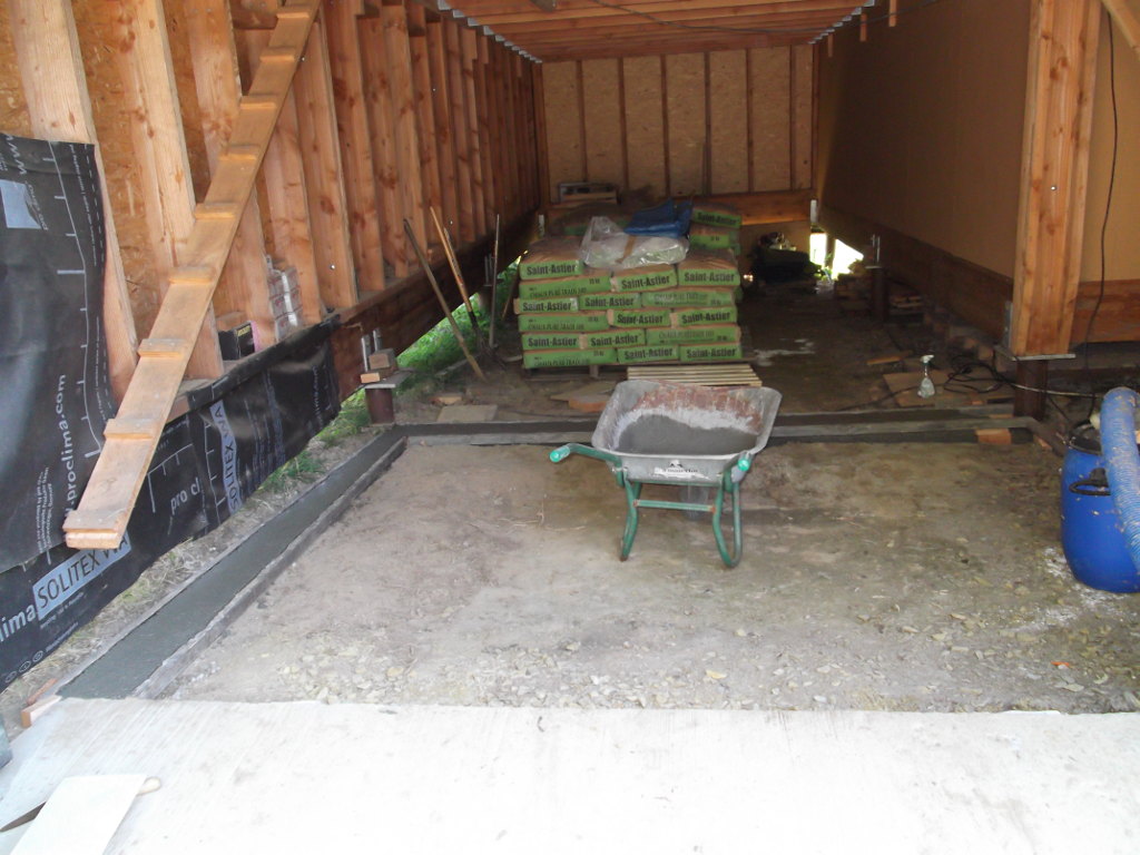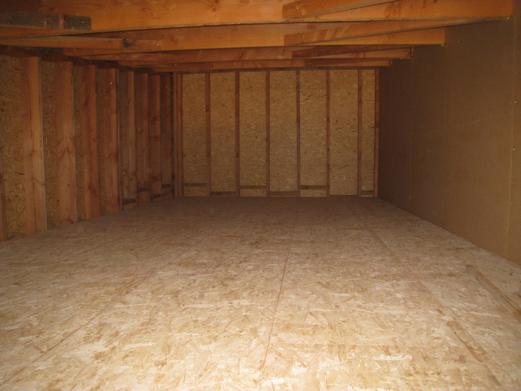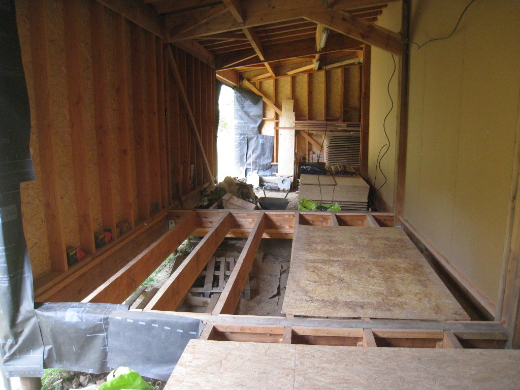 Par manque de temps, je n'avais pas posé le plancher en OSB4 de la buanderie, qui est peu à peu devenue un espace de stockage hétéroclite.