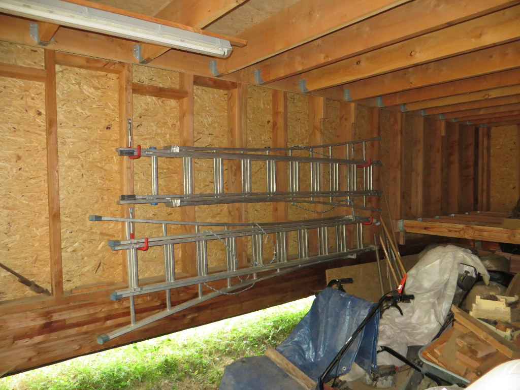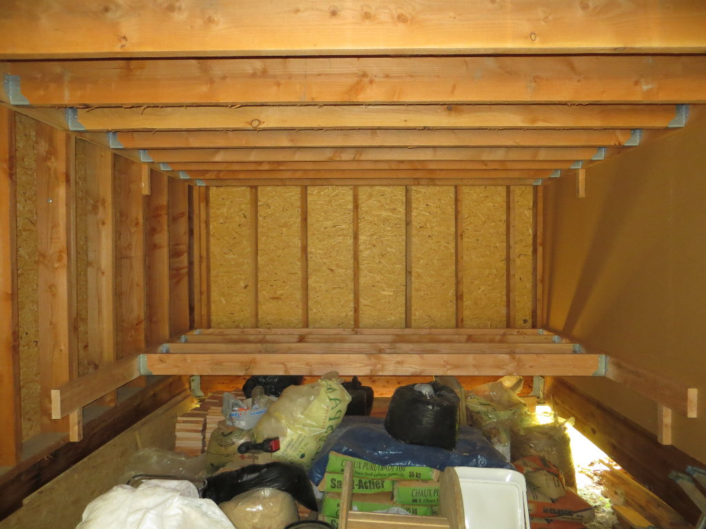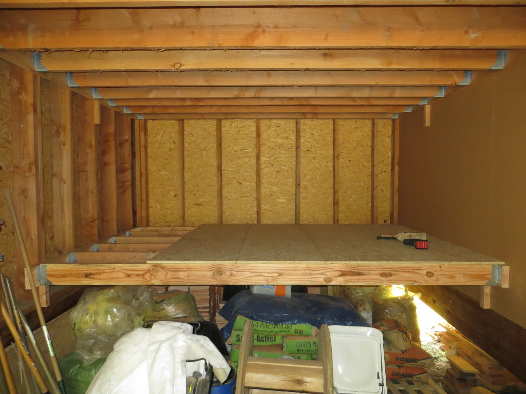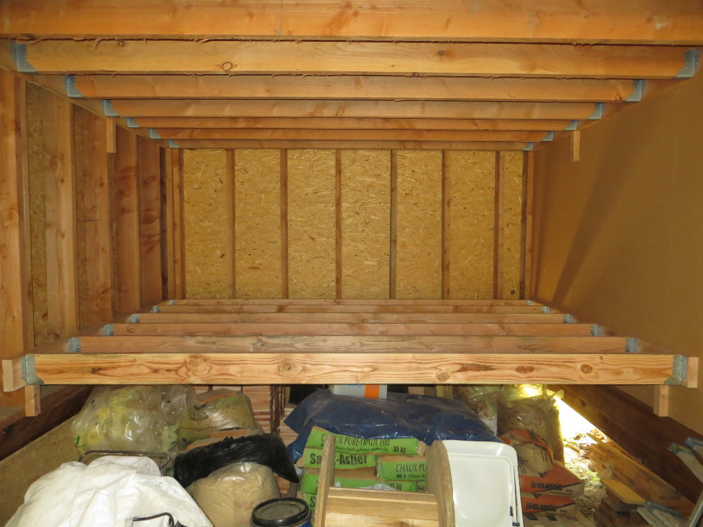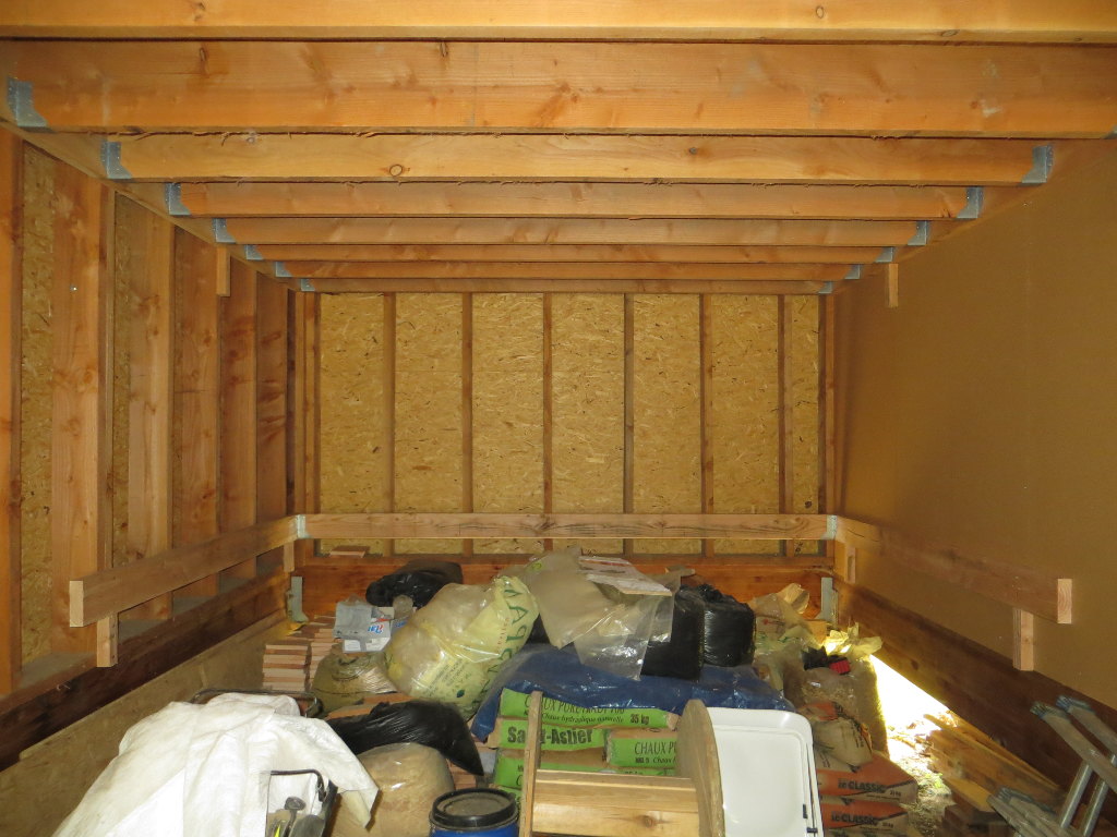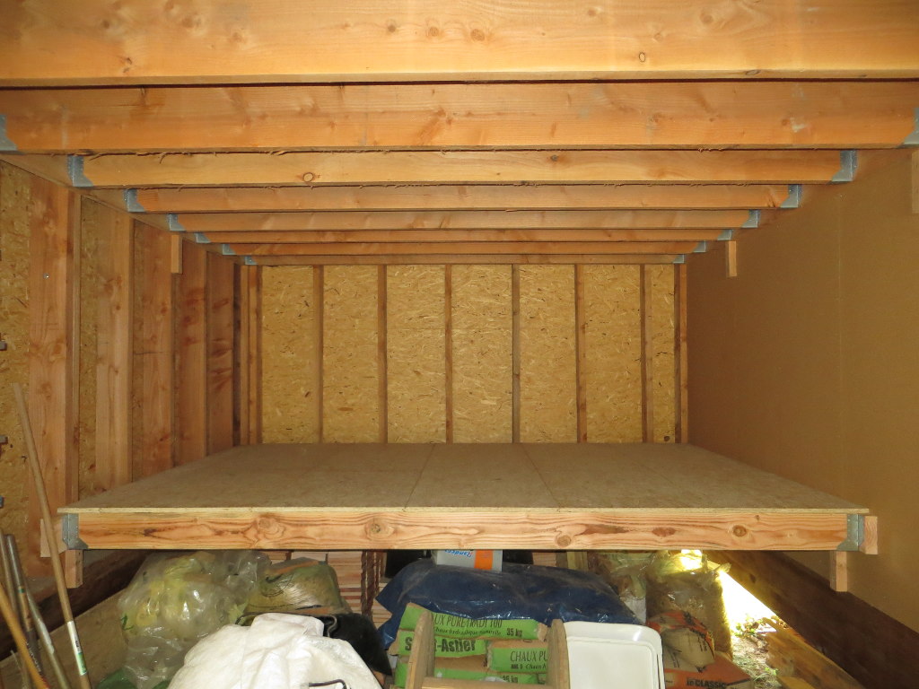 J'appelle ceci un faux-grenier parce qu'on peut parler, aux choix, d'un petit plancher ou d'une grosse étagère. Ce faux-grenier procurera du volume de rangement, tout en abritant la remorque. À noter qu'à peine construit, il est déjà rempli :