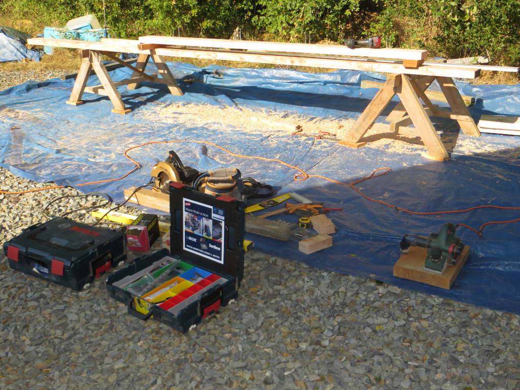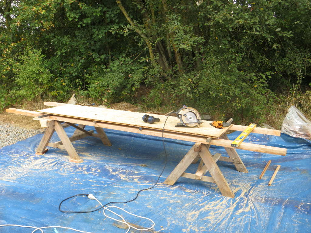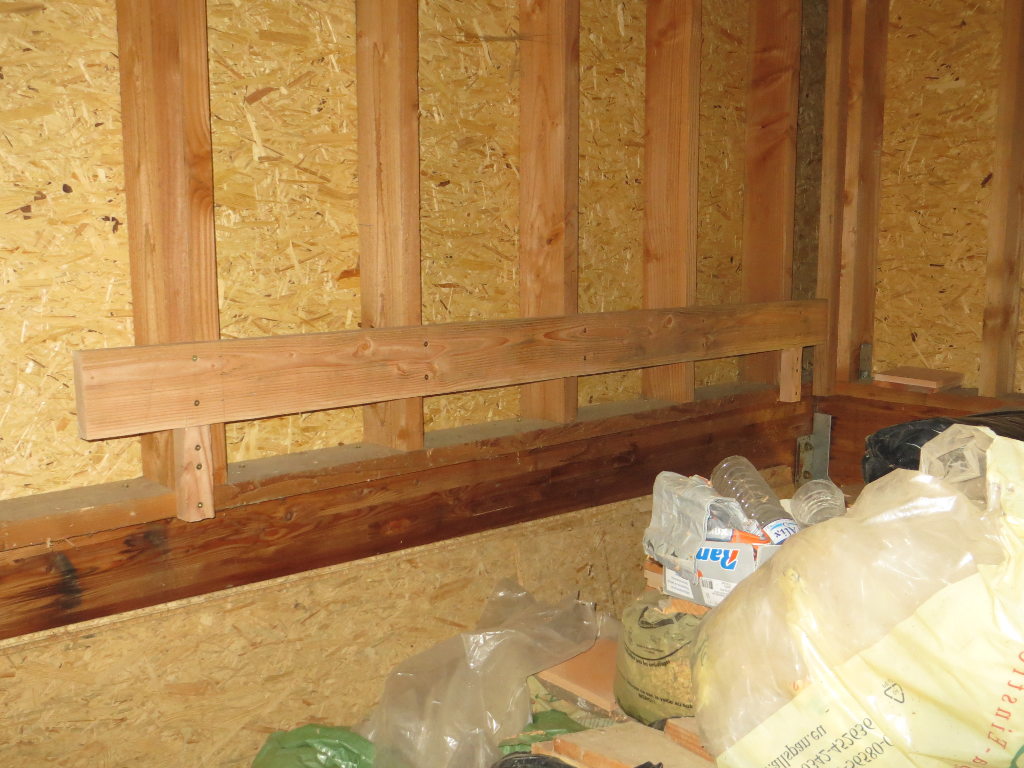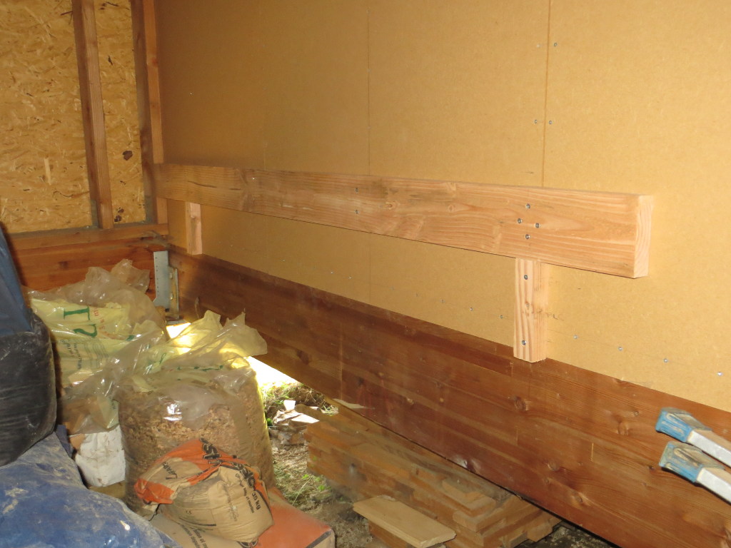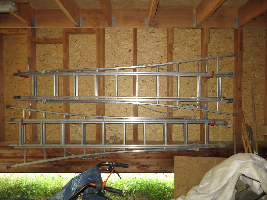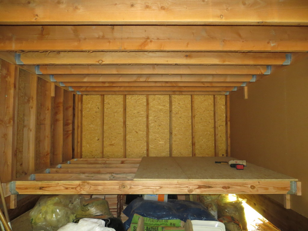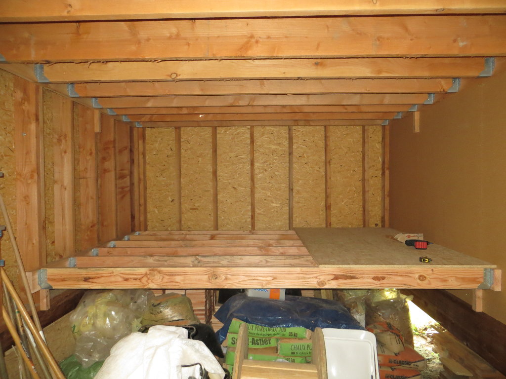 J'appelle ceci un faux-grenier parce qu'on peut parler, aux choix, d'un petit plancher ou d'une grosse étagère. Ce faux-grenier procurera du volume de rangement, tout en abritant la remorque. À noter qu'à peine construit, il est déjà rempli :