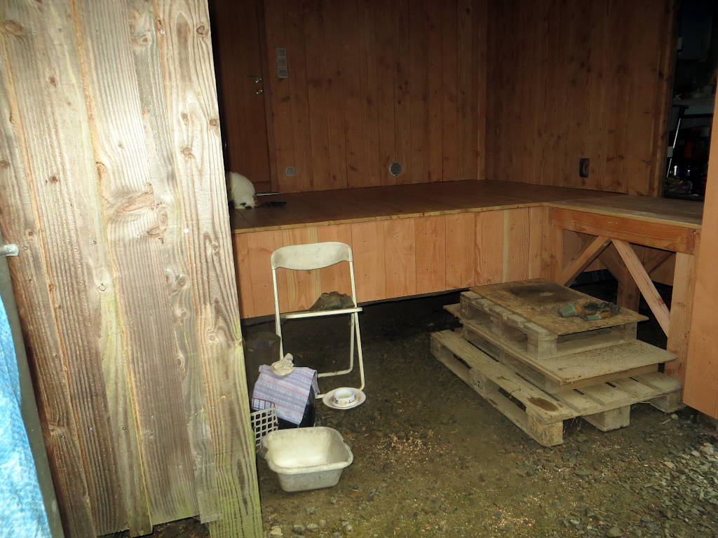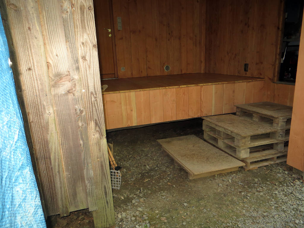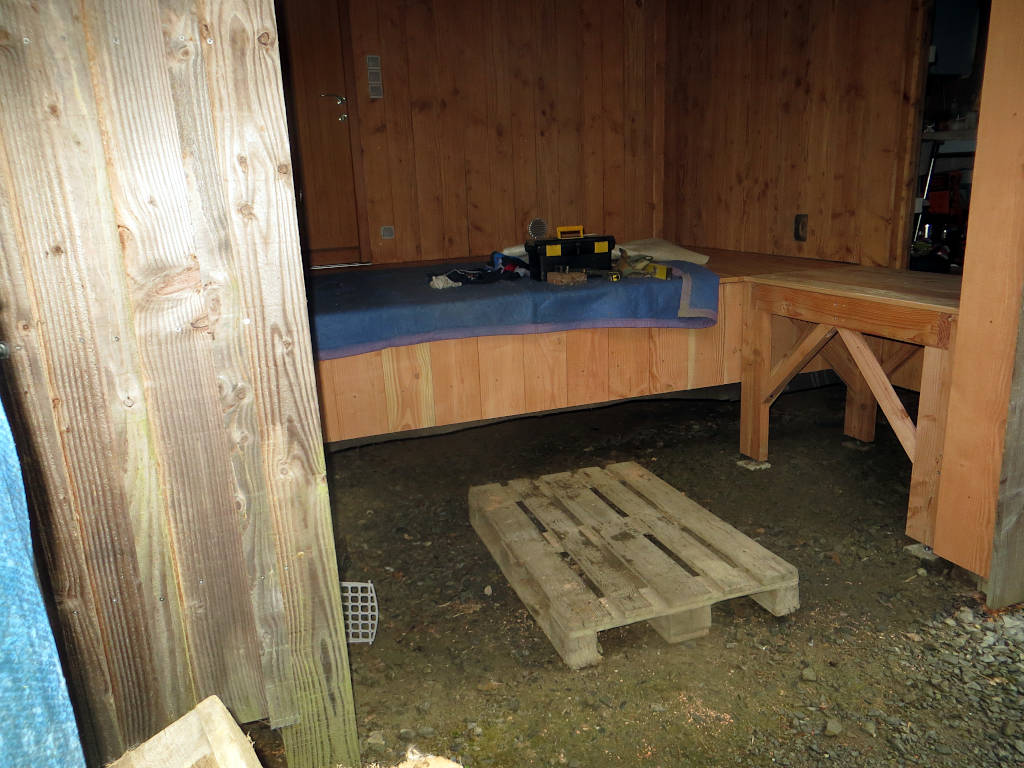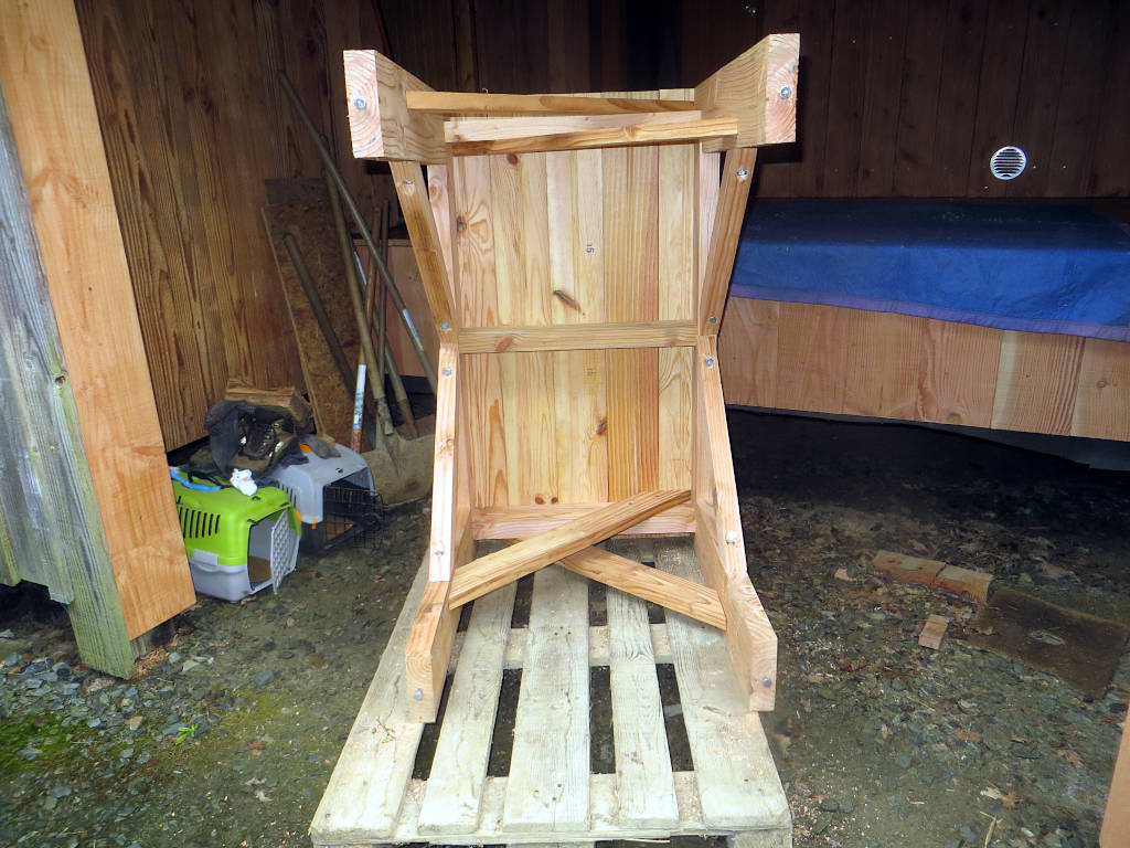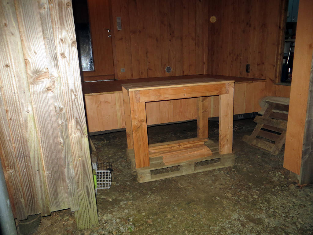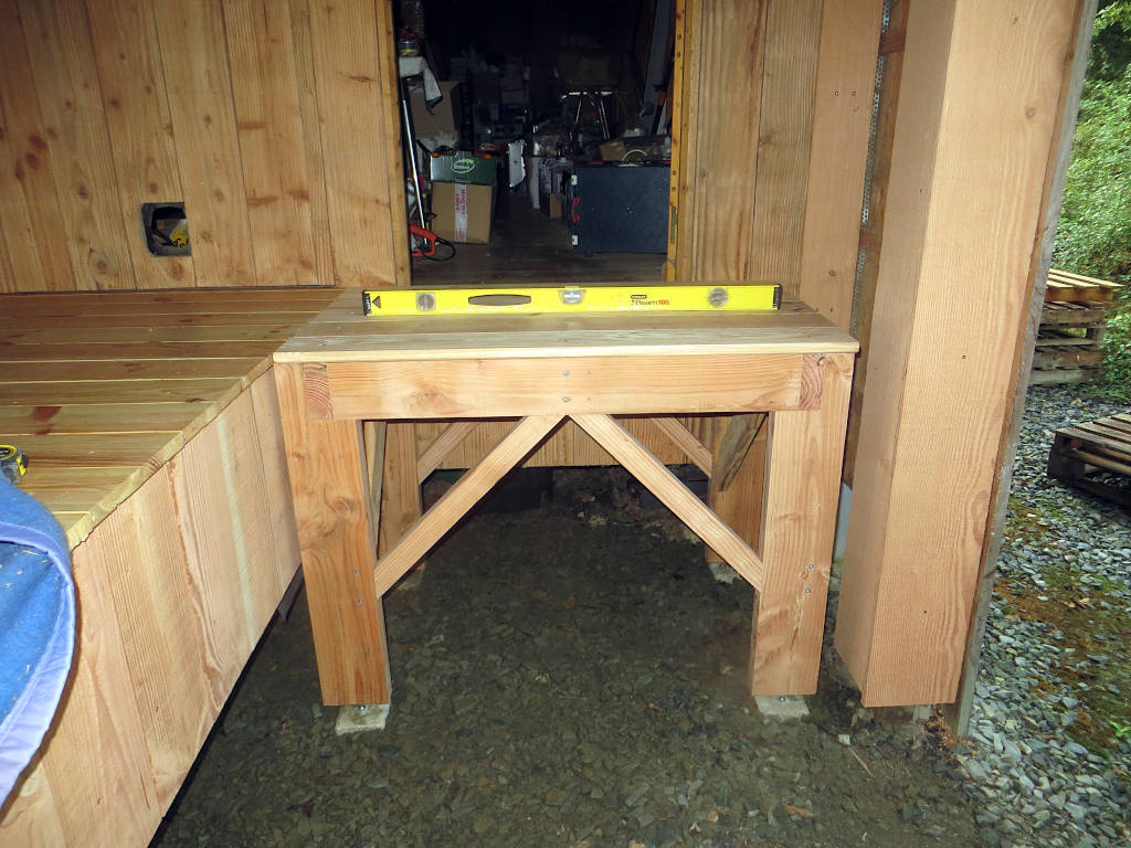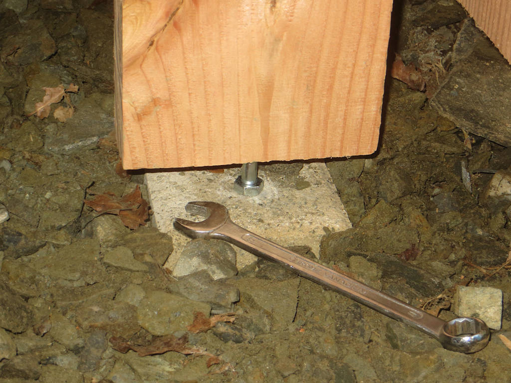 J'ai placé un tire-fond sous chaque pied, ce qui me permet d'abord de décoller les pieds de l'humidité du sol, ensuite de pouvoir ajuster la hauteur de chaque pied :