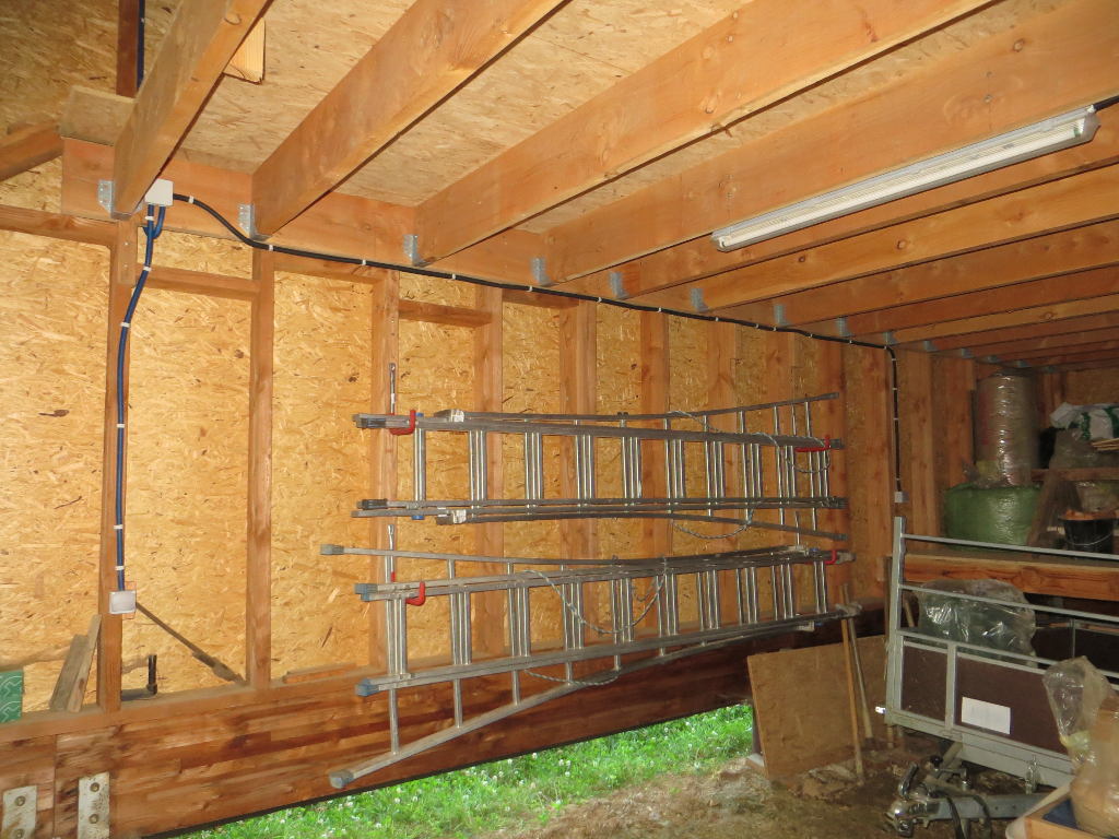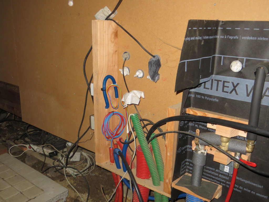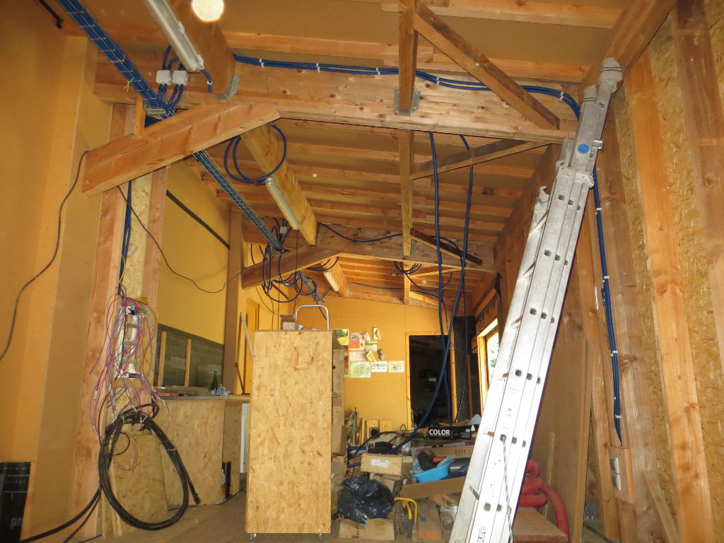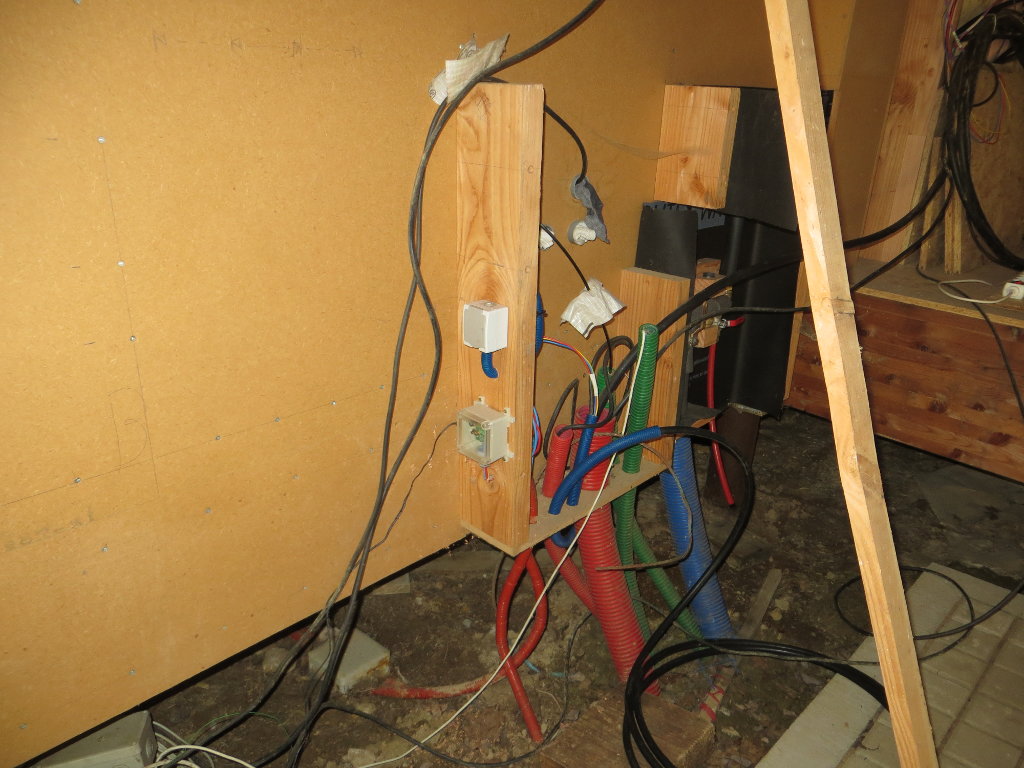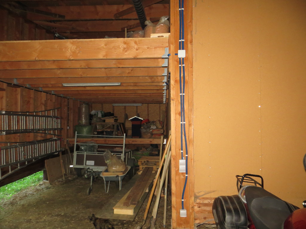 Dans le garage, mise en place des prises et interrupteurs, fixation définitive des gaines ...