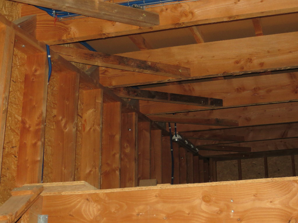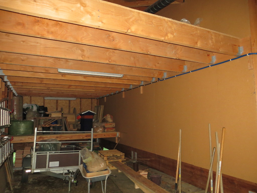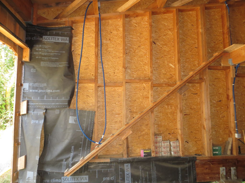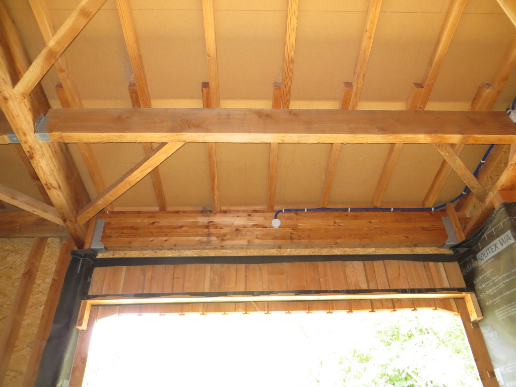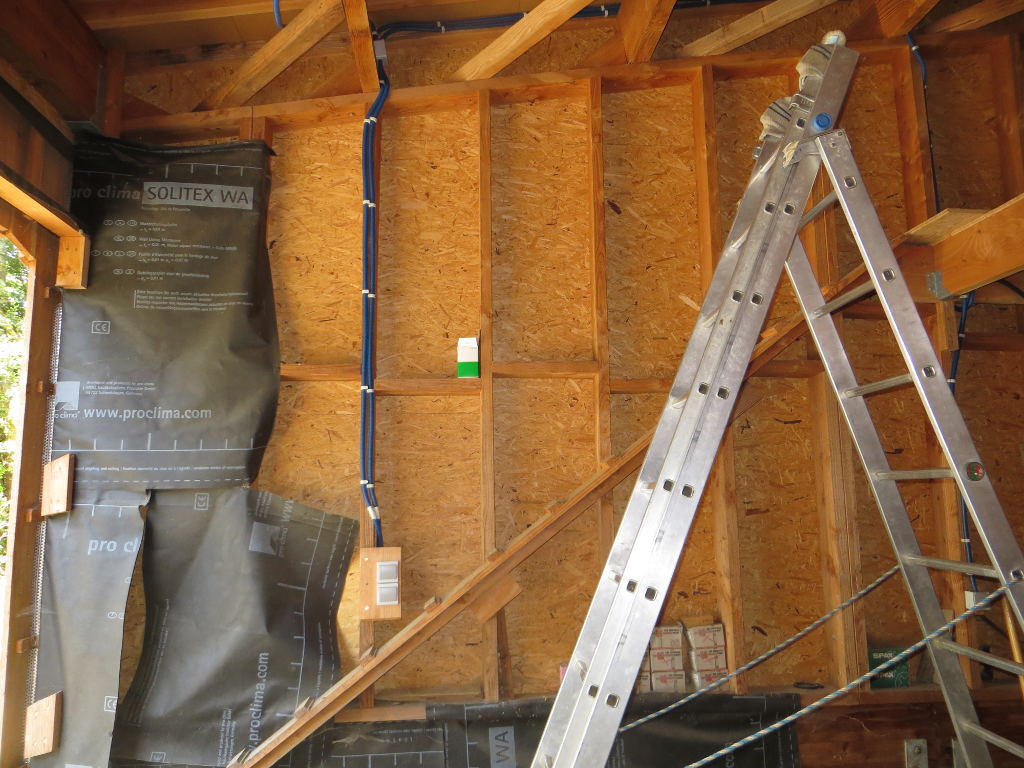 Dans le garage, mise en place des prises et interrupteurs, fixation définitive des gaines ...