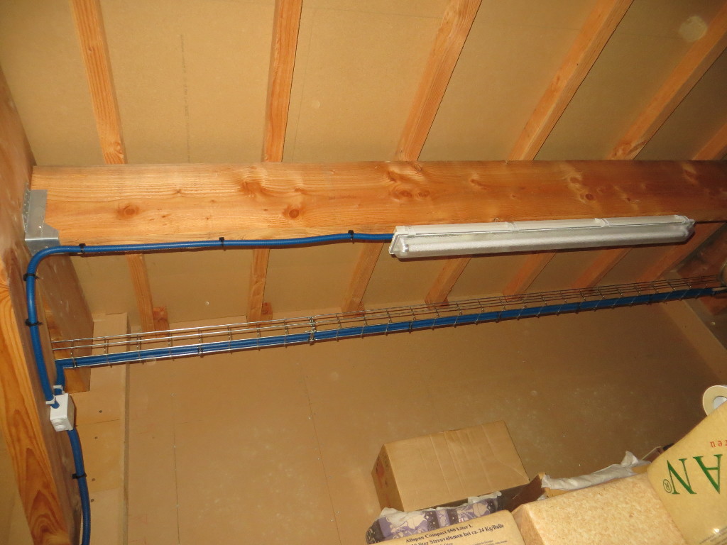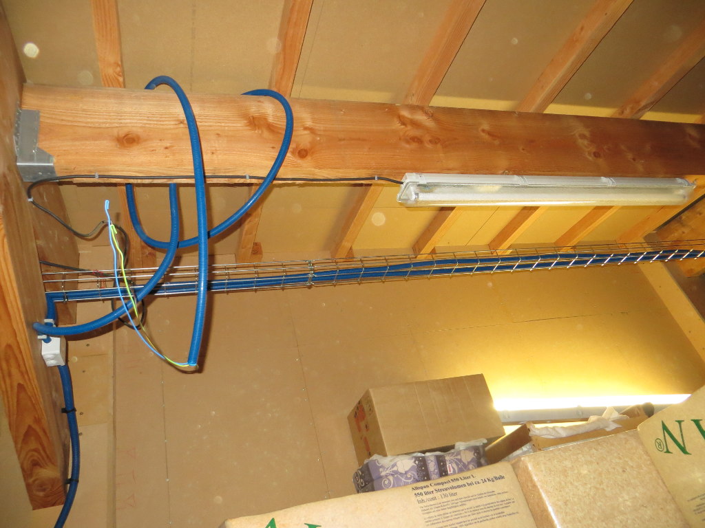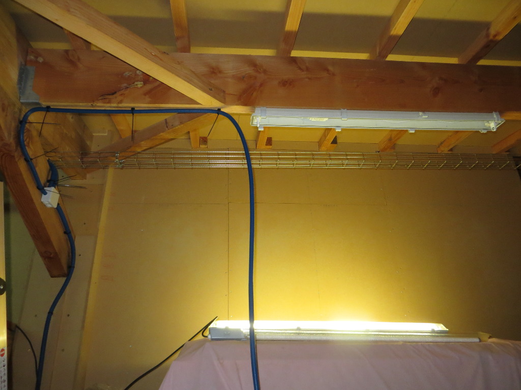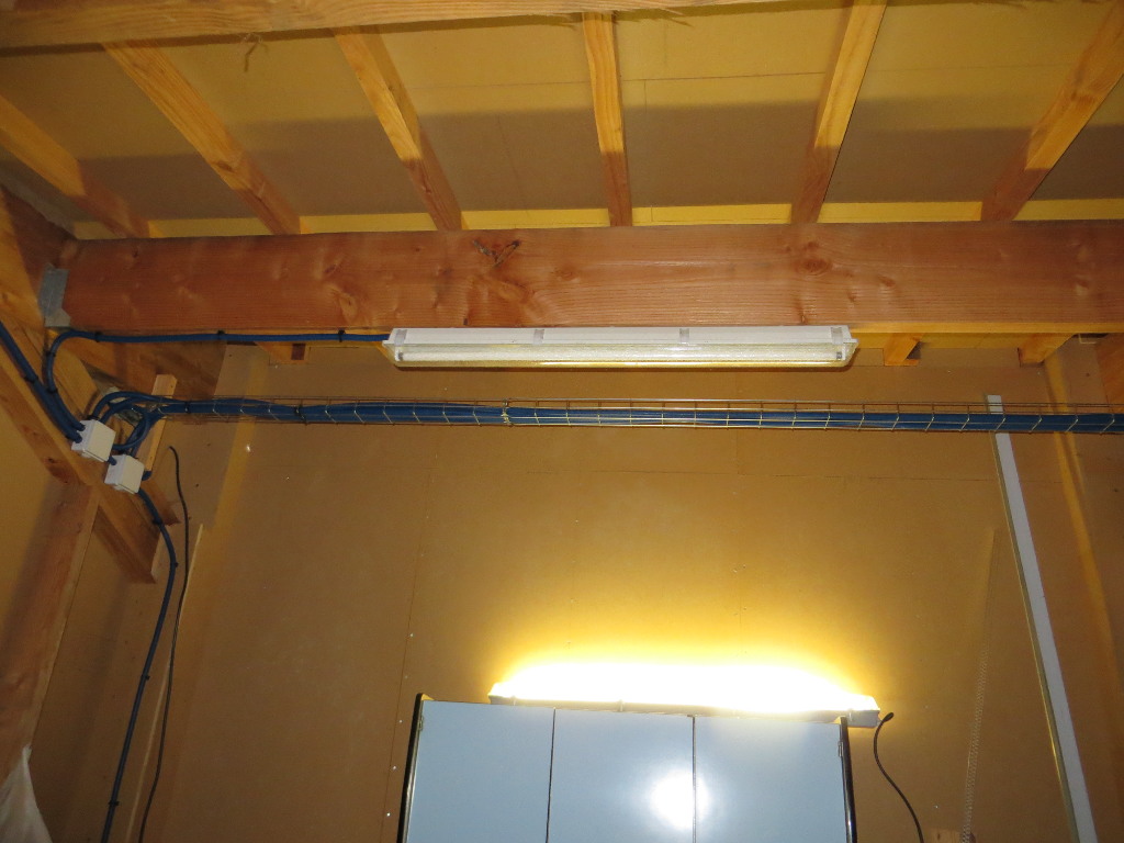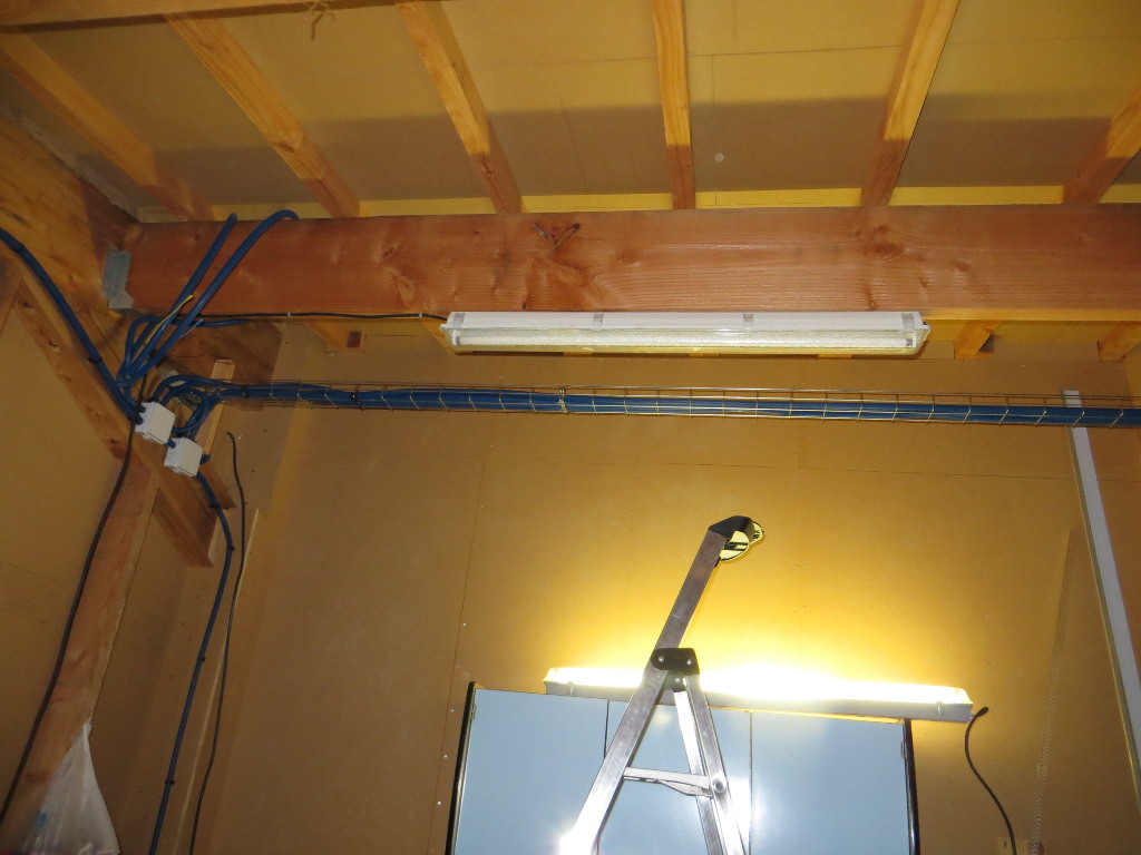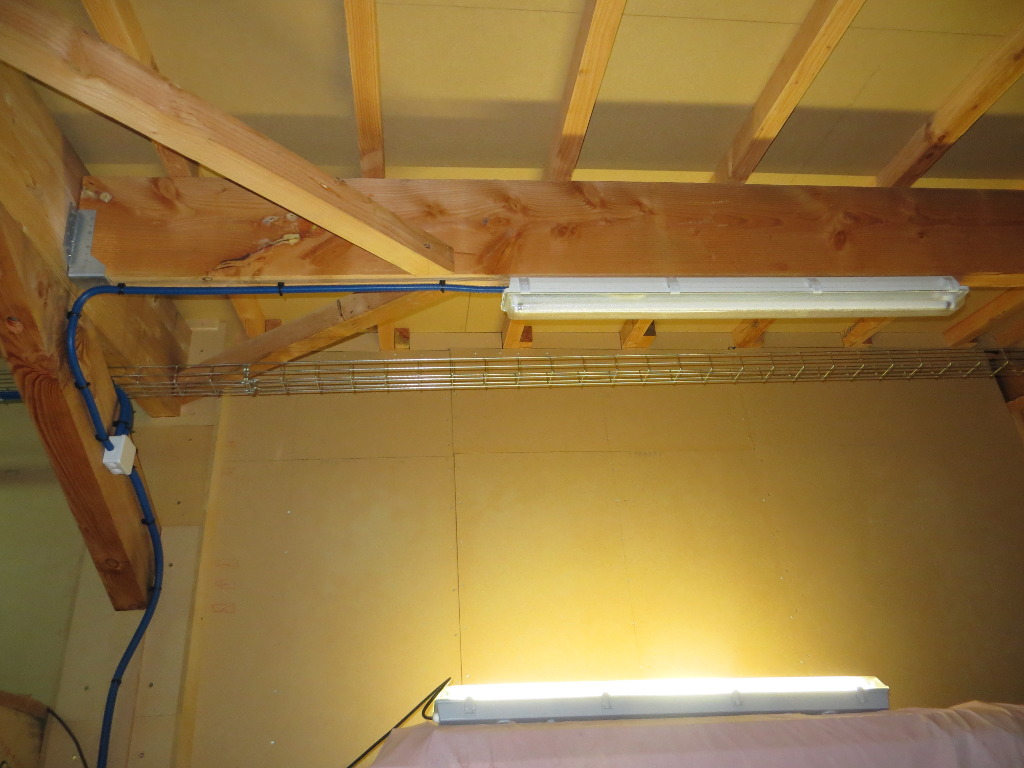 2015/07/21 : Électricité (11) - AtelierMis à jour : 23 novembre 2016 | Imprimer | Affichages : 1848 Dans l'atelier, pose des prises et interrupteurs, raccordement des éclairages ... Avancée du travail : Distribution des prises et des éclairages :