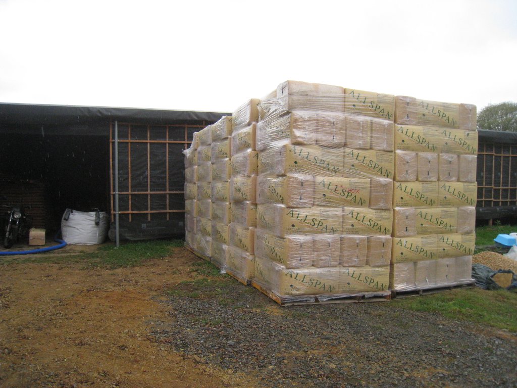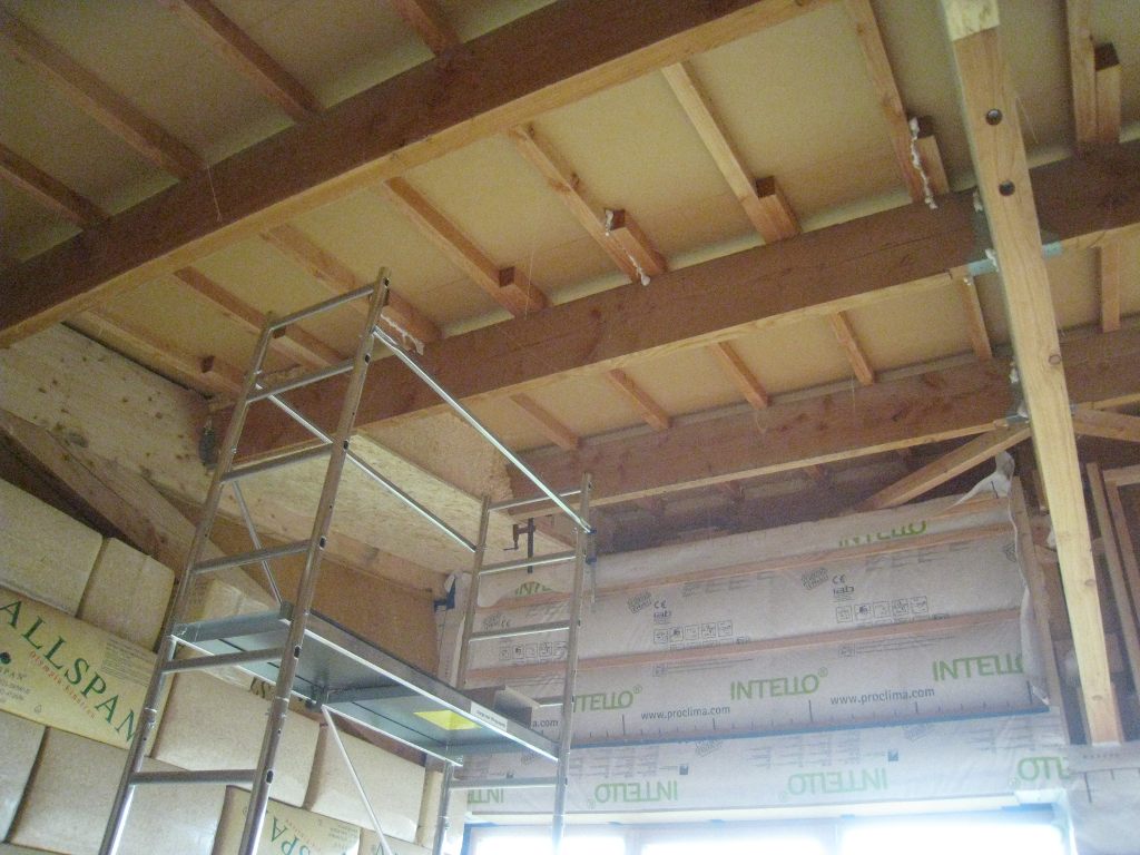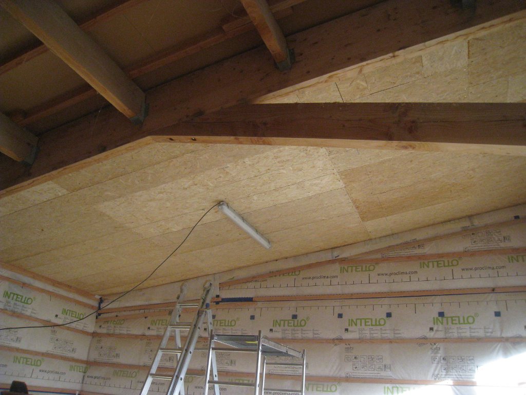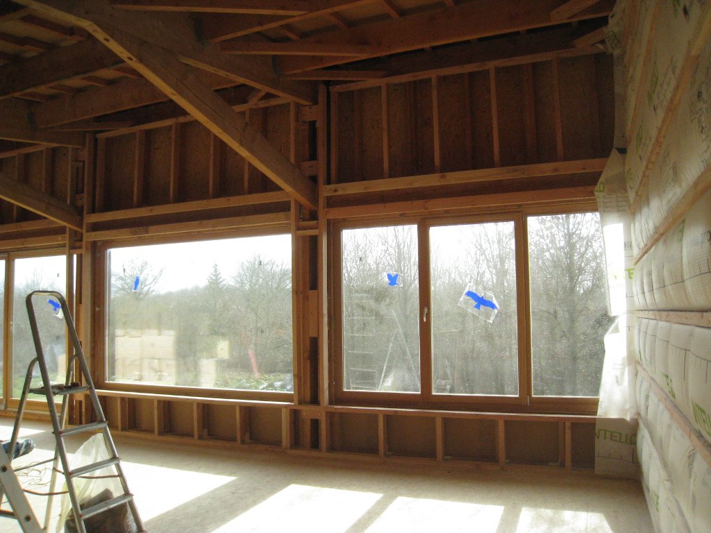 L'isolation de la fin de chaque caisson entre pannes (30cm x 40cm environ) se fait avec de la laine de bois en panneaux souples.