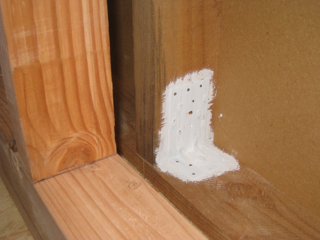Tout d'abord, les pièces métalliques (en particulier les équerres) utilisées pour l'ossature principale, et qui sont donc du côté "froid" du mur, sont recouvertes de peinture anti-condensation.