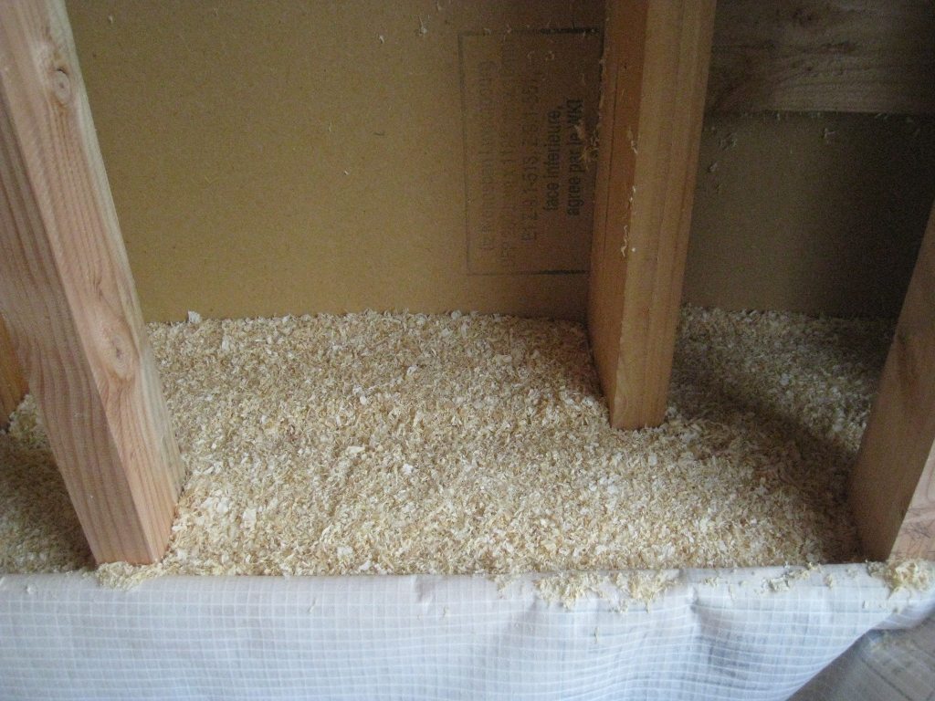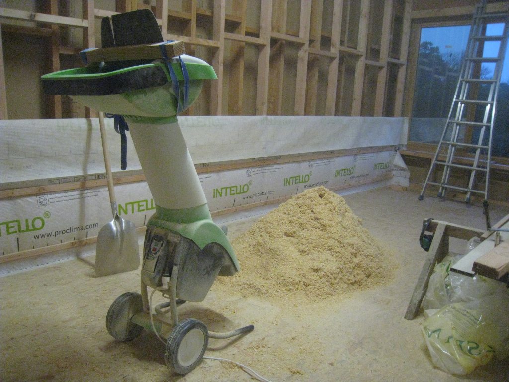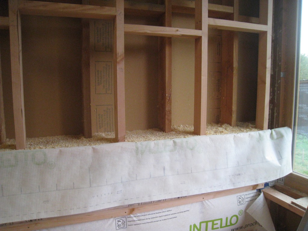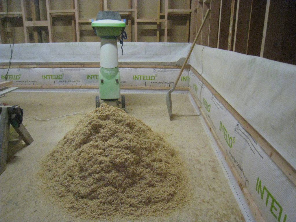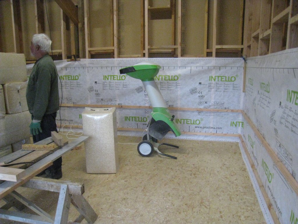 Puis on les verse dans les murs en petites couches d'une dizaine de centimètres, en les compressant à 120 kg/m3.