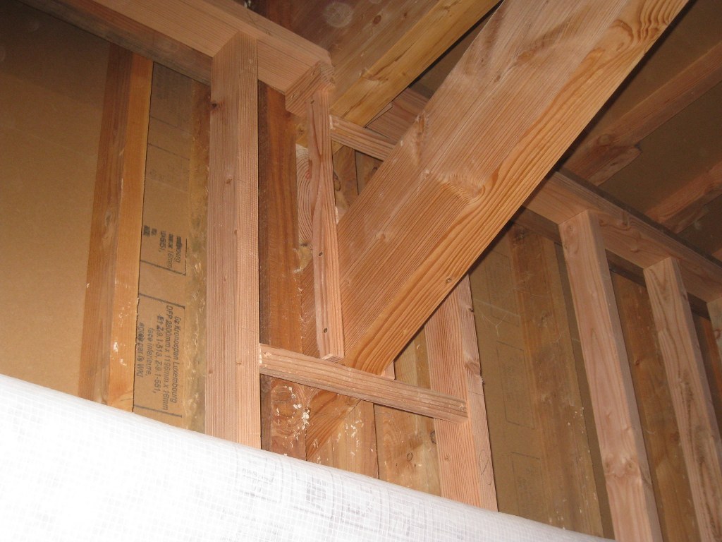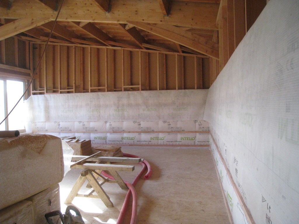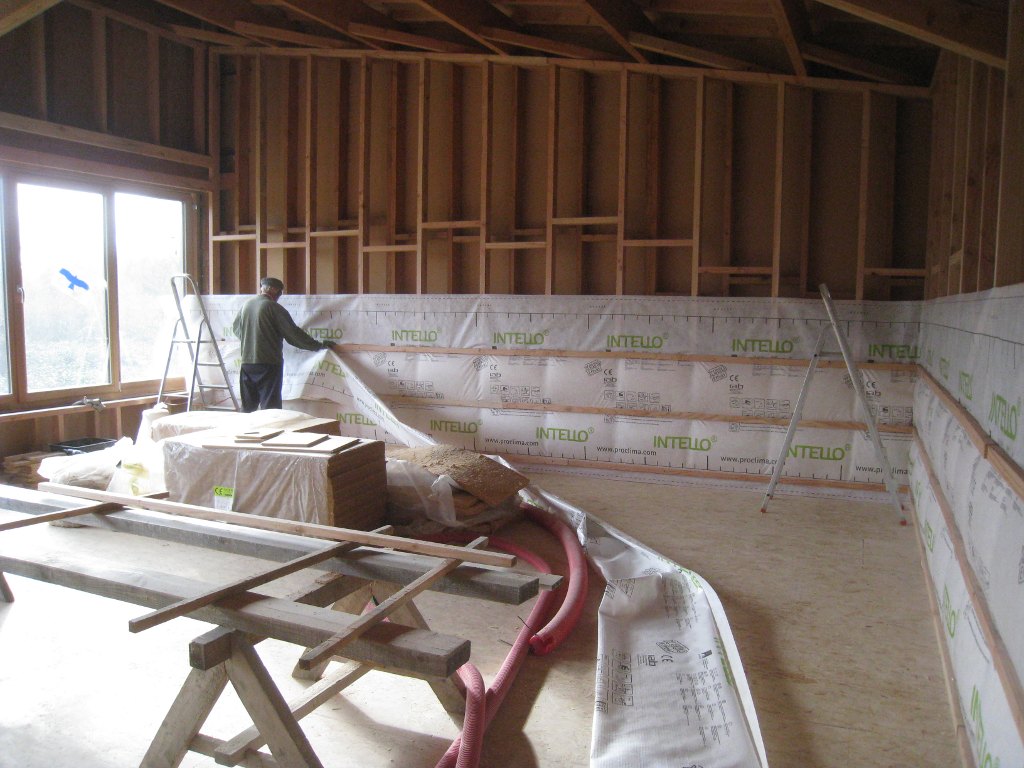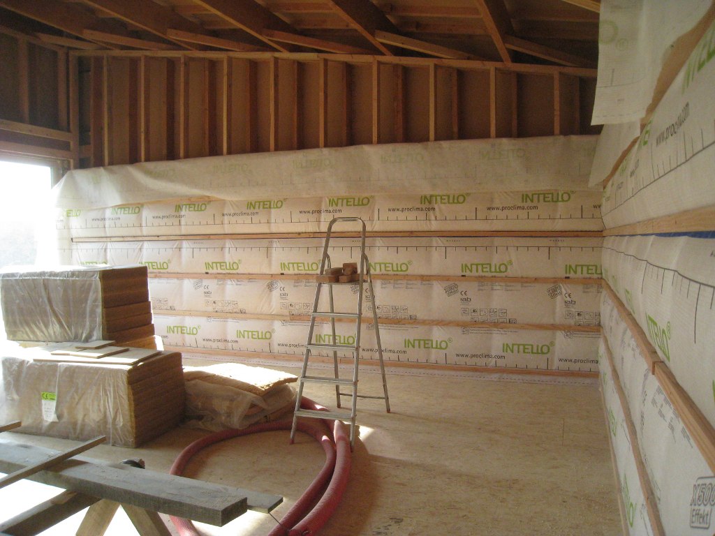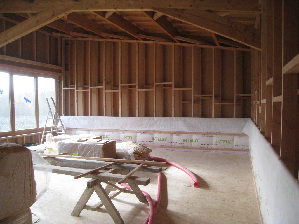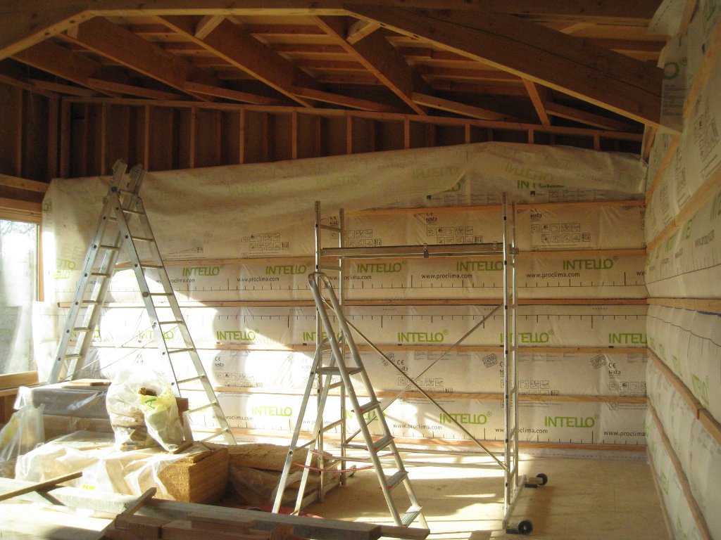 2012/02/04 : Isolation (8)Mis à jour : 24 février 2016 | Imprimer | Affichages : 2434Isolation des murs Nord et Ouest : Après deux petites semaines de repos, nous reprenons l'isolation des murs : Le travail sur les murs progresse plus vite que le plafond : Détail du traitement d'une jambe de force :