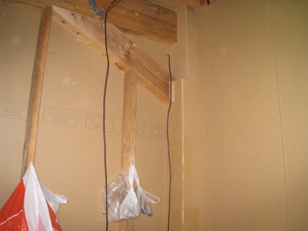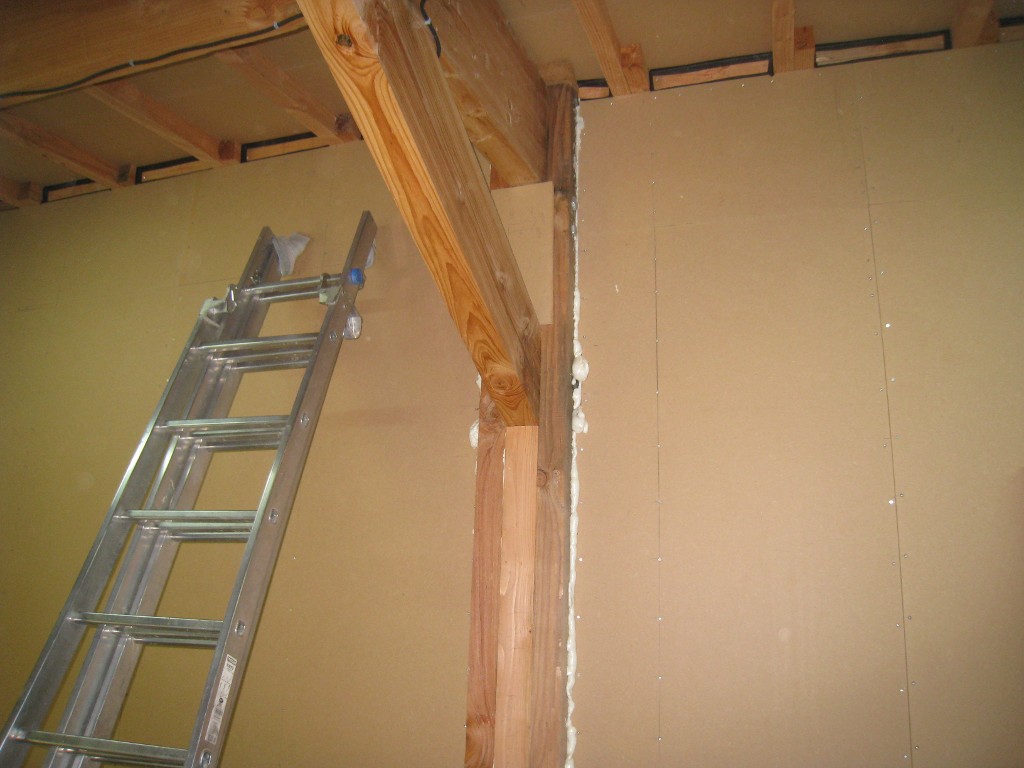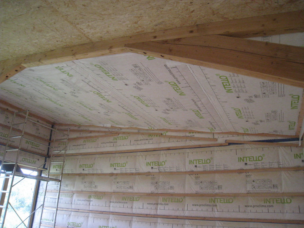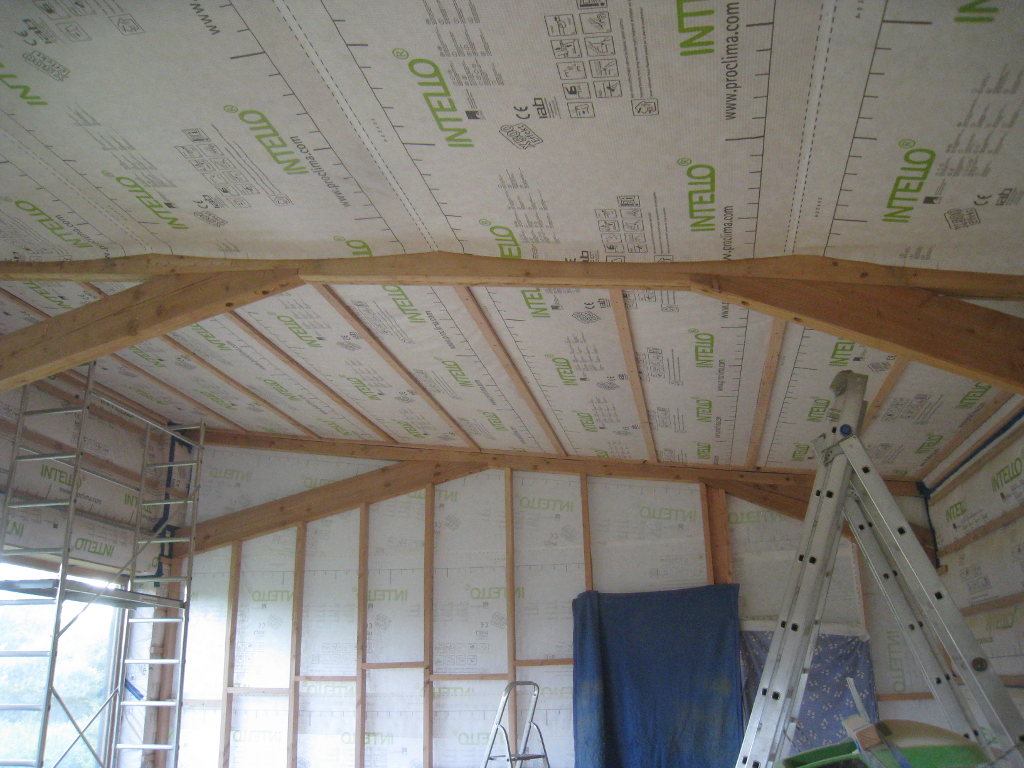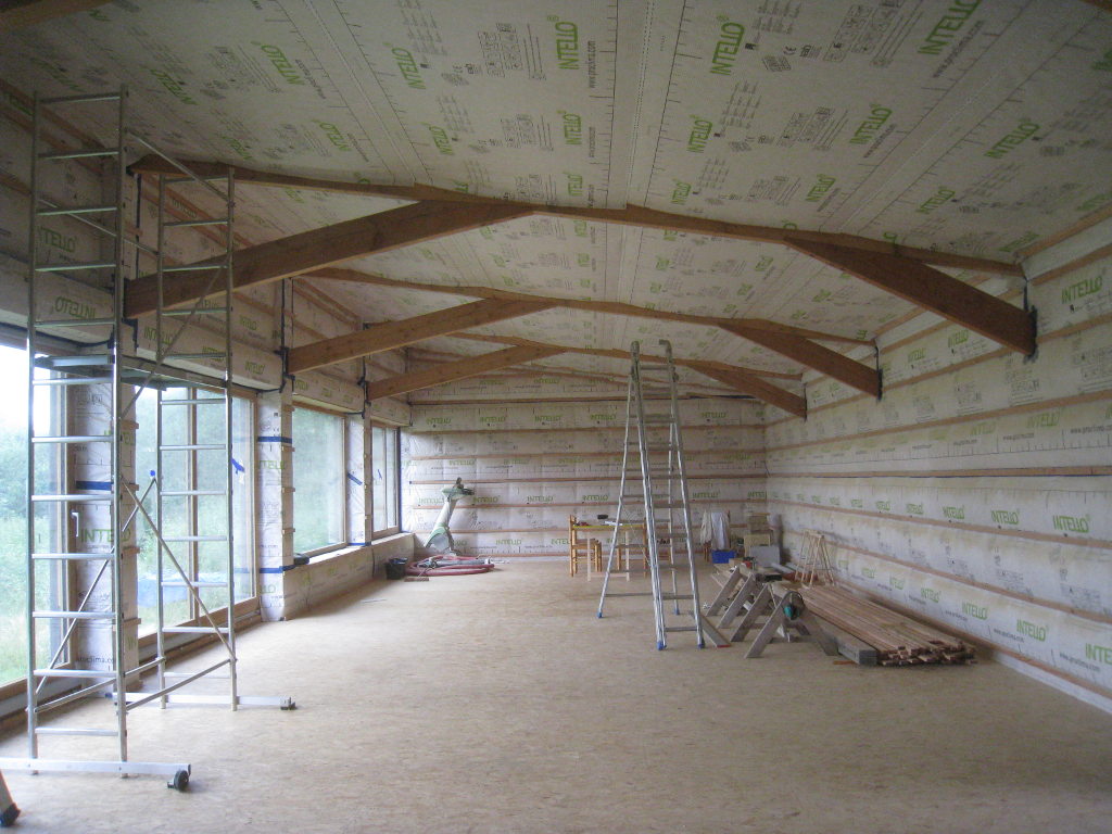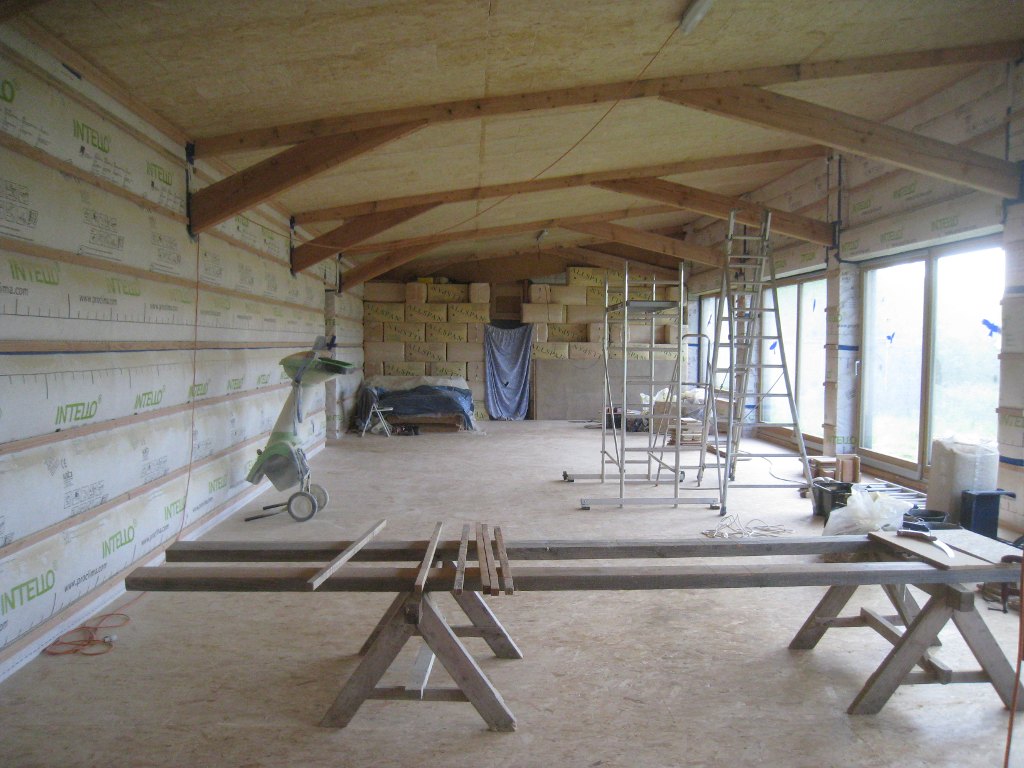 Dans l'atelier, les poteaux moisés des fermes recoivent une isolation complémentaire par l'extérieur.