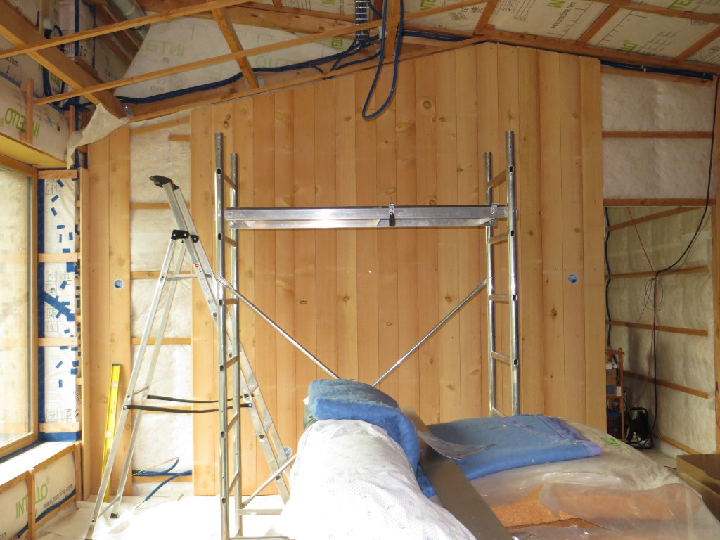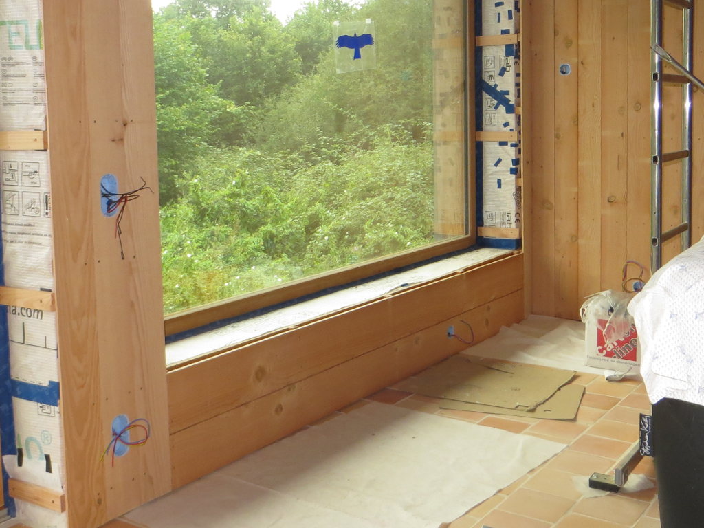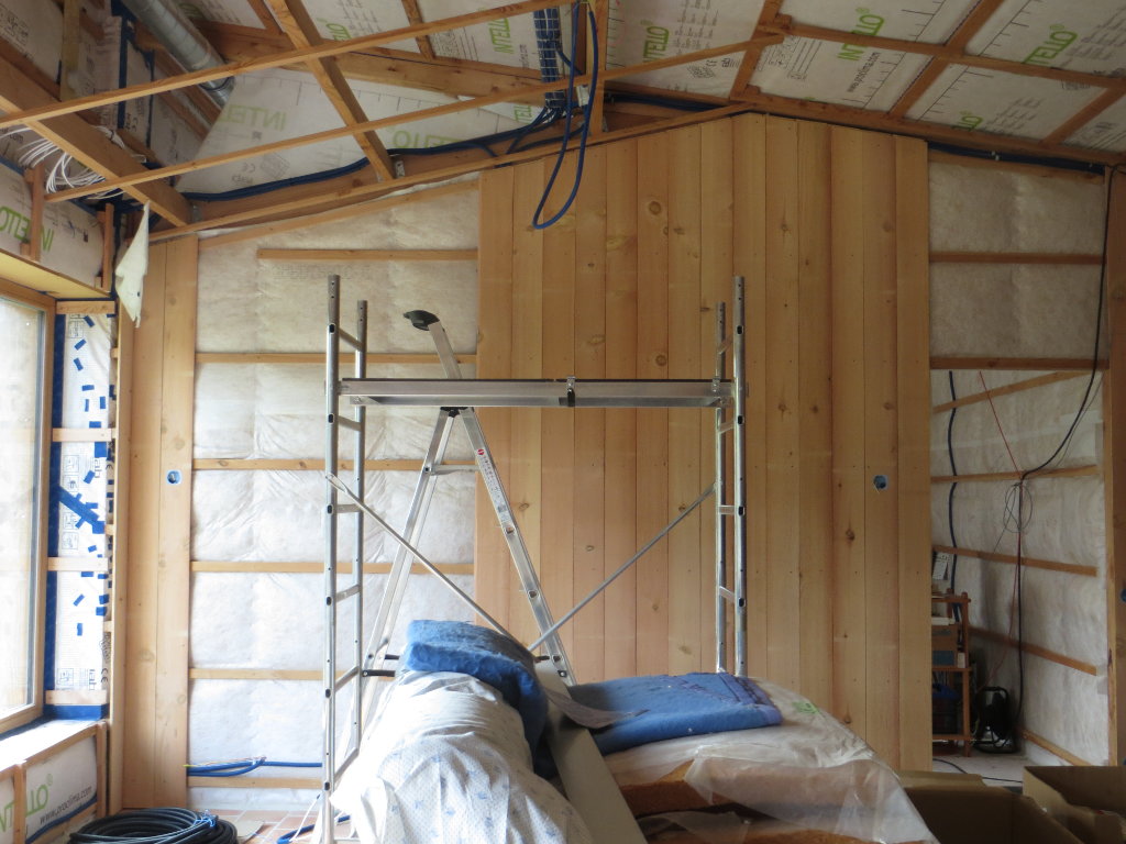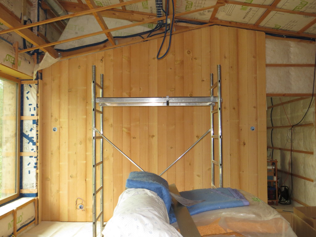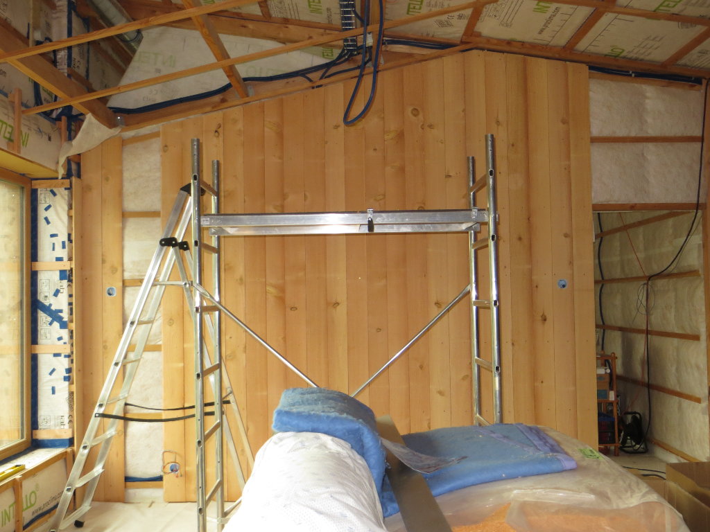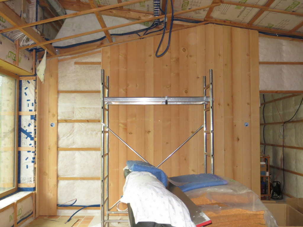 2015/08/17 : Lambris (12) - Grande salle (e-)Mis à jour : 27 novembre 2016 | Imprimer | Affichages : 1814 Dans la grande salle (mur Ouest), pose du lambris aux emplacements des prises et interrupteurs ... En détail : Espace entre l'arrière-cuisine et la chambre n°1 : Sous la baie fixe : Précédent Suivant
