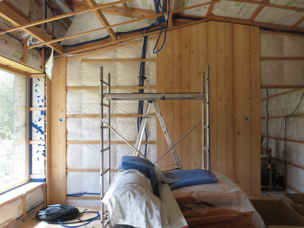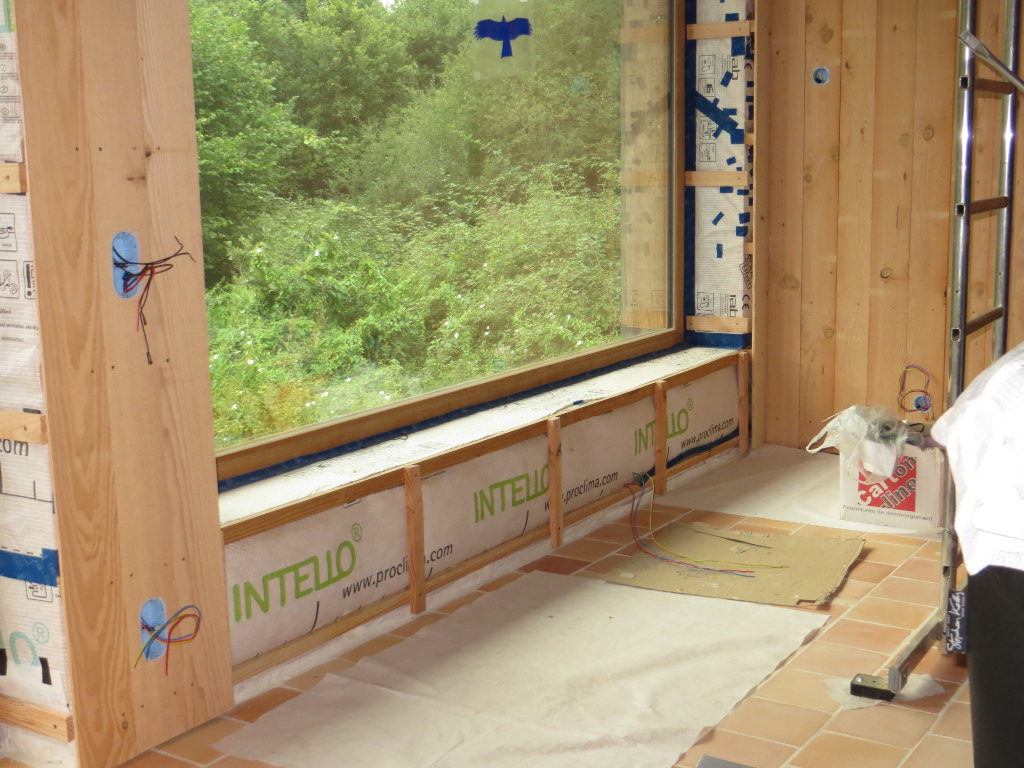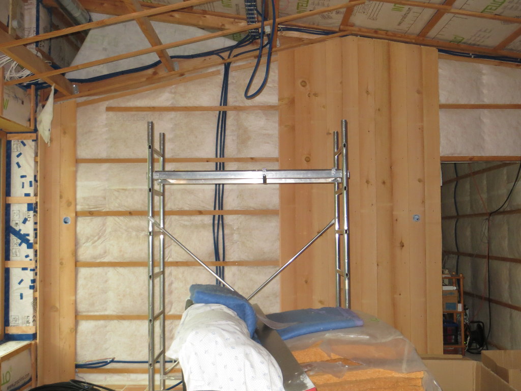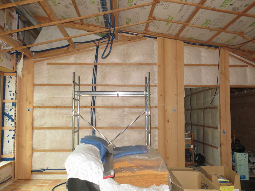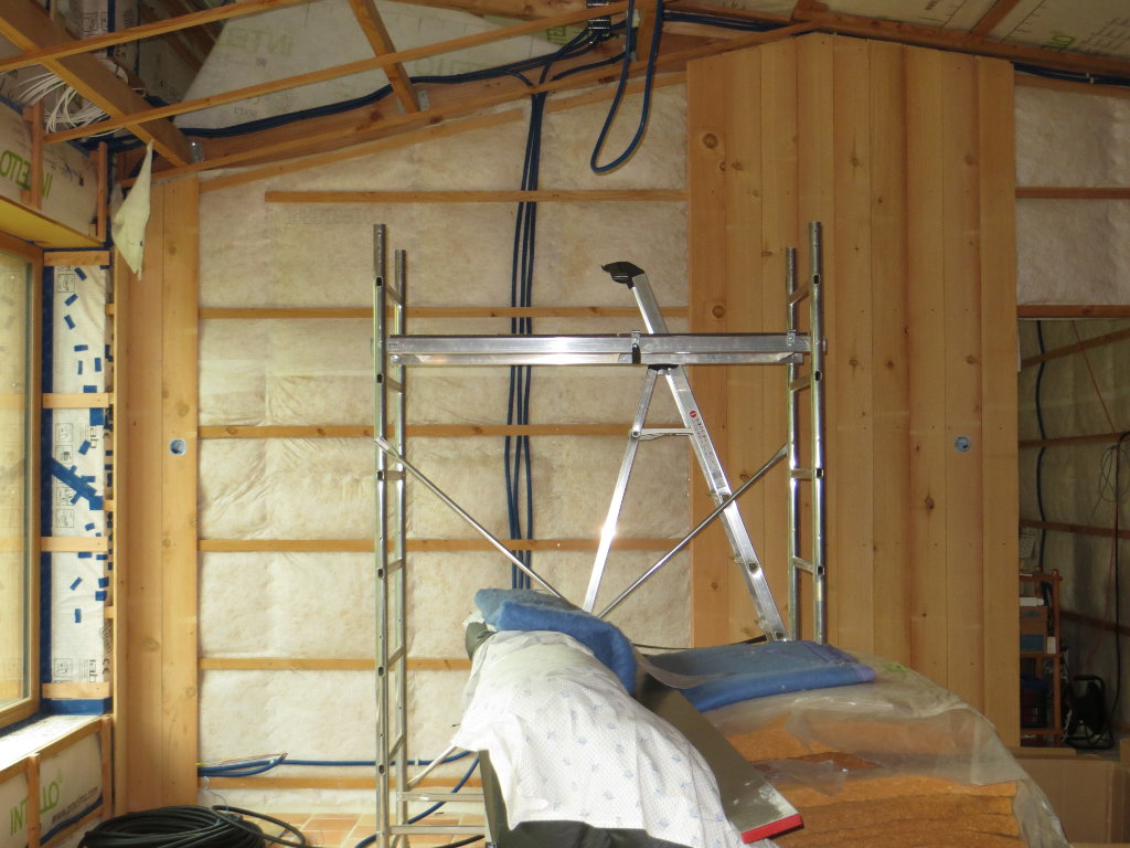 2015/08/17 : Lambris (12) - Grande salle (e-)Mis à jour : 27 novembre 2016 | Imprimer | Affichages : 1814 Dans la grande salle (mur Ouest), pose du lambris aux emplacements des prises et interrupteurs ... En détail : Espace entre l'arrière-cuisine et la chambre n°1 : Sous la baie fixe : Précédent Suivant