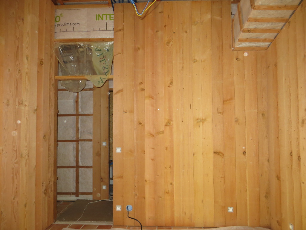2015/10/21 : Lambris (19) - Chambre n°3 (murs)Mis à jour : 27 novembre 2016 | Imprimer | Affichages : 2083 Dans la chambre n°3, fin de la pose du lambris sur les murs ... Sur le mur Nord : Sur le mur Ouest : Sur le mur Est : Il reste l'encadrement de la fenêtre, et le plafond ... Précédent Suivant