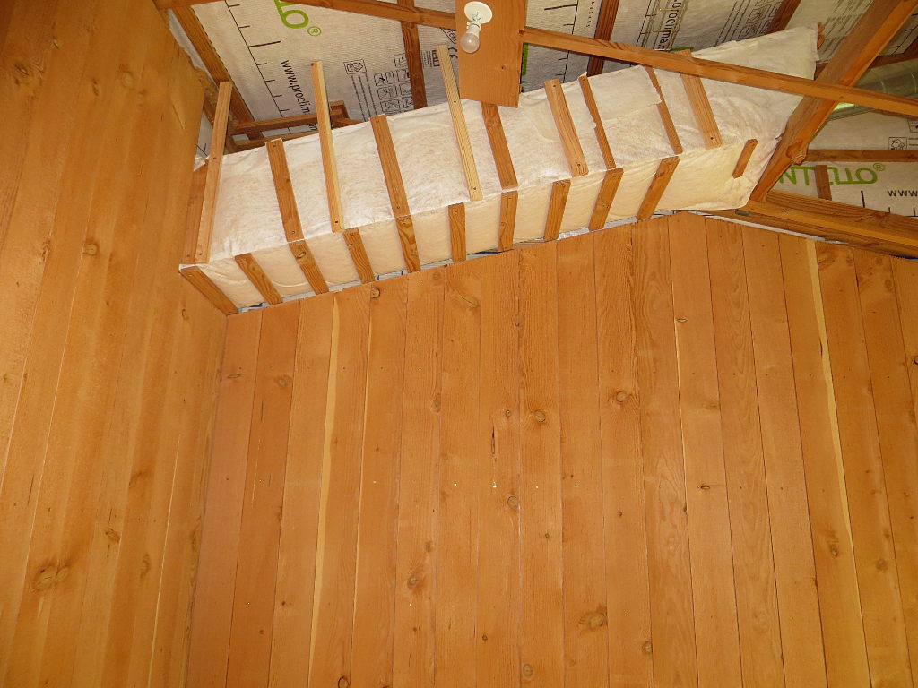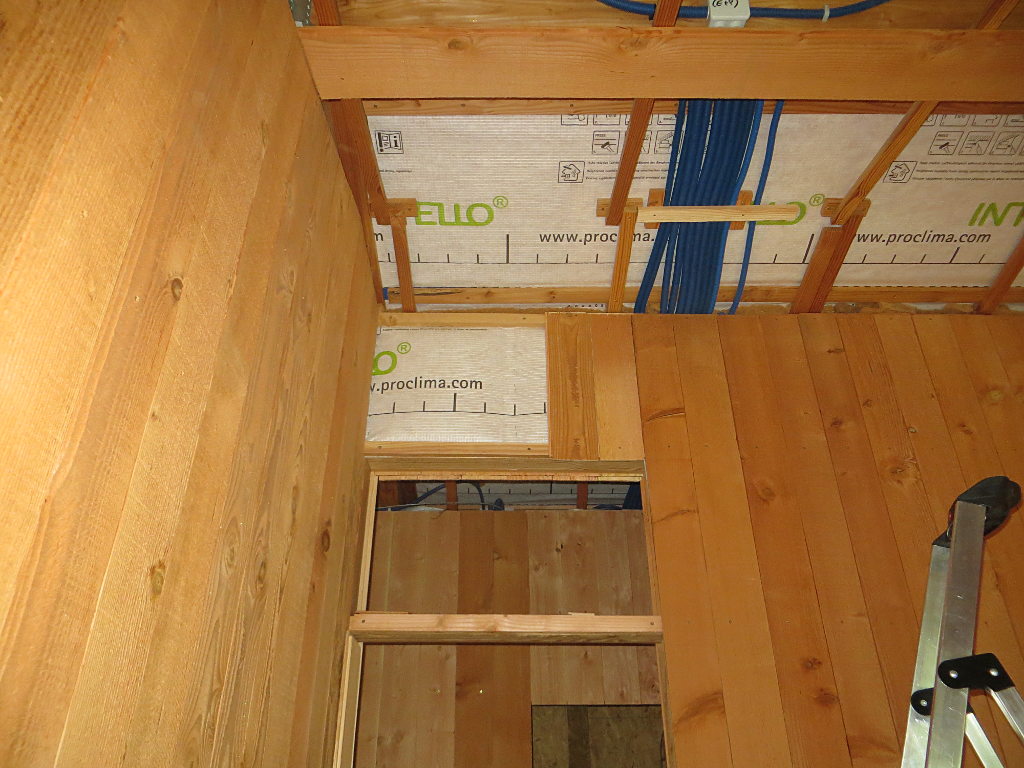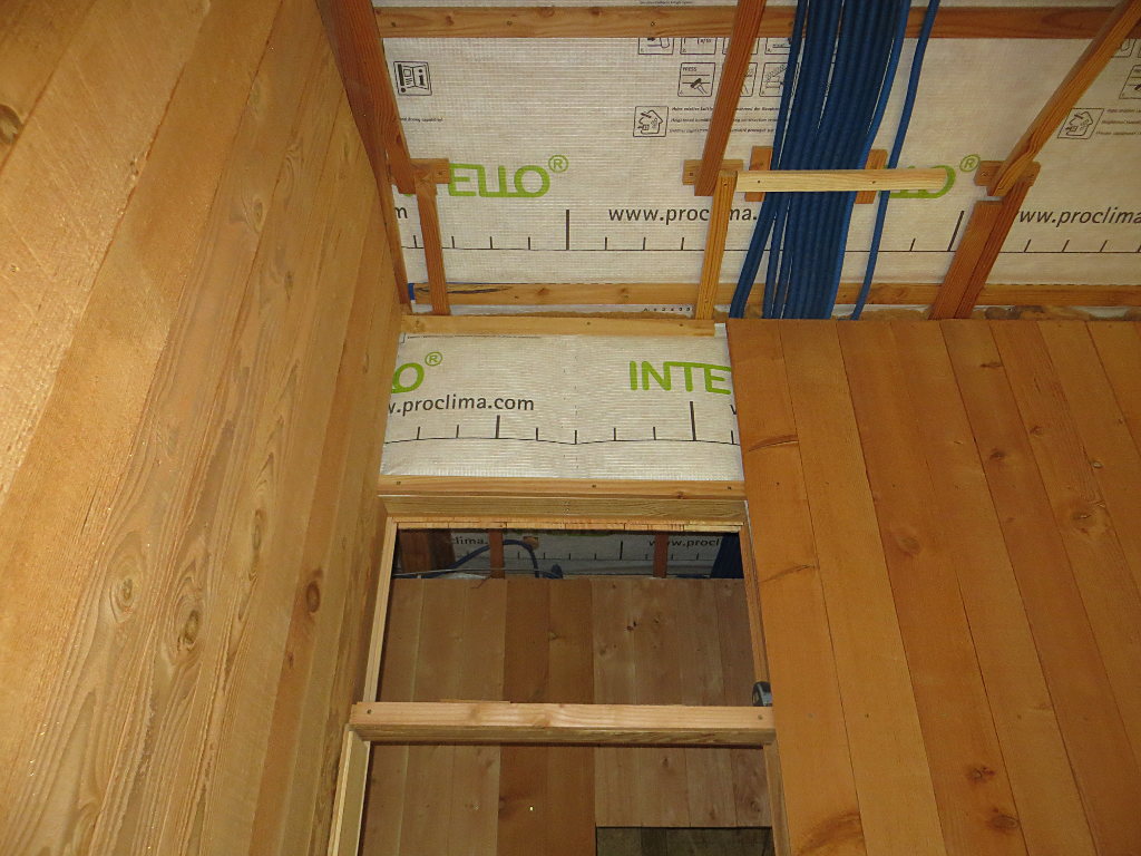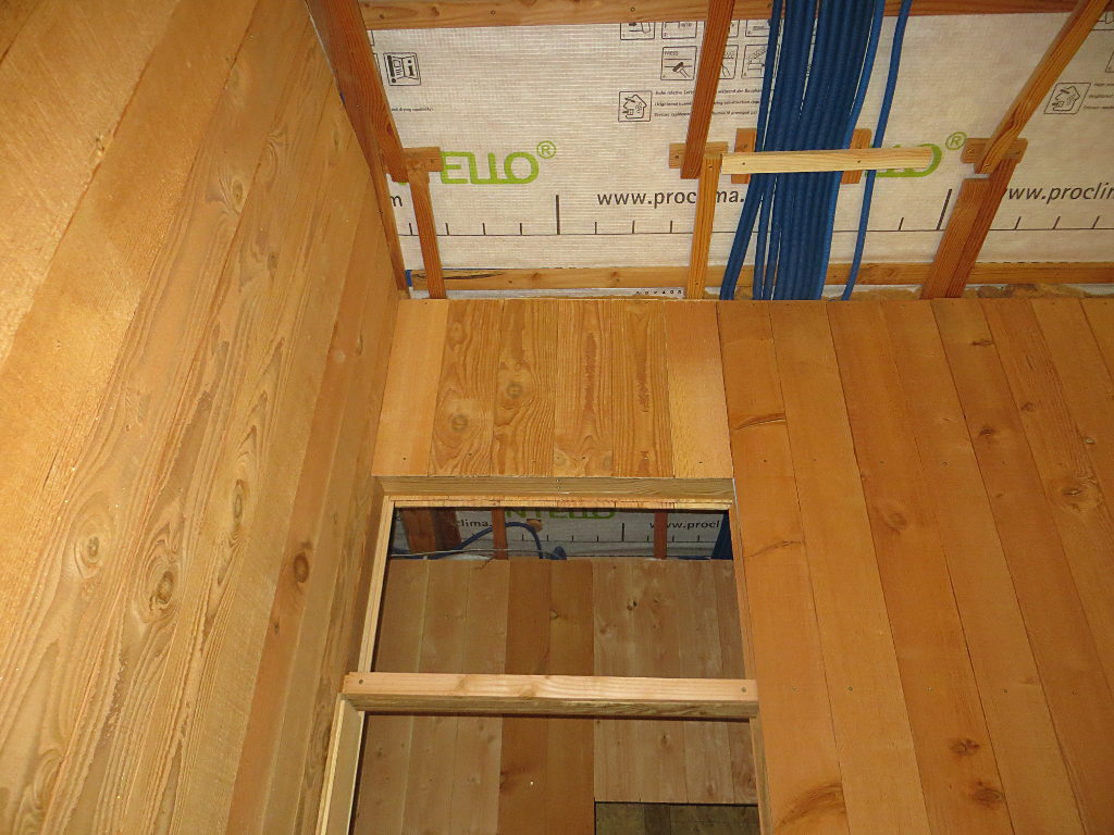 2018/08/14 : Lambris (28) - Chambre n°3 (murs)Mis à jour : 30 septembre 2018 | Imprimer | Affichages : 1197 Dans la chambre n°3, fin de la pose du lambris sur les murs ... Au dessus de la porte d'entrée (Nord) : Encadrement de la porte : Pose du lambris sur le coffrage du tuyau de la VMC : Précédent Suivant