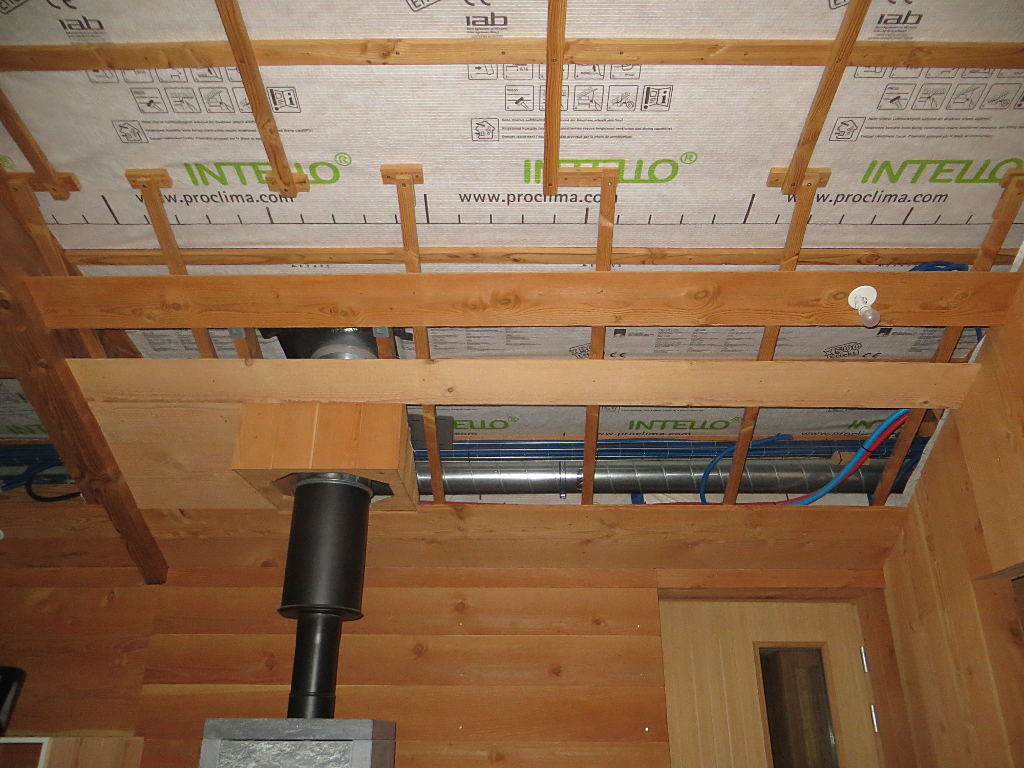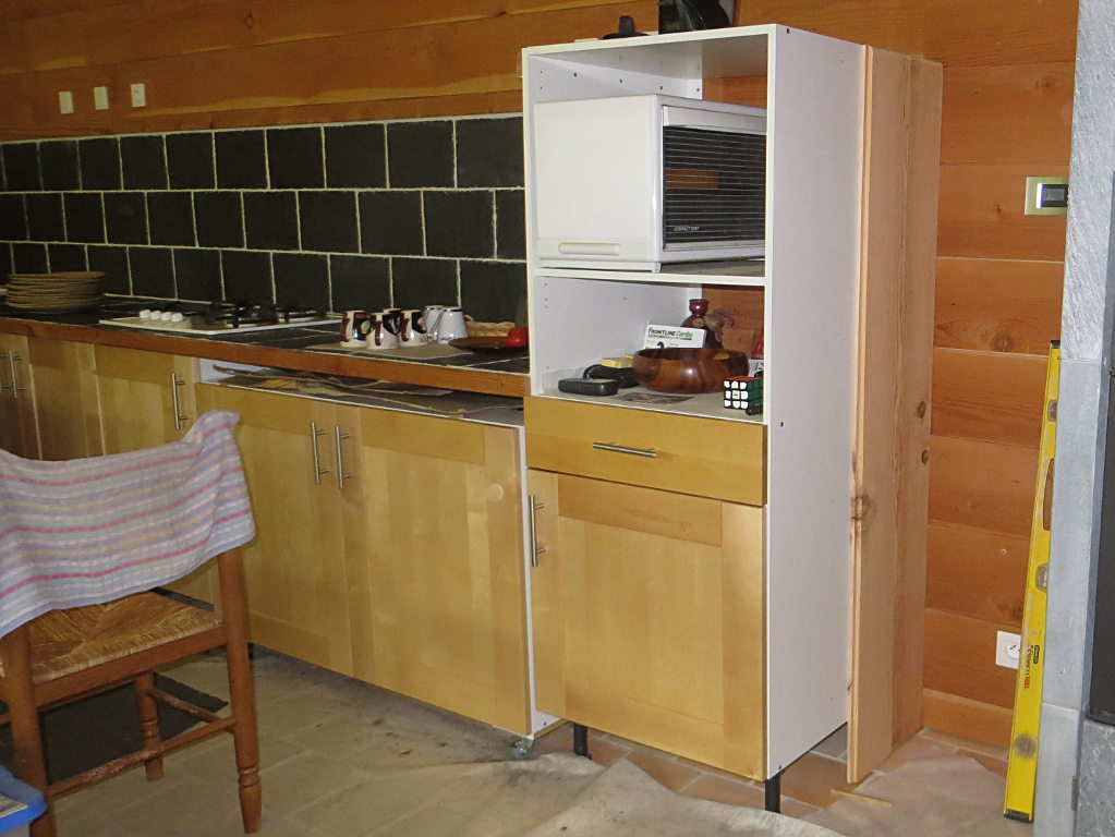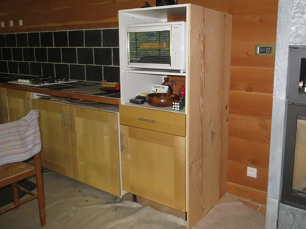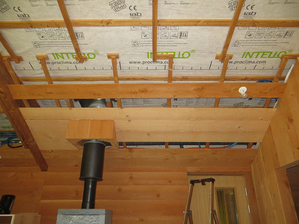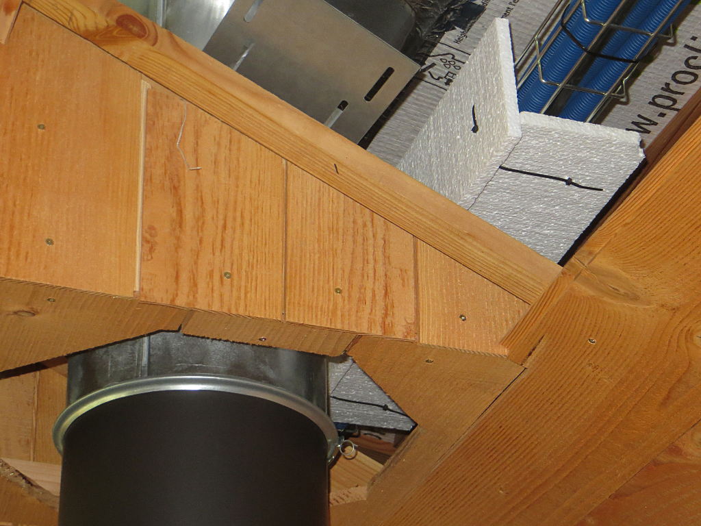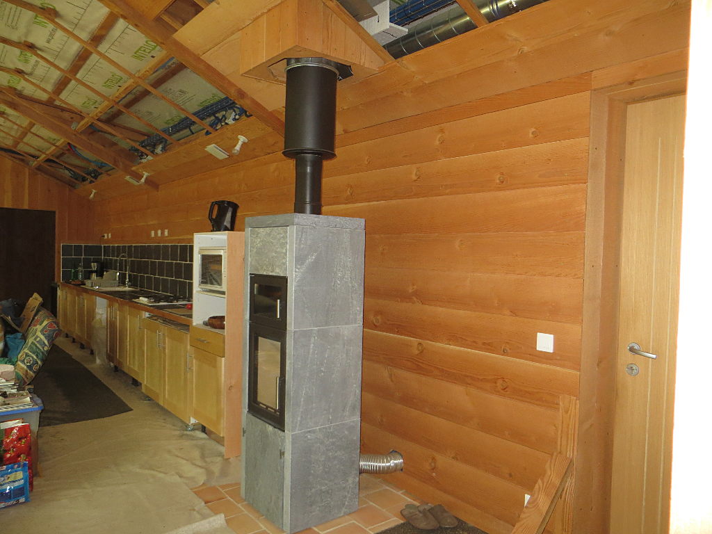2018/09/15 : Lambris (37) - Entrée (plafond)Mis à jour : 28 novembre 2018 | Imprimer | Affichages : 1275 Dans l'entrée, pose du lambris sur le plafond ... Protection thermique avec des chutes d'emballage : À côté du poêle à bois, pose de lambris sur le meuble du four :
