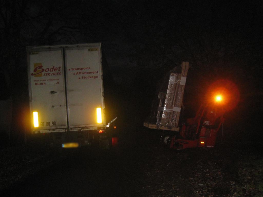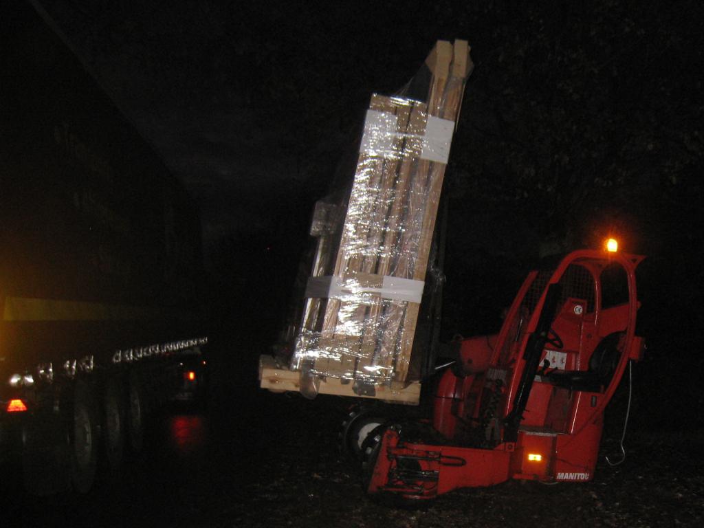 Ce Lundi est un grand jour : dès 8H00, alors que le jour n'est pas encore levé, l'entreprise QueDuBois est à pied d'oeuvre, et le transporteur est aussi au rendez-vous :