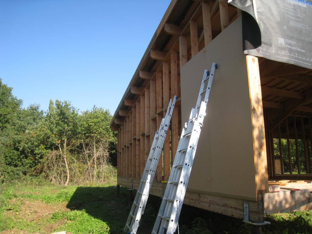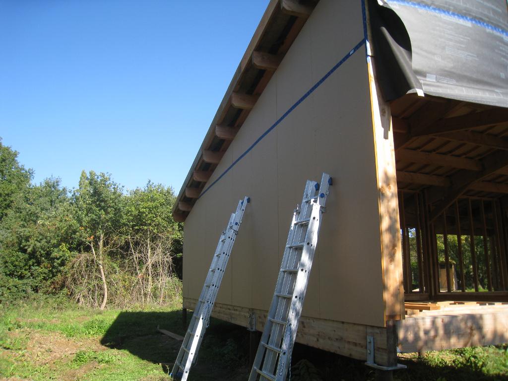 Je commence par isoler les poteaux par l'extérieur avec des panneaux de laine de bois, car ces poteaux constituent des ponts thermiques.