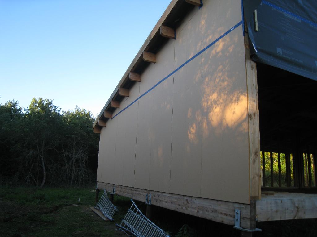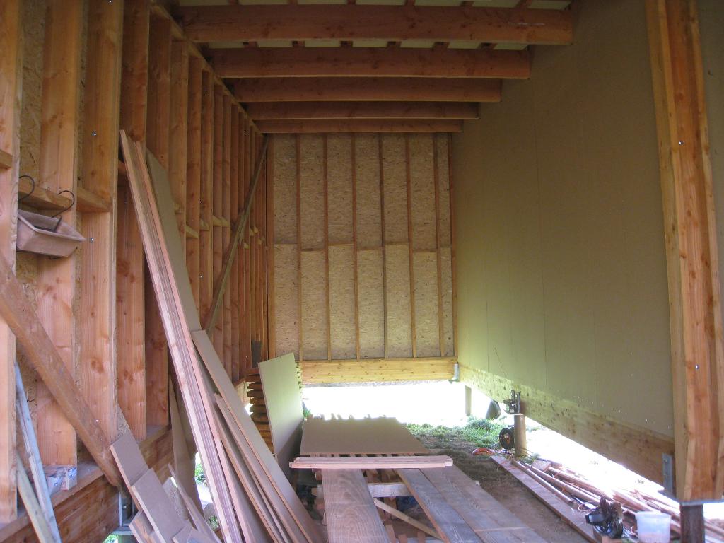 Dans la foulée, je bouche ce qui reste en haut des murs intérieurs, c'est à dire les espaces entre pannes et entre chevrons :
