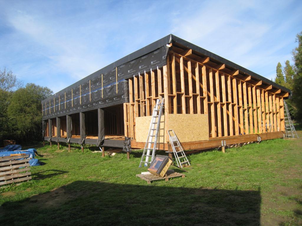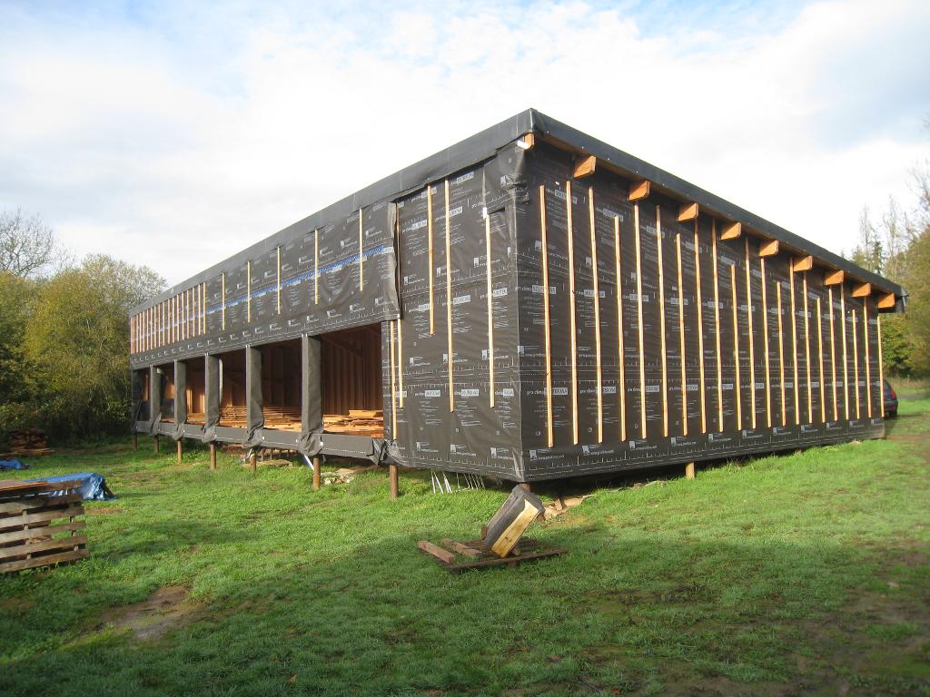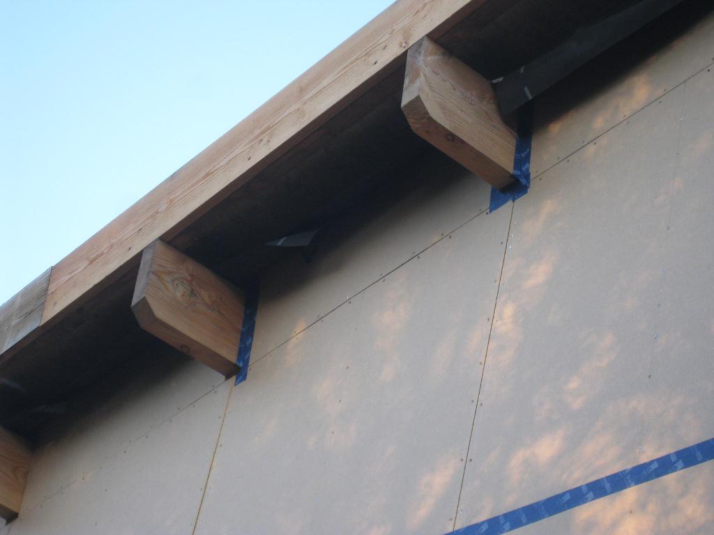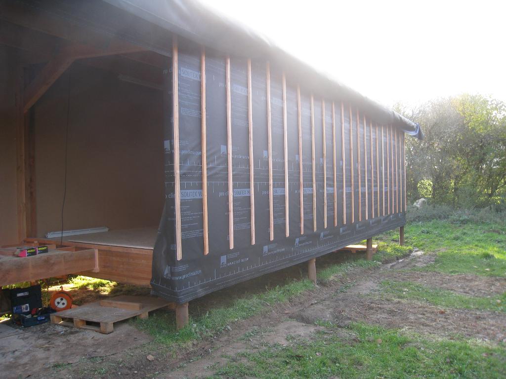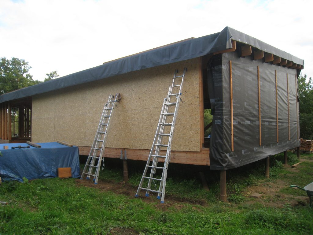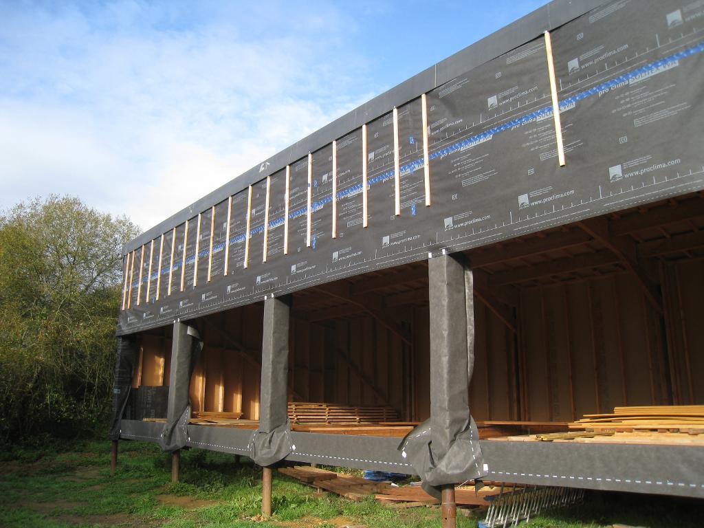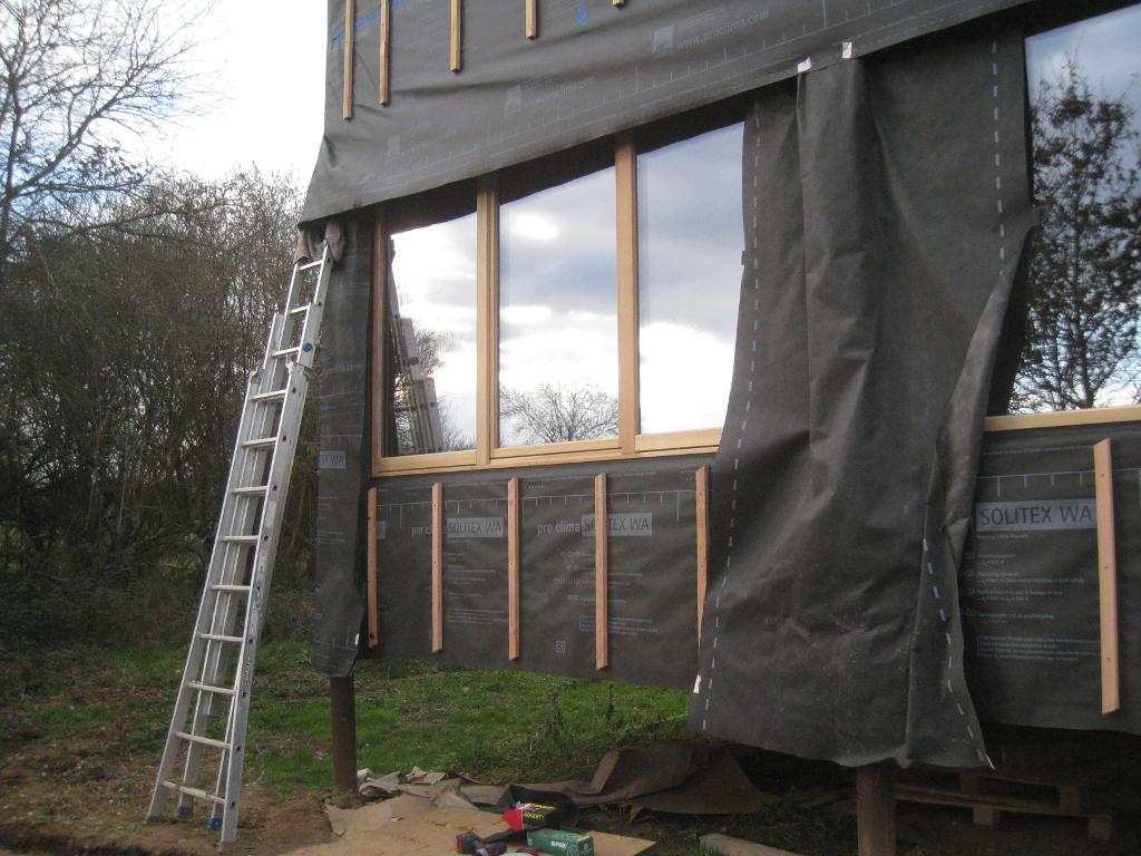 Je profite d'un peu de beau temps pour terminer la mise en place des liteaux de maintient du pare-pluie en façade Sud, au dessus des futures baies vitrées :