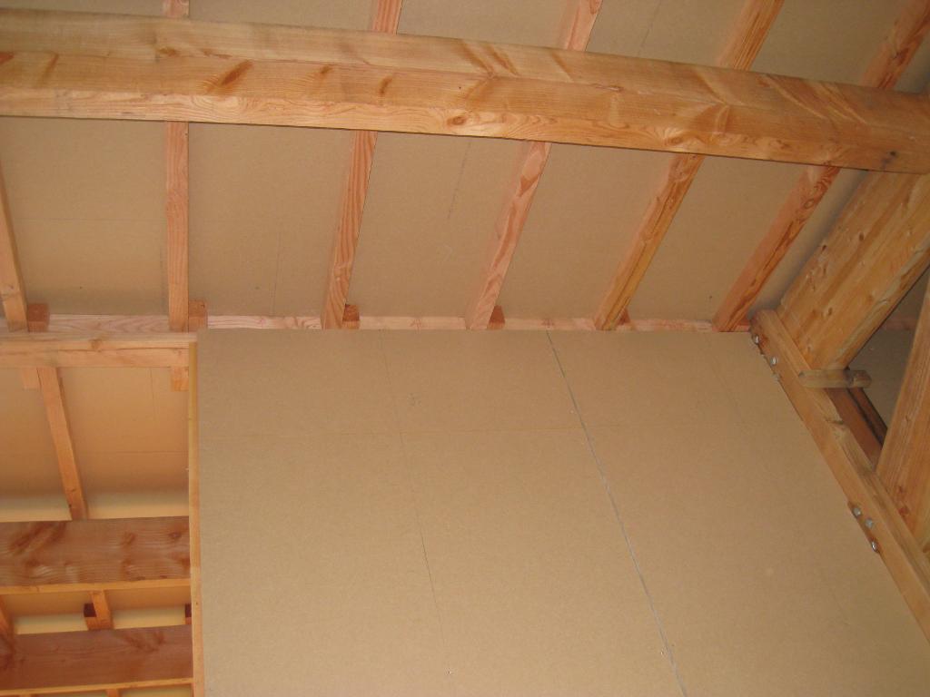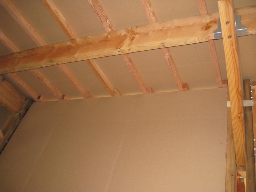 2010/11/09 : Murs intérieurs (2)Mis à jour : 24 février 2016 | Imprimer | Affichages : 2271Dans la foulée, je bouche ce qui reste en haut des murs intérieurs, c'est à dire les espaces entre pannes et entre chevrons : En détail :