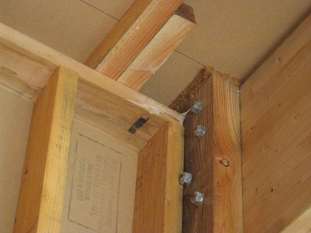 Les poteaux moisés qui sépare la maison de l'atelier et de la buanderie ne touchent pas, en haut les panneaux DFP qui constituent le plafond.