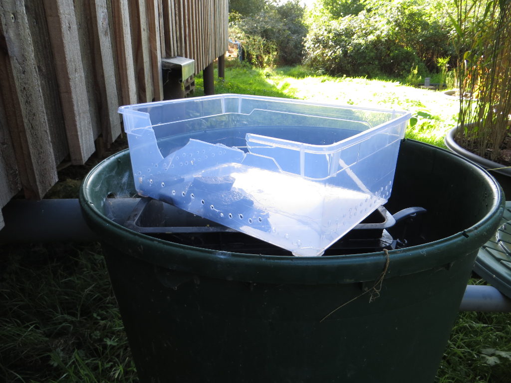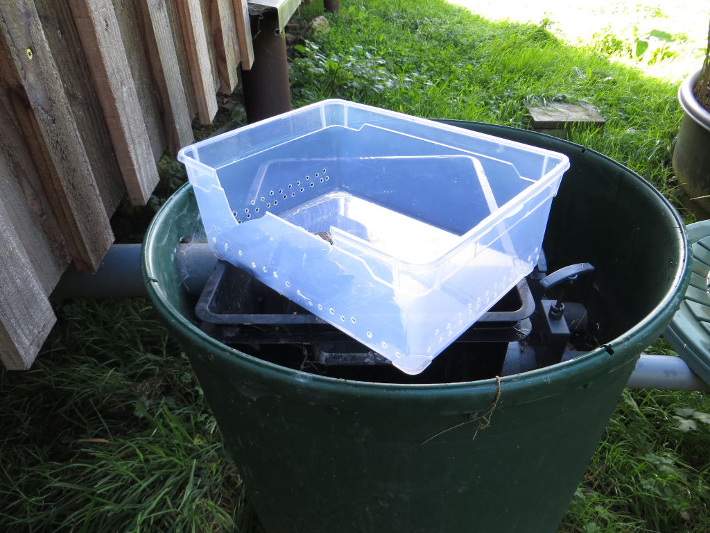 Je décide donc de placer un autre bac par dessus, facilement démontable, dont les trous d'écoulement sont à environ deux centimètres au dessus du fond. Ainsi, j'espère que les particules graisseuses s'accumuleront dans ce nouveau bac, facile à enlever et à nettoyer.