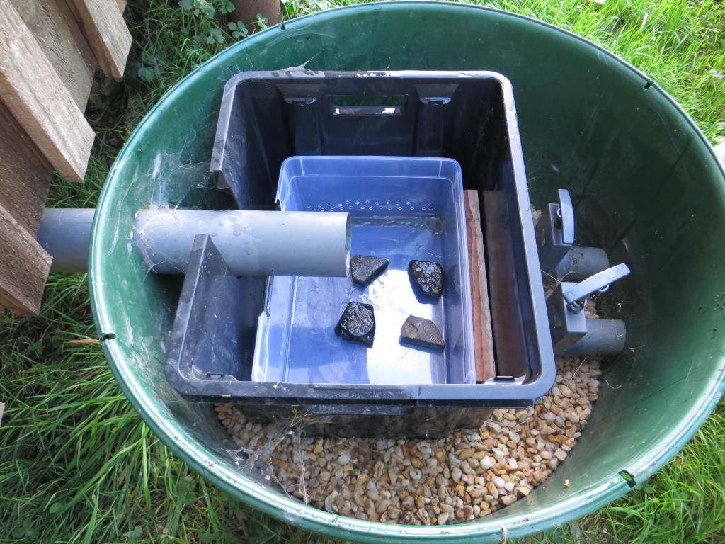 Le fond du bac (en noir) du filtre à paille voit avec le temps s'accumuler des petites particules graisseuses.