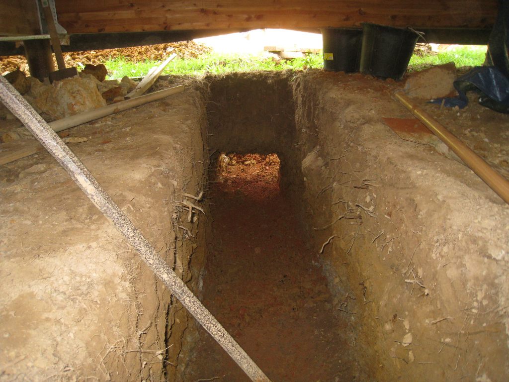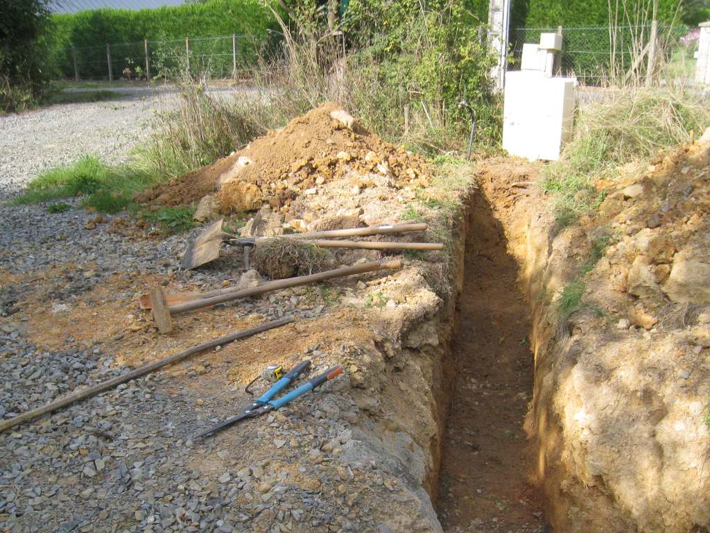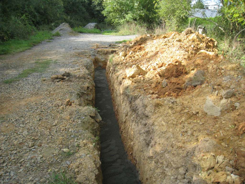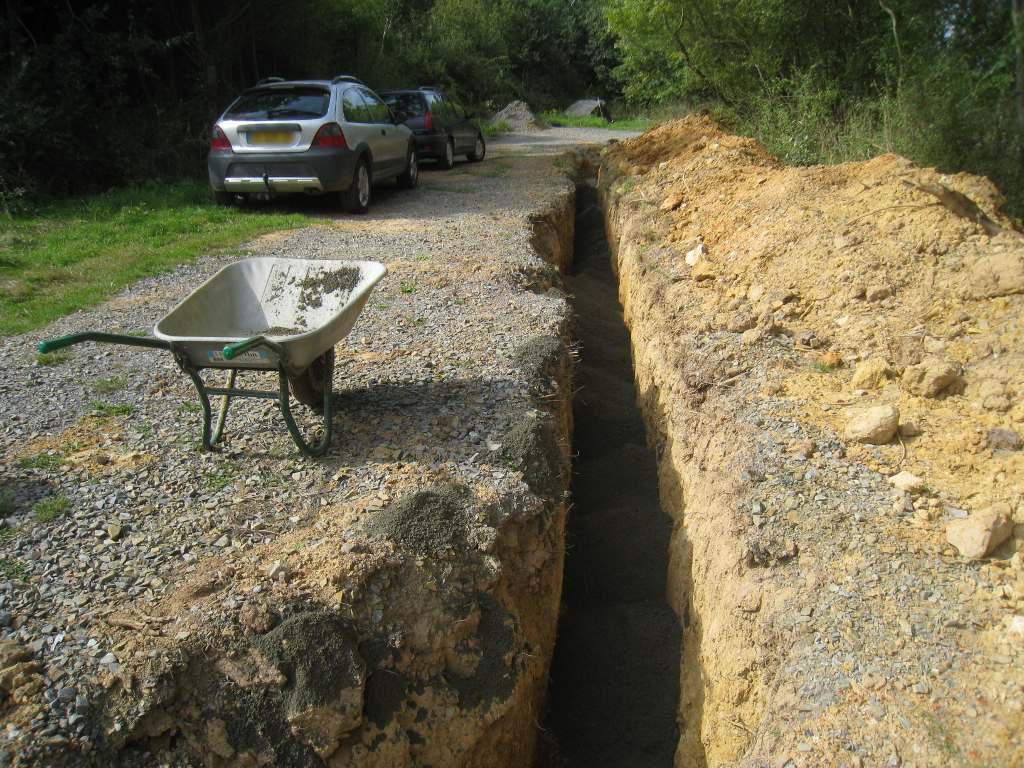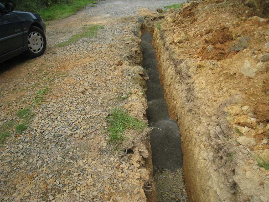 Le fond de la tranchée est cette fois à peu près sec. Nous stabilisons les endroits douteux avec des cailloux et des graviers :