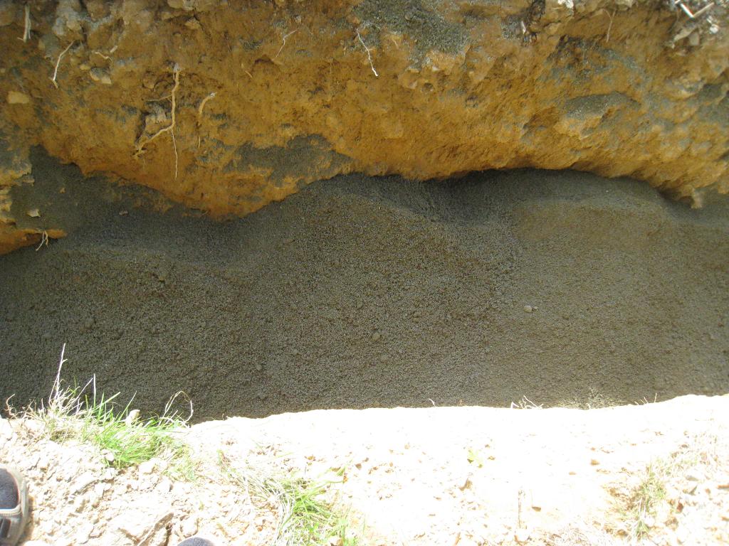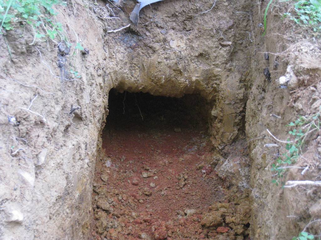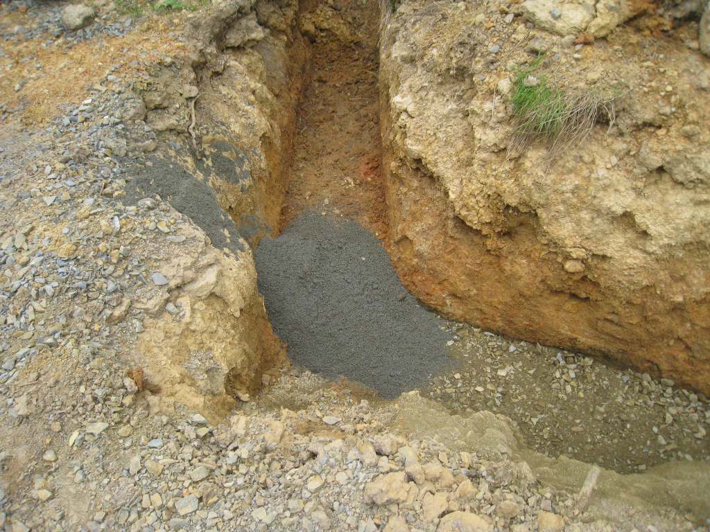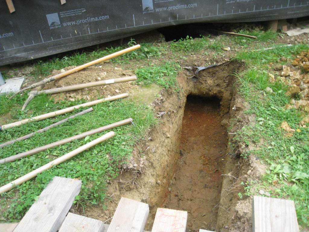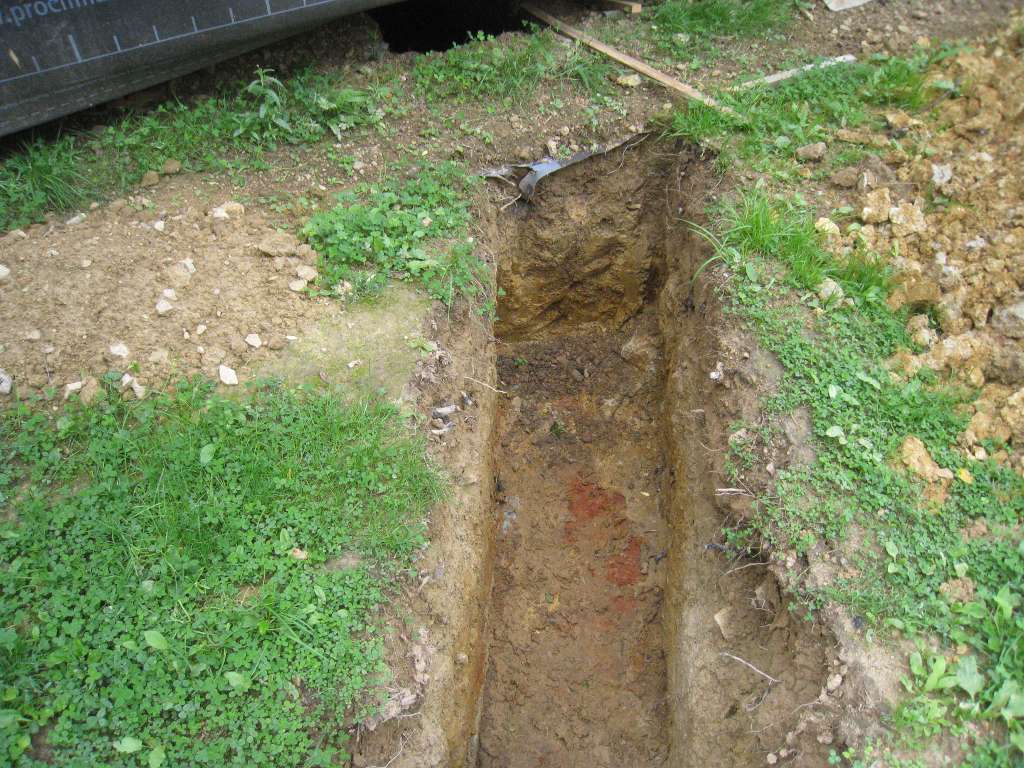 Le fond de la tranchée est cette fois à peu près sec. Nous stabilisons les endroits douteux avec des cailloux et des graviers :