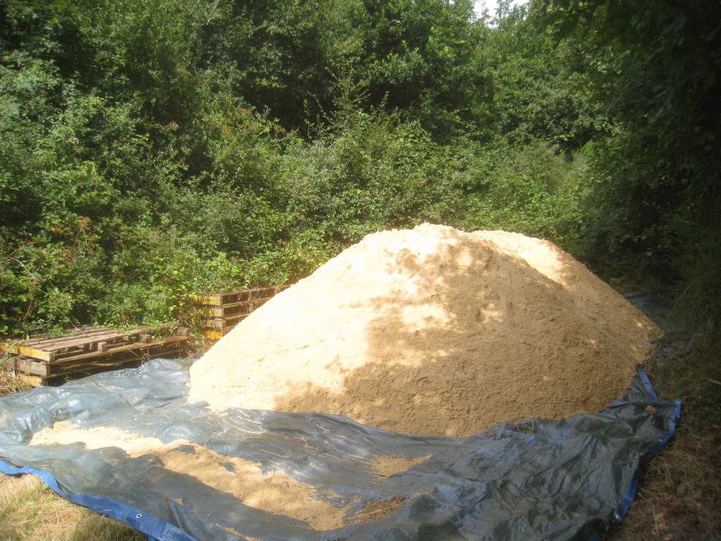 Les 22 tonnes de sable 0-4 et les 2.6 tonnes de chaux NHL5 sont d'ors et déjà sur place :