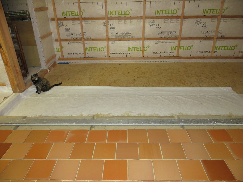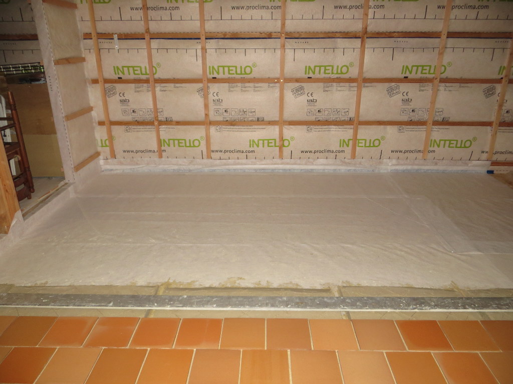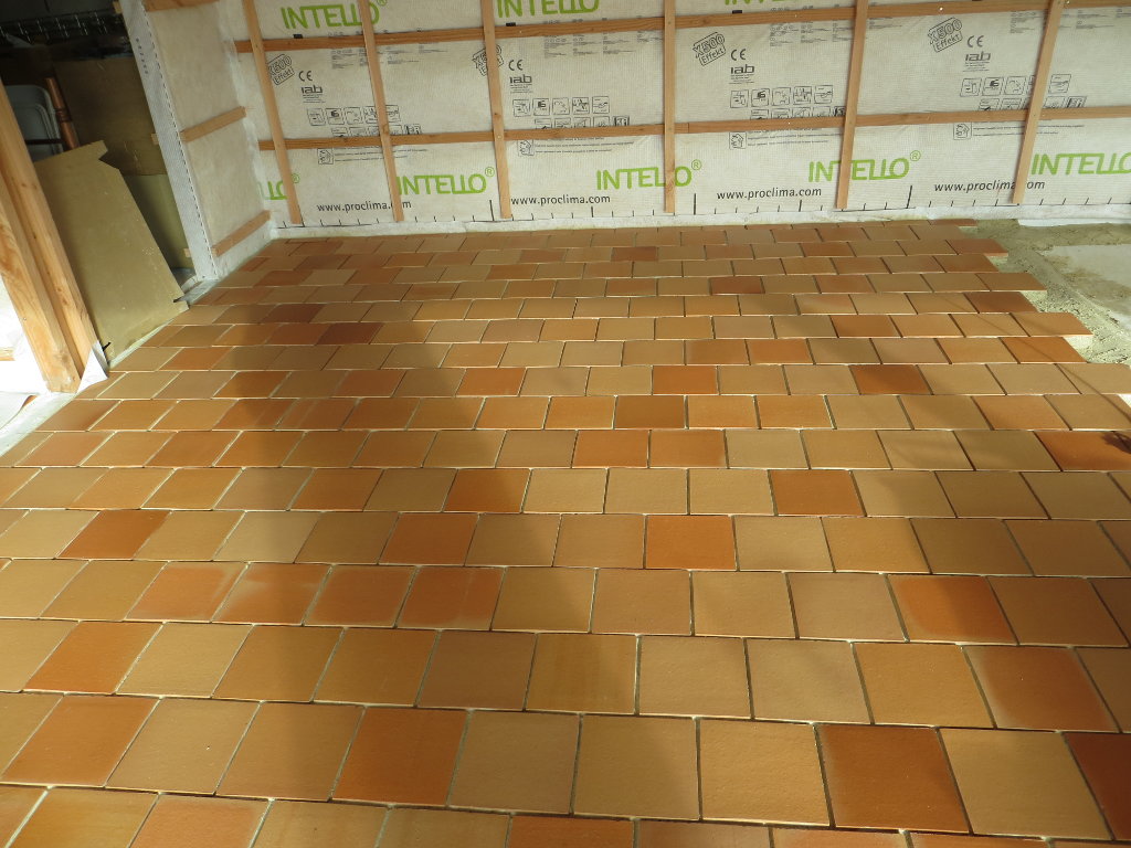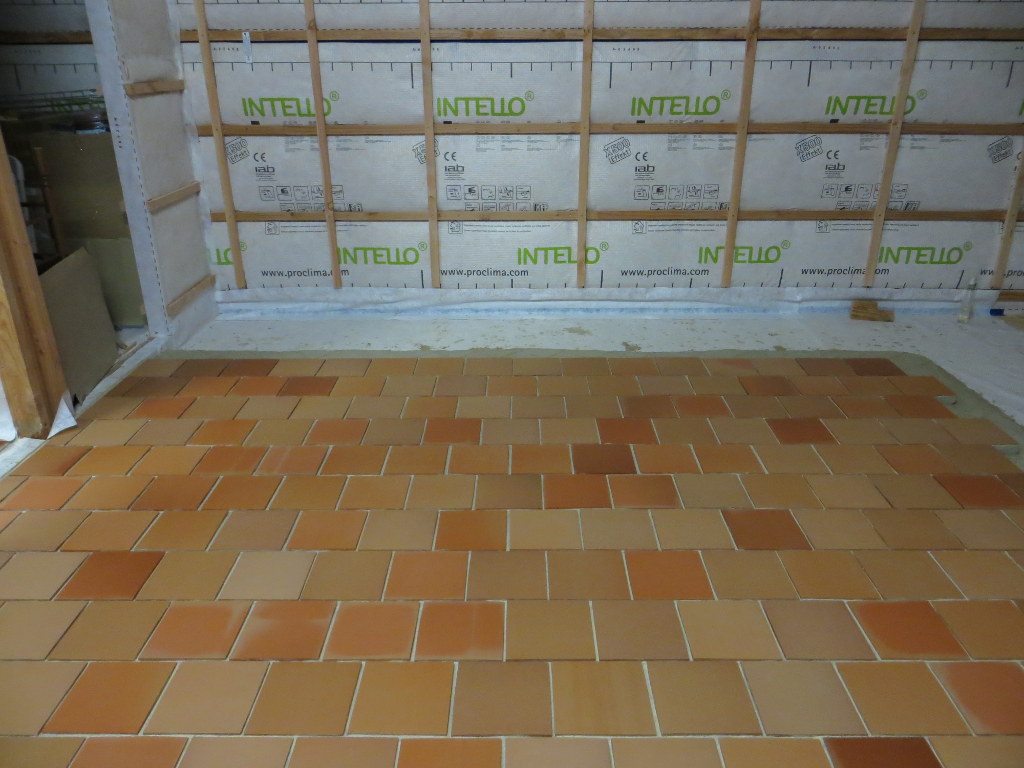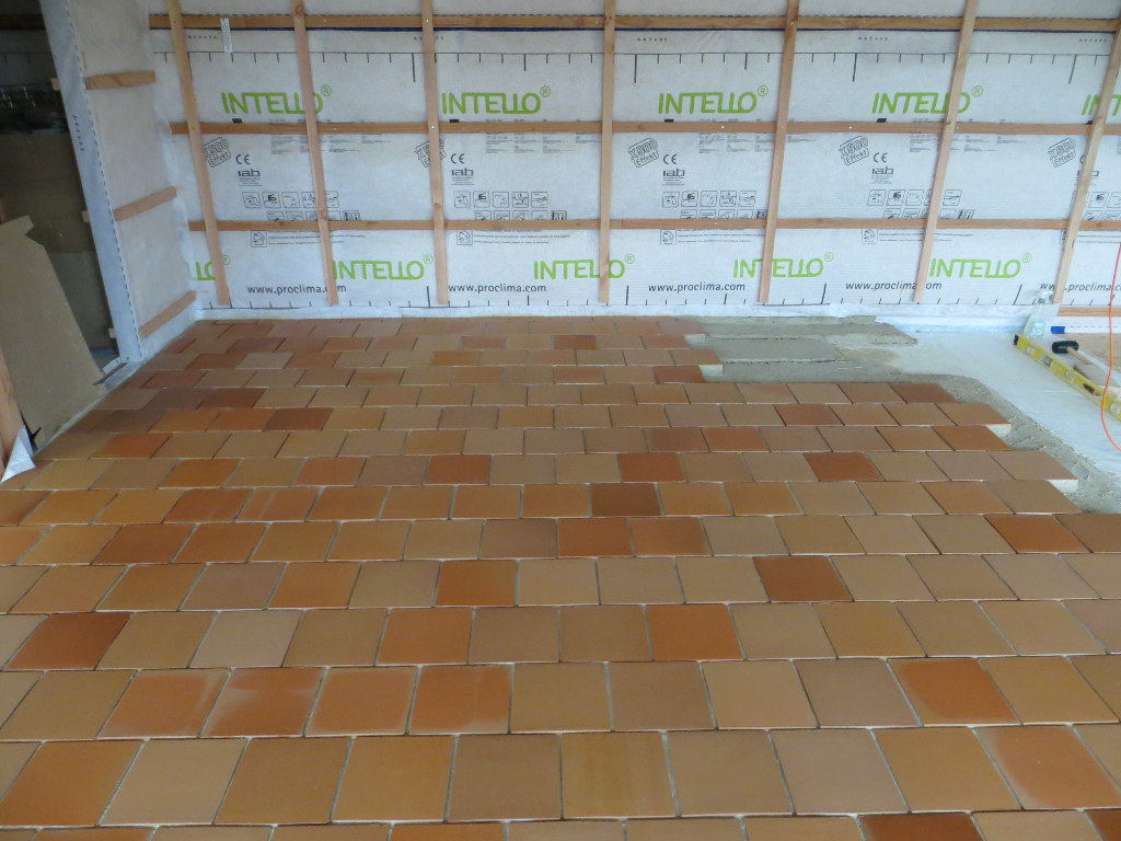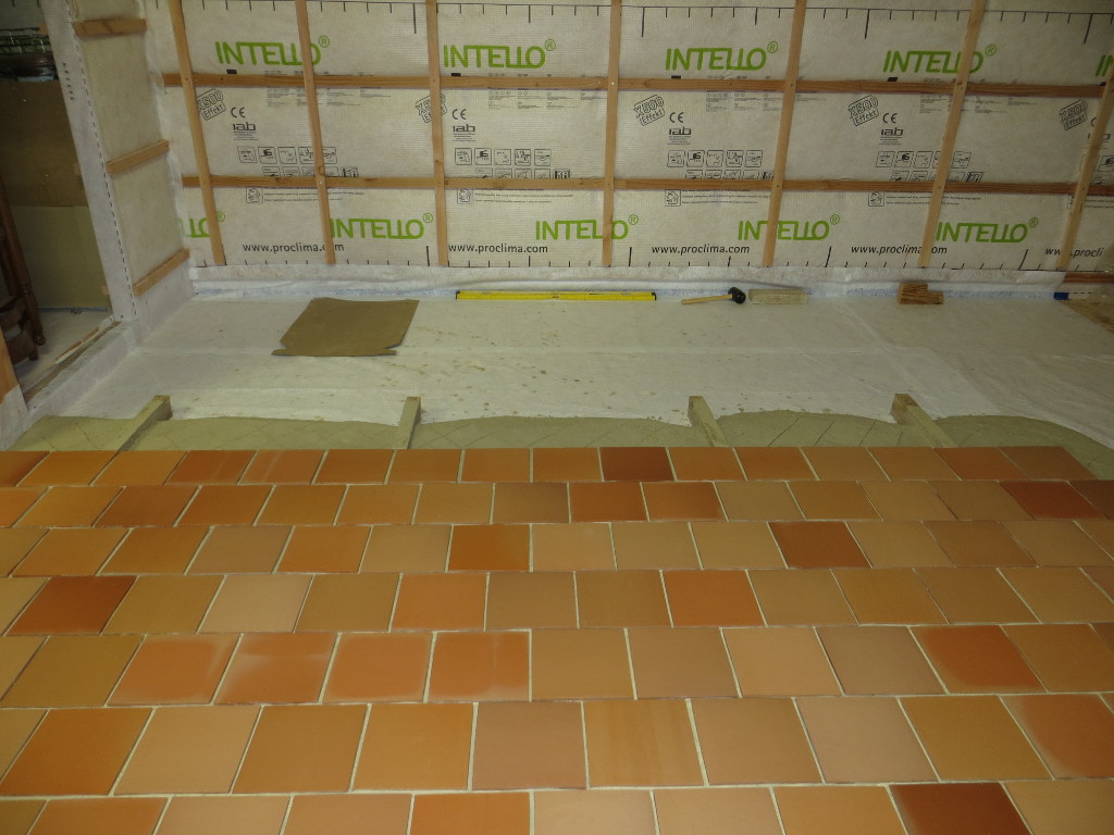 2013/11/07 : Sol - Grande salle - T2NMis à jour : 24 février 2016 | Imprimer | Affichages : 2148Pose de la chappe et des tomettes dans la grande salle (côté Nord de la travée n°2) : Avancée du travail :