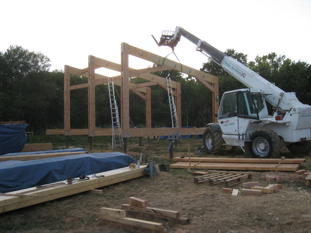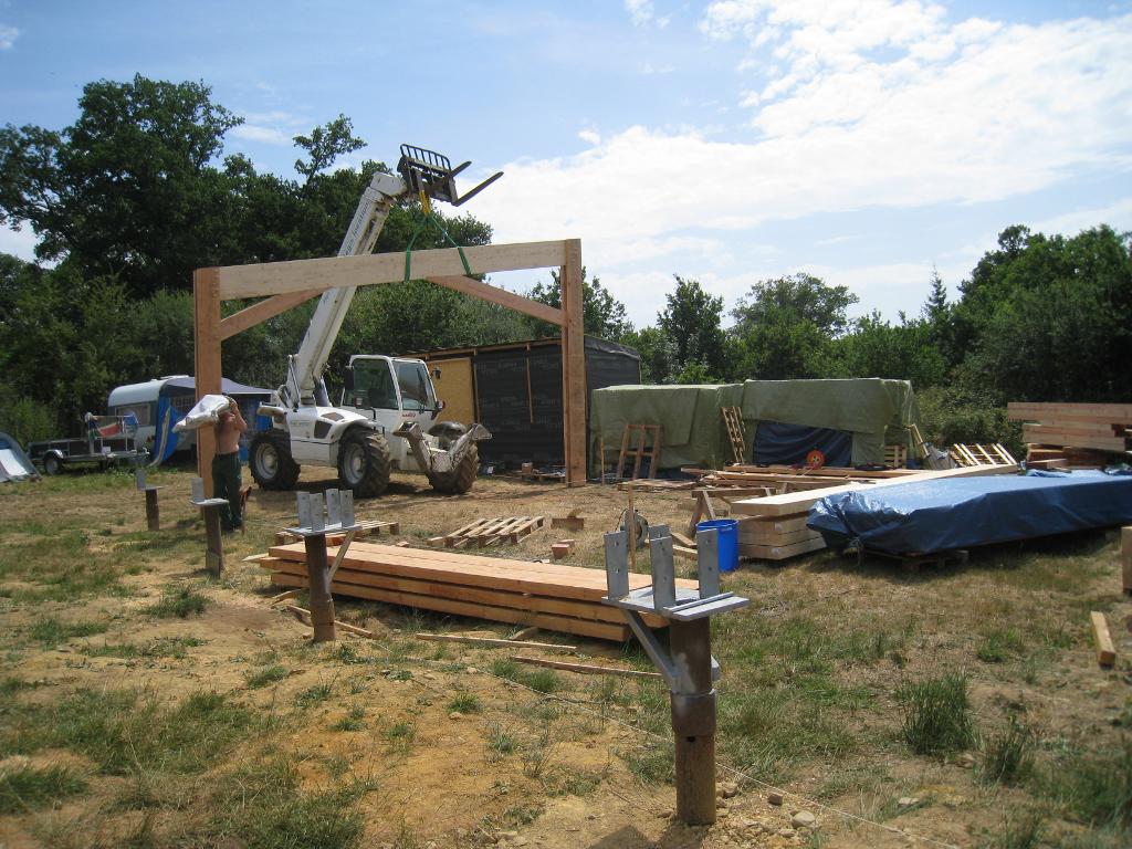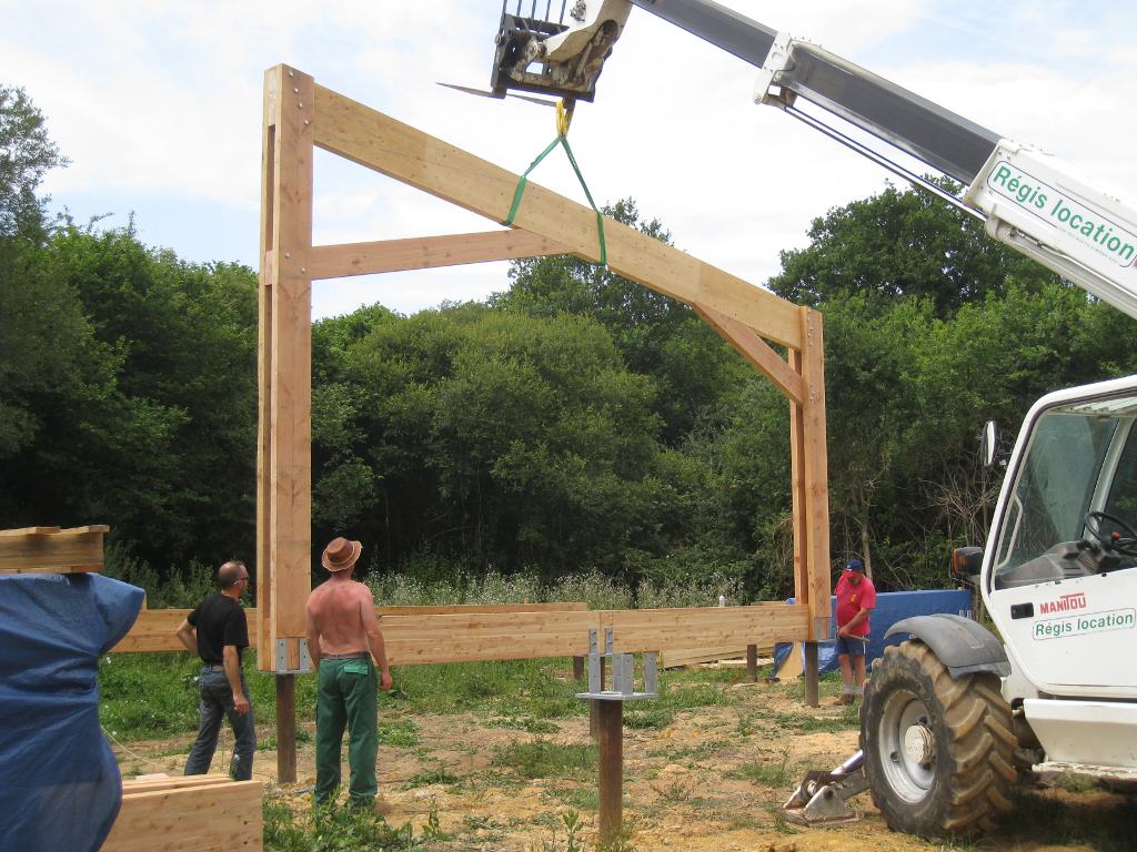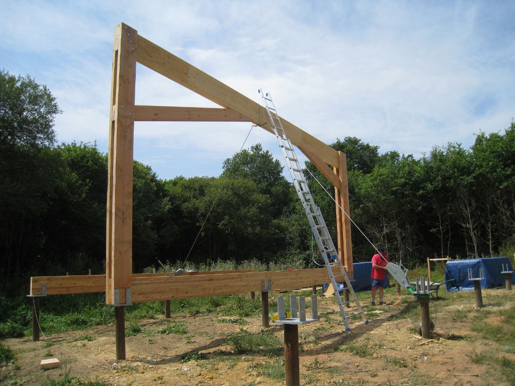 Le chantier continue avec la partie la plus délicate : le montage et la mise en place des cinq portiques (ou fermes) qui vont soutenir une grande partie de la maison.