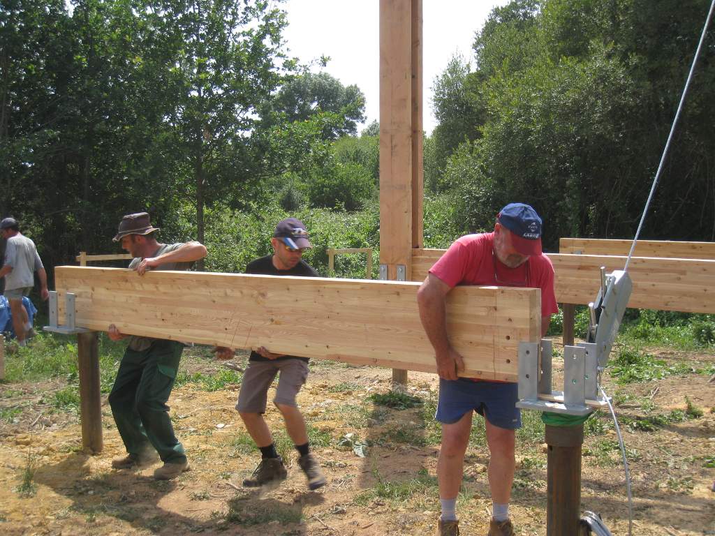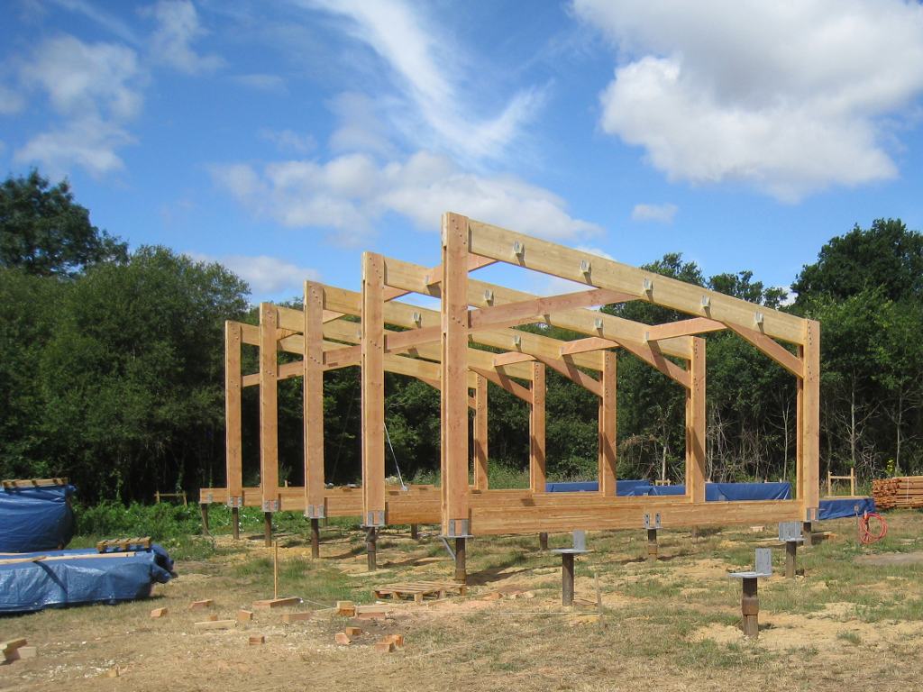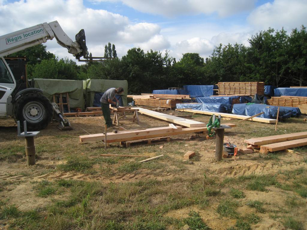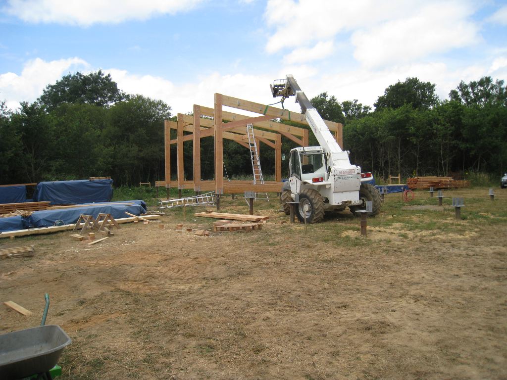 Le chantier continue avec la partie la plus délicate : le montage et la mise en place des cinq portiques (ou fermes) qui vont soutenir une grande partie de la maison.