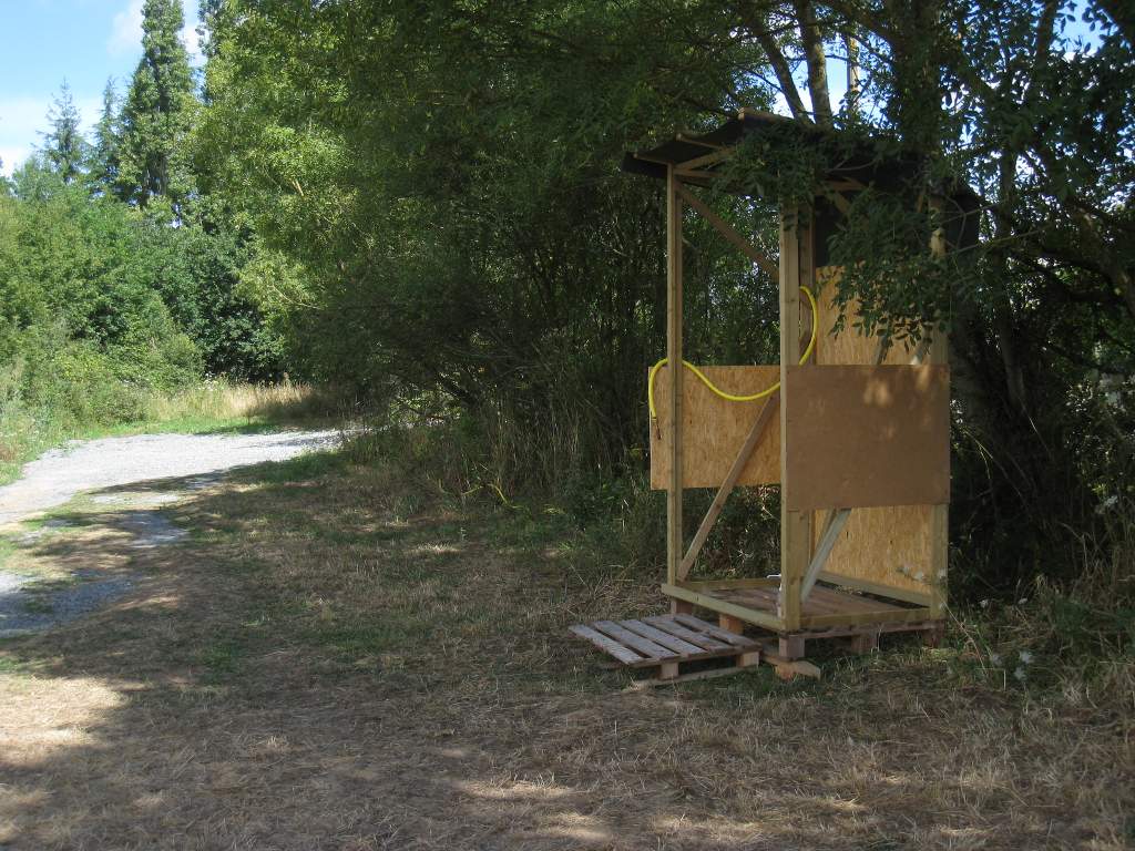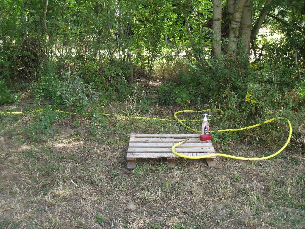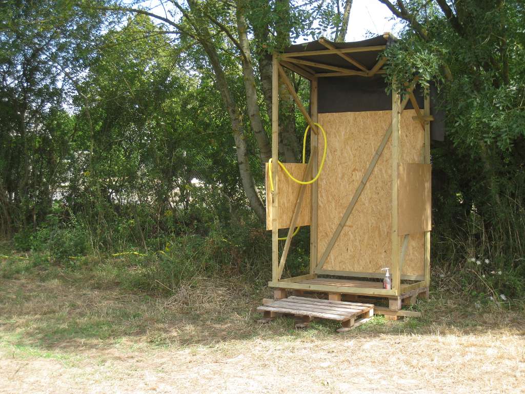 Pendant les trois premières semaines du chantier, j'étais en manque de palettes pour m'organiser mieux, et du coup la douche consistait principalement ... en l'extrémité du tuyau d'arrosage !