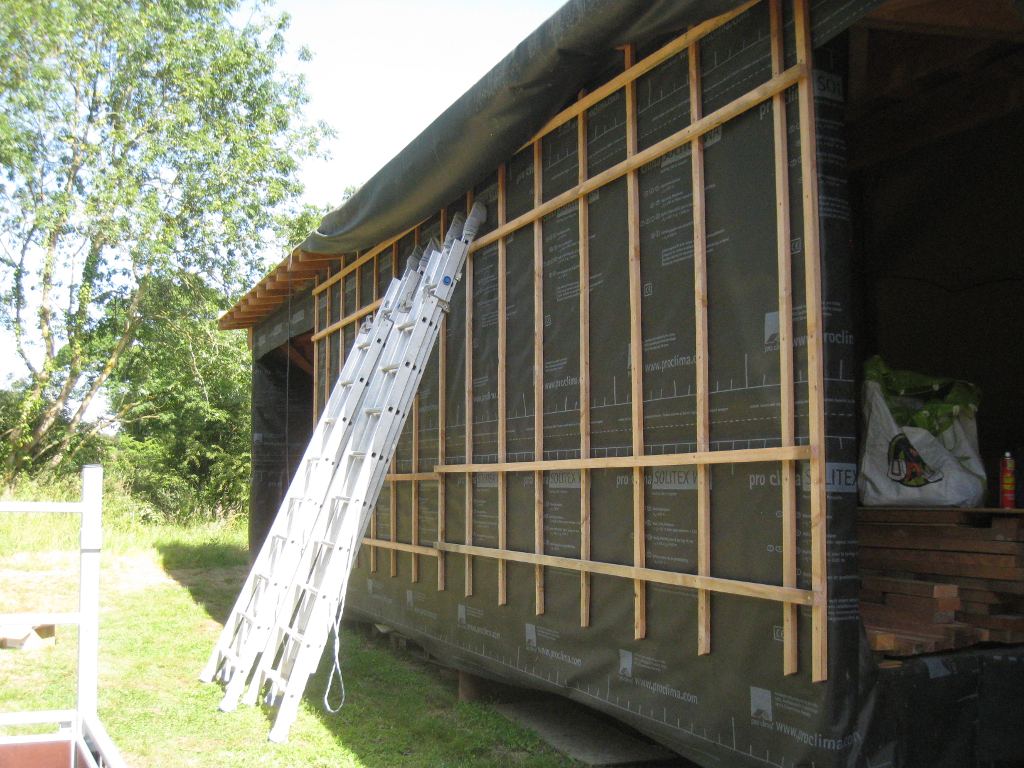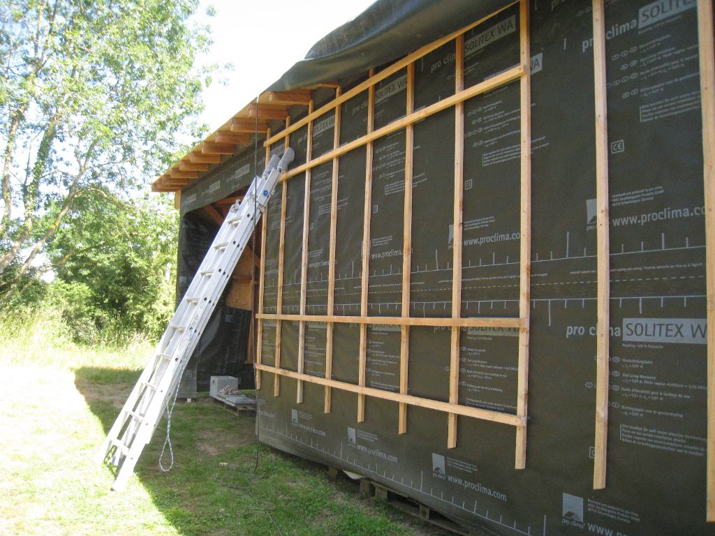 Il s'agit donc de positionner les trous d'évacuation, et poser le lattage horizontal (qui supportera le bardage) :