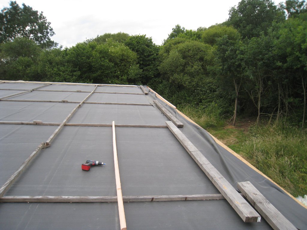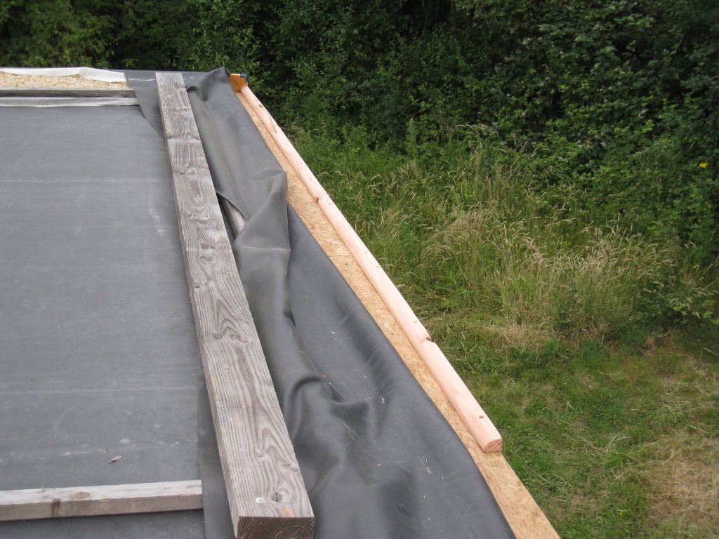 Mise en place des tasseaux de renfort (profilés pour ne pas agresser la bâche EPDM) en bas de la toiture :