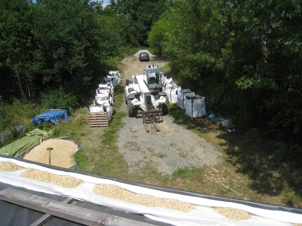 Petite vue aérienne sur les 3 m3 de gravier roulé destinés au lest de la bâche EPDM :