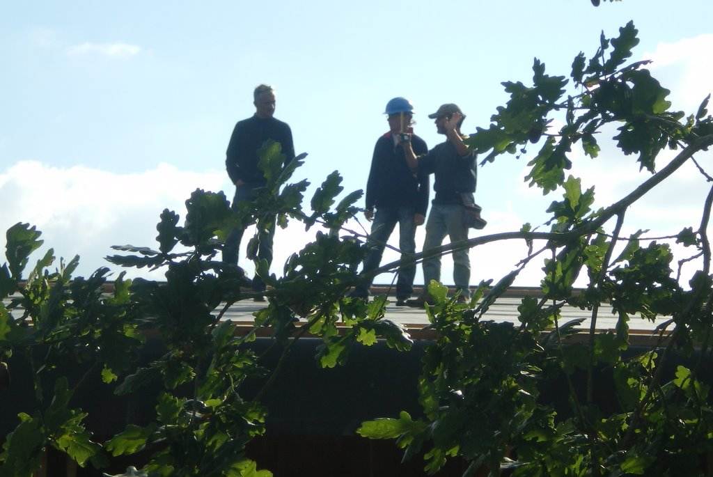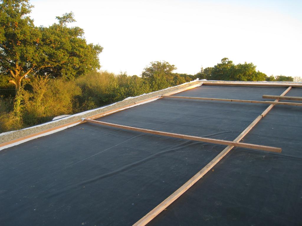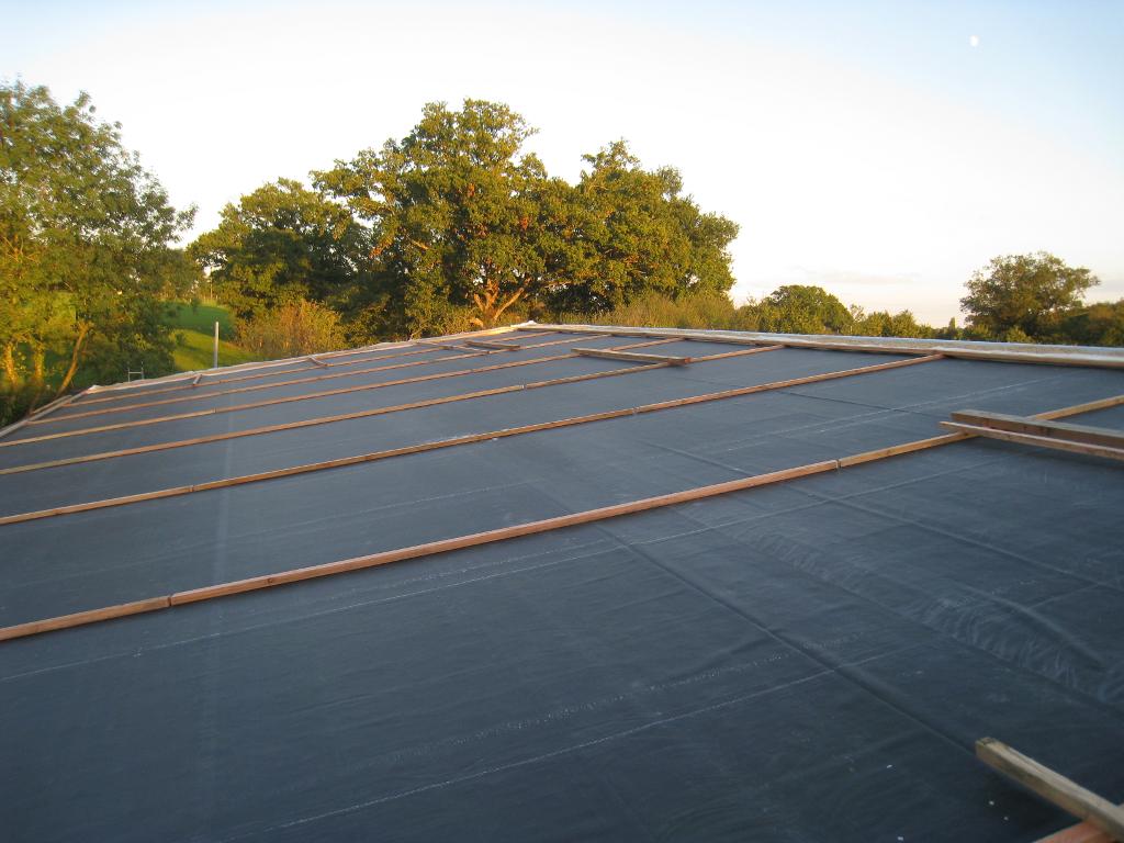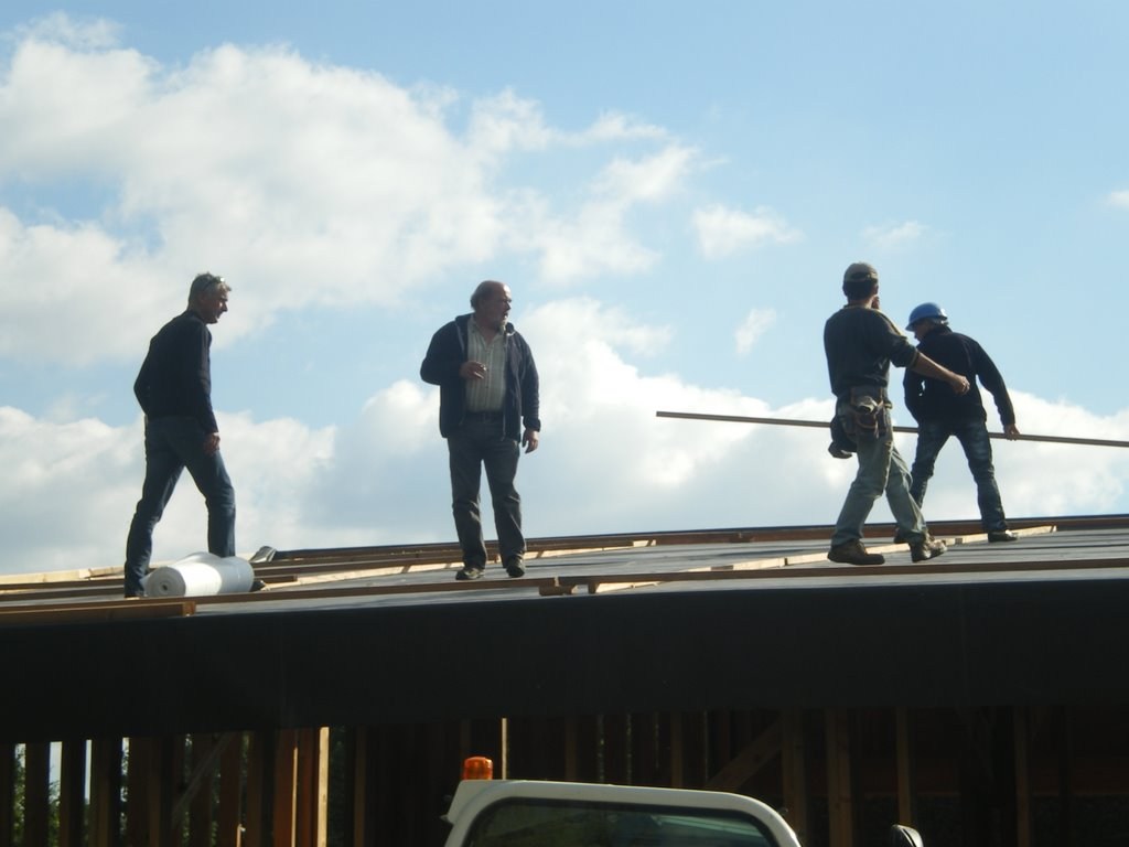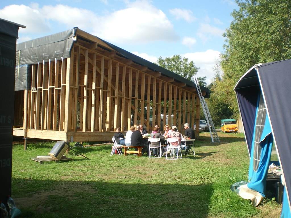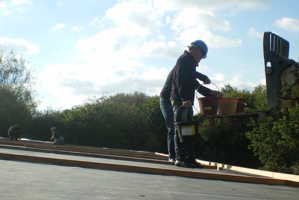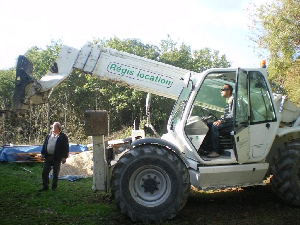Je profite honteusement de la visite d'une dizaine d'amis (et de la présence du téléscopique) pour hâter le lest de la bâche EPDM.