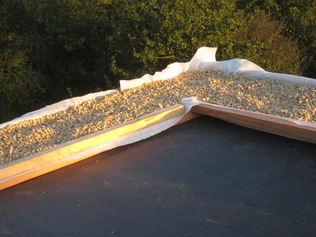Petite vue aérienne sur les 3 m3 de gravier roulé destinés au lest de la bâche EPDM :