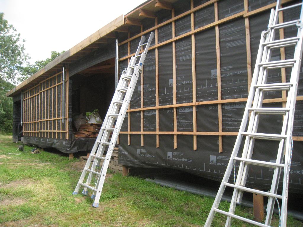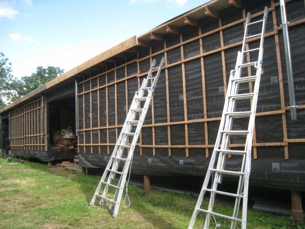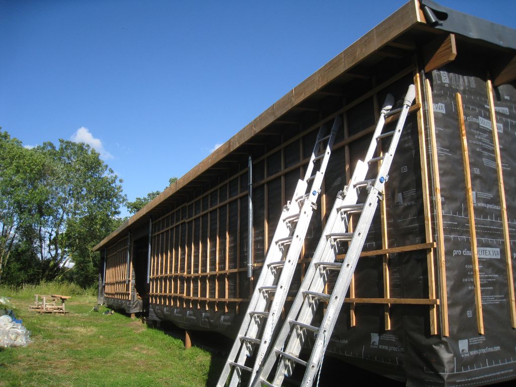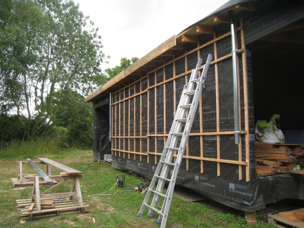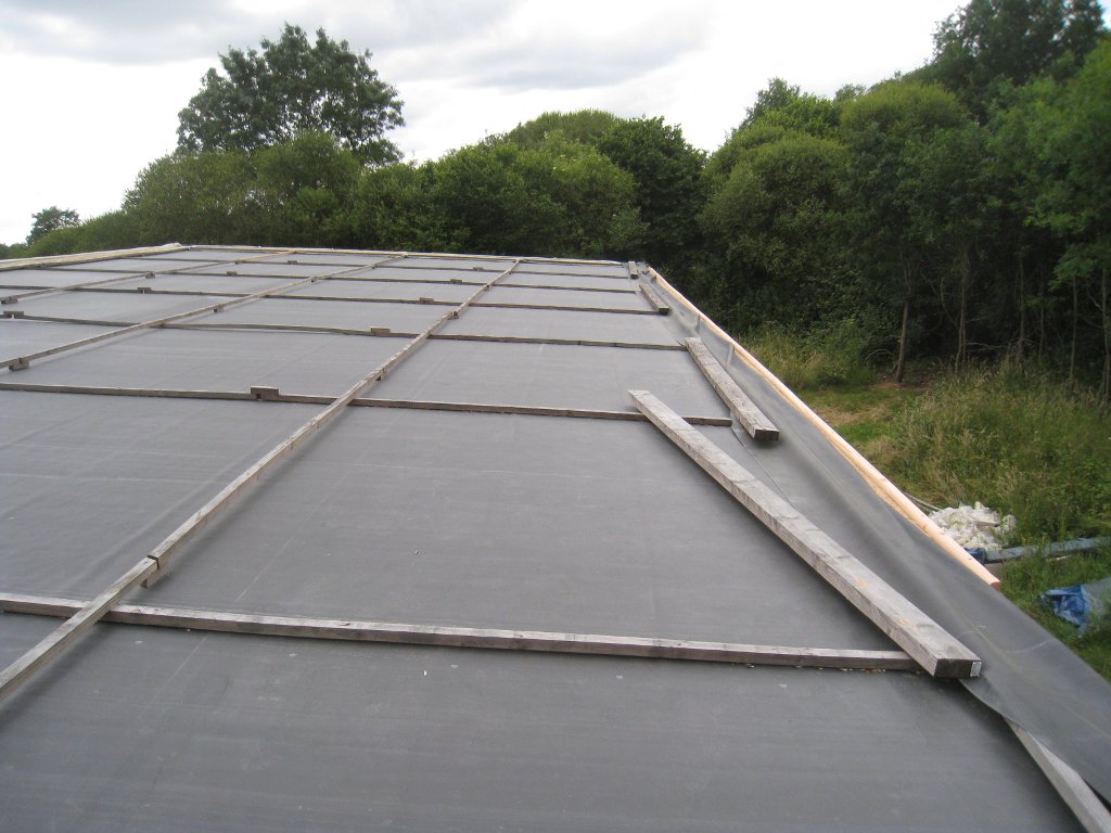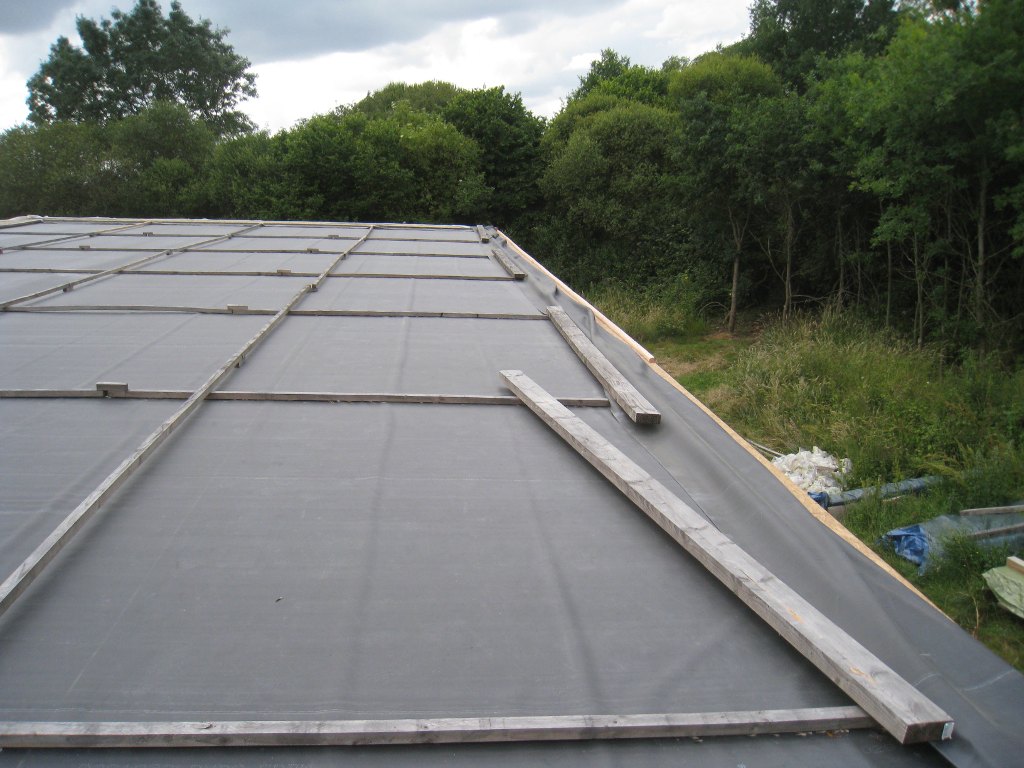 2011/06/12 : Toiture (9)Mis à jour : 24 février 2016 | Imprimer | Affichages : 2292Mise en place des tasseaux de renfort (profilés pour ne pas agresser la bâche EPDM) en bas de la toiture : Ces renforts participent à la fixation des rives : Précédent Suivant