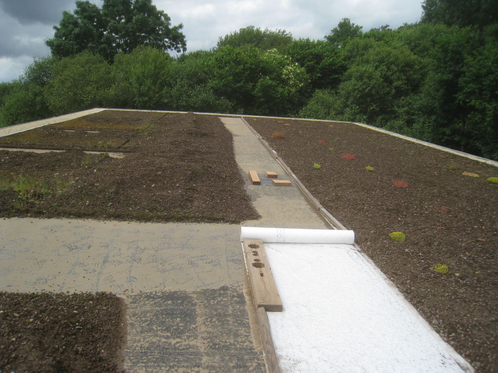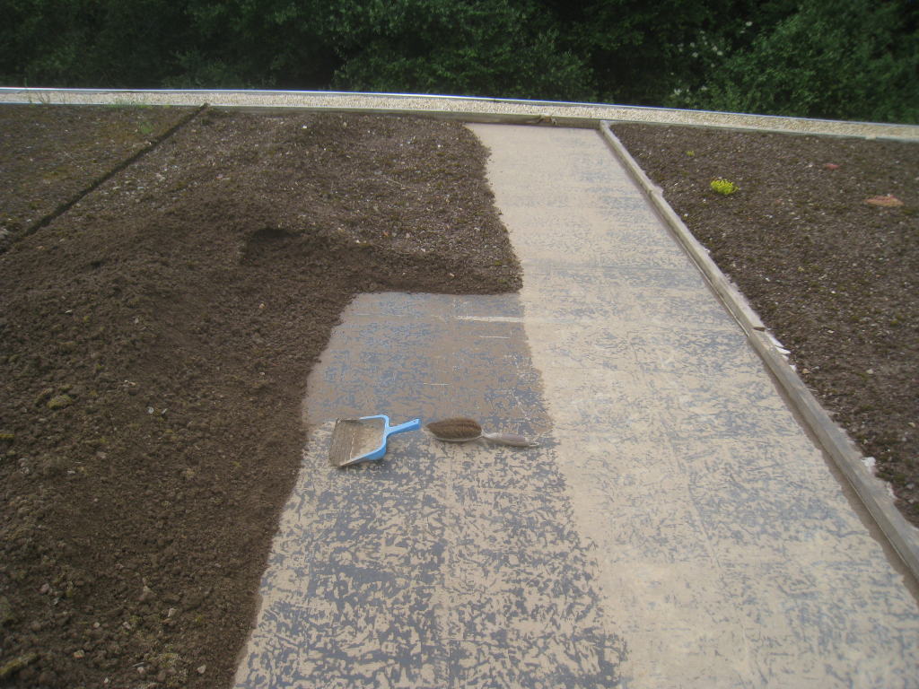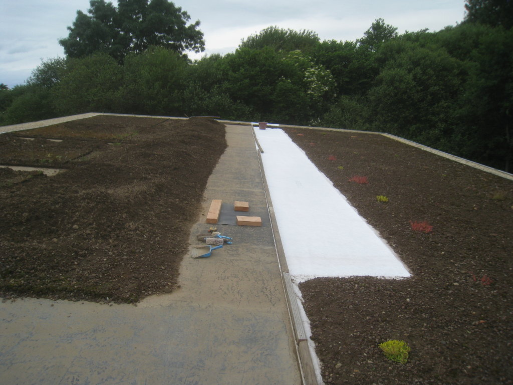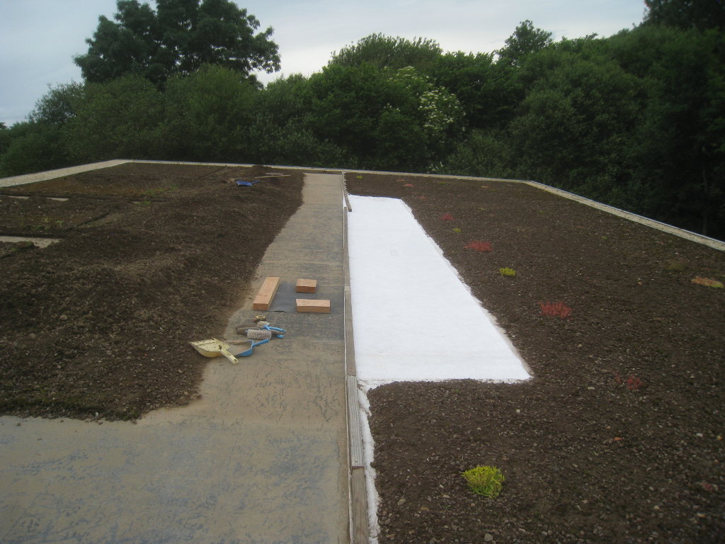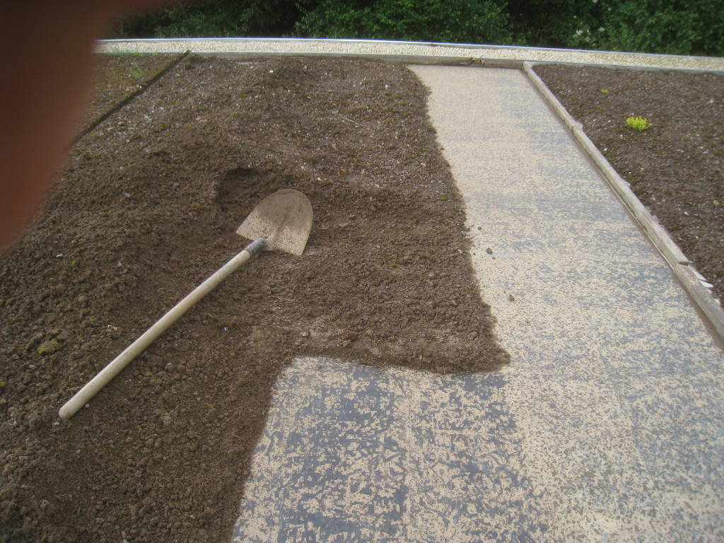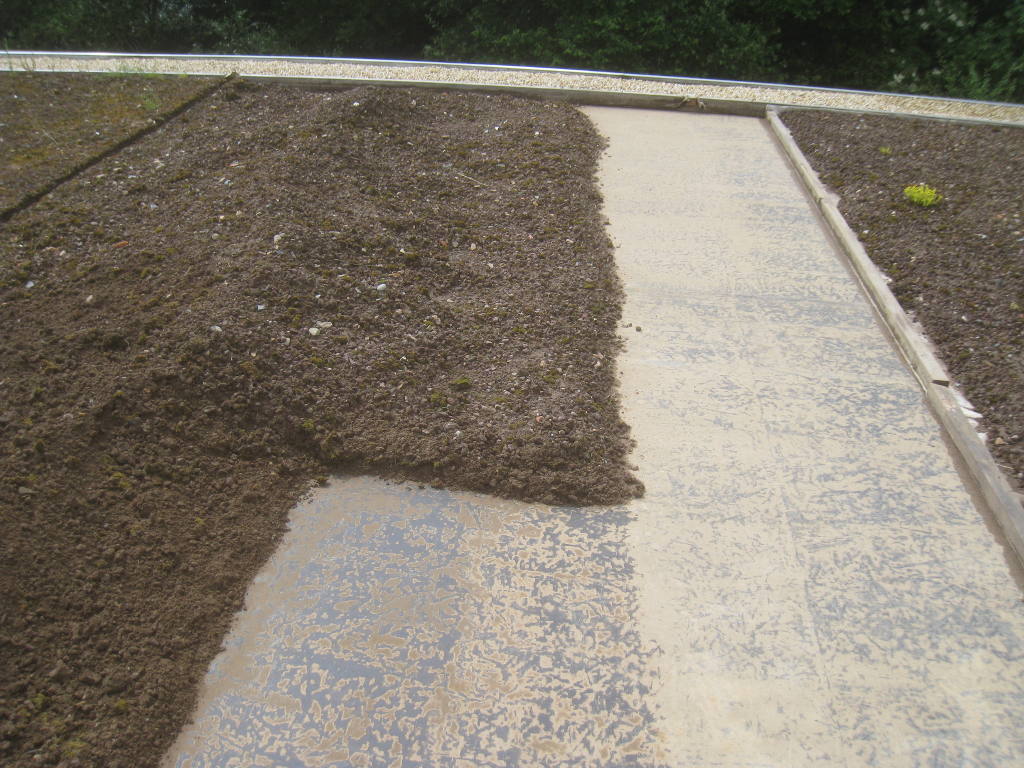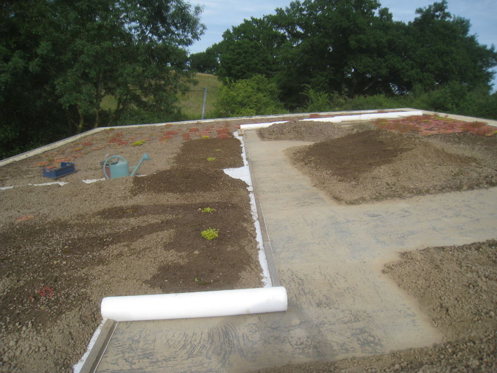 2013/06/30 : Toiture (20) : CorrectionMis à jour : 24 février 2016 | Imprimer | Affichages : 2014Suite de la pose du géotextile (rouleaux n°5 à n°7) : Du côté Est : Du côté Ouest : Détail du décapage de la bâche EPDM : Au moindre doute (impact ou autre) :